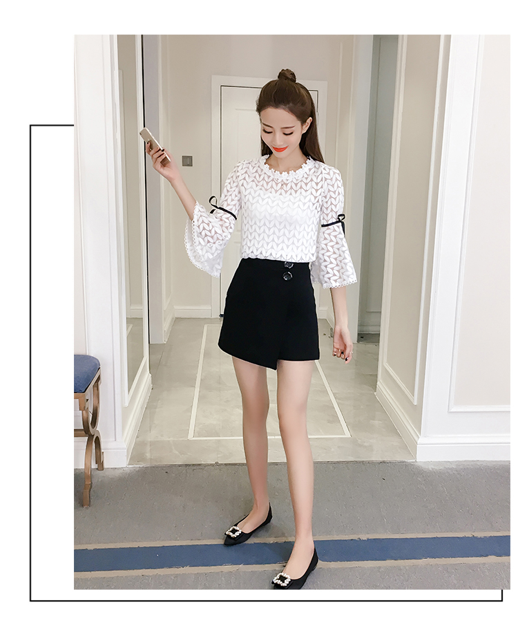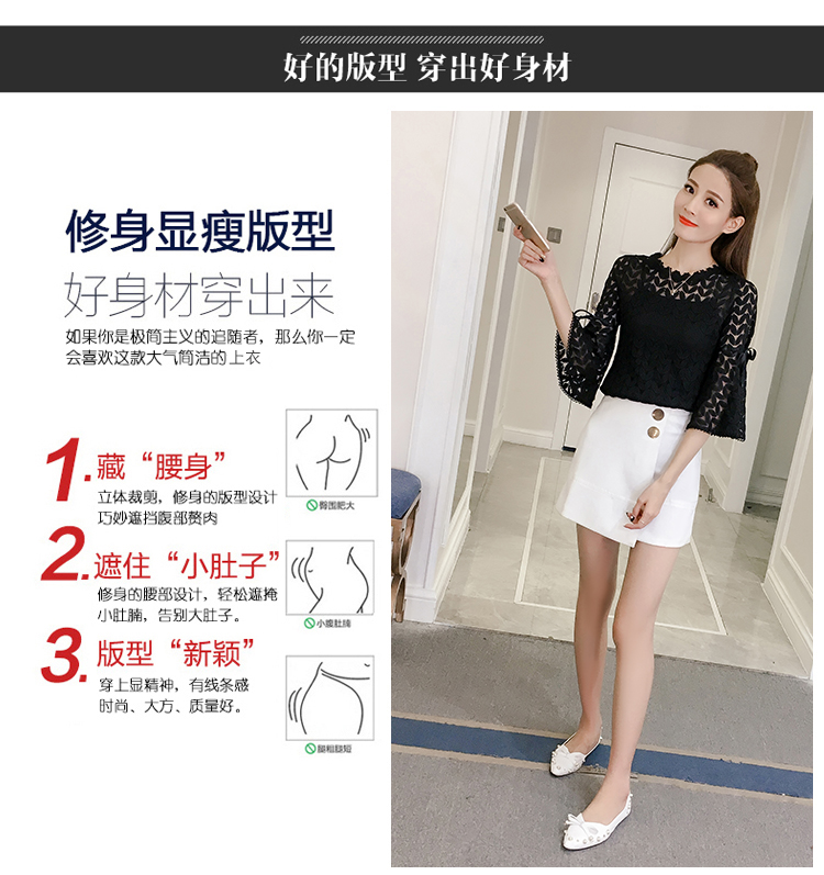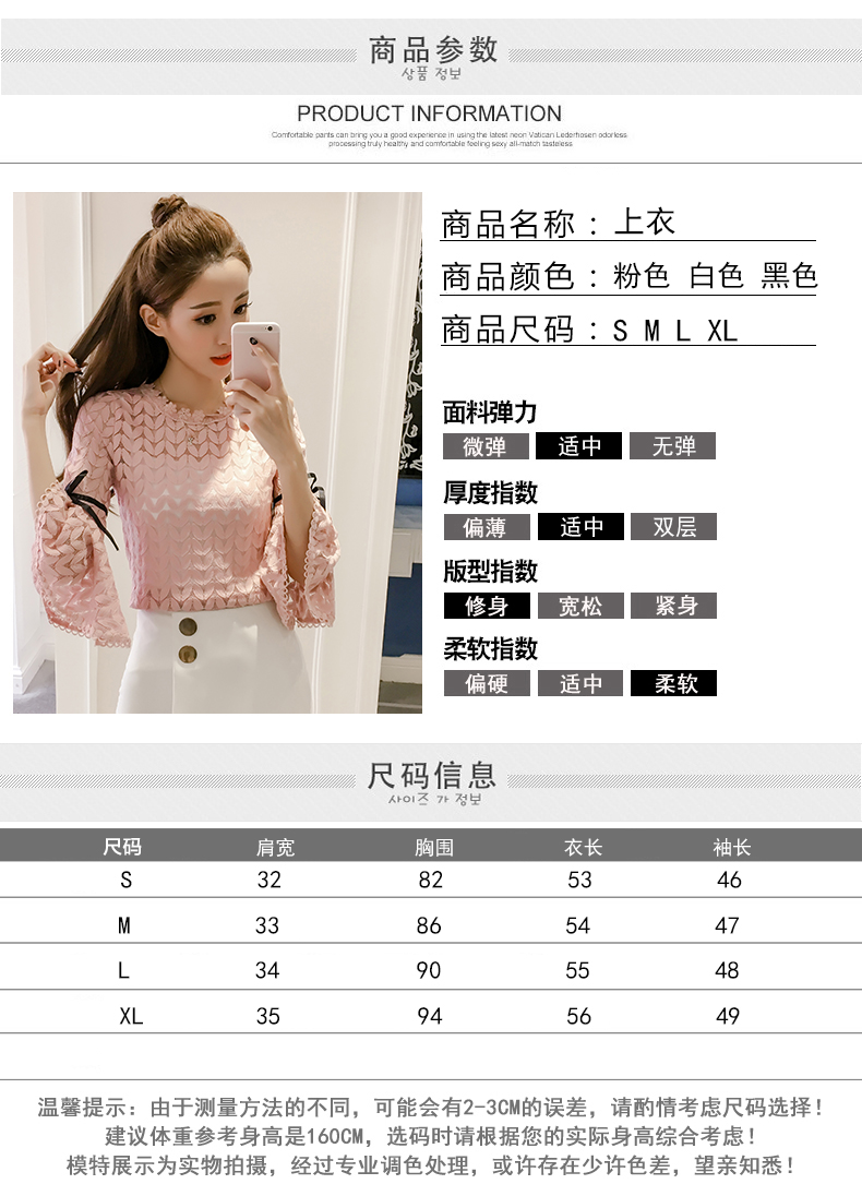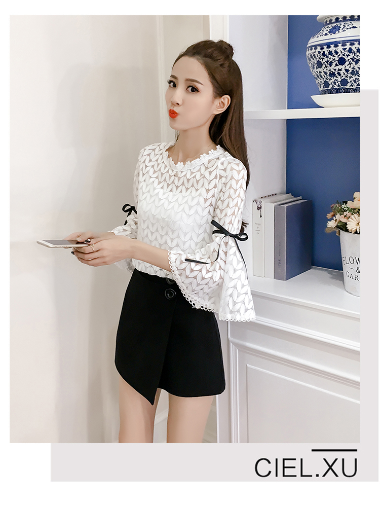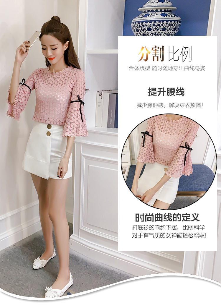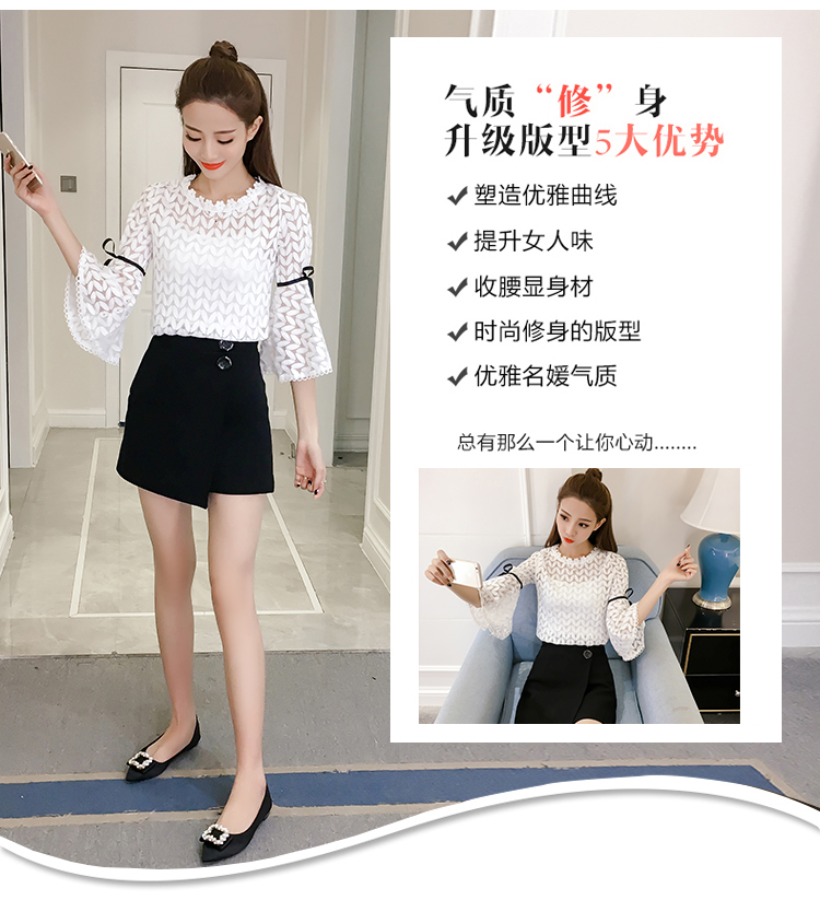2019秋裝新款韓版氣質七分袖雪紡衫鏤空蕾絲上衣女喇叭袖超仙小衫1入