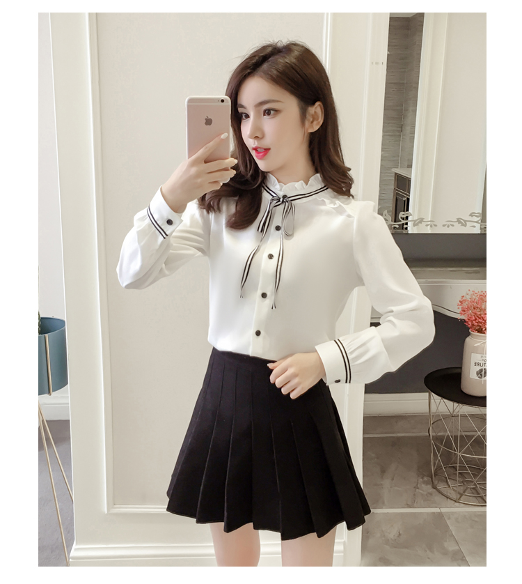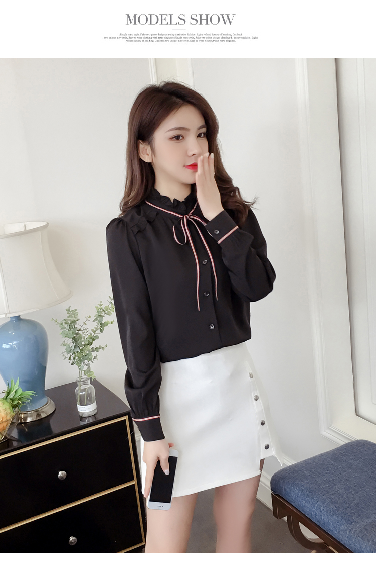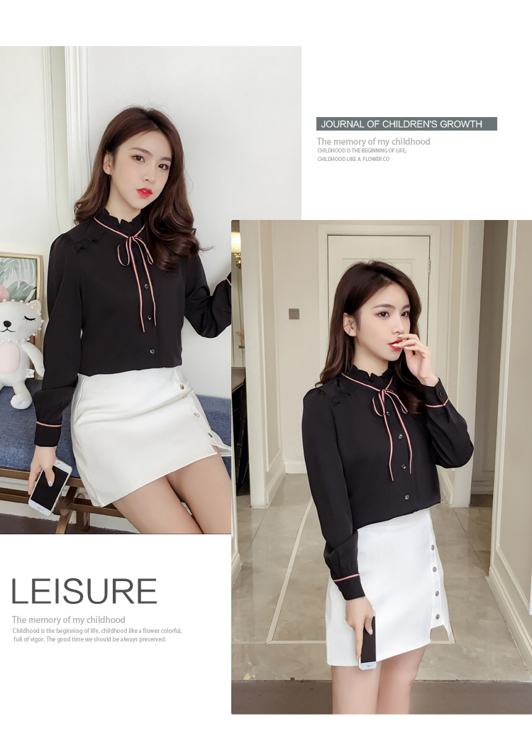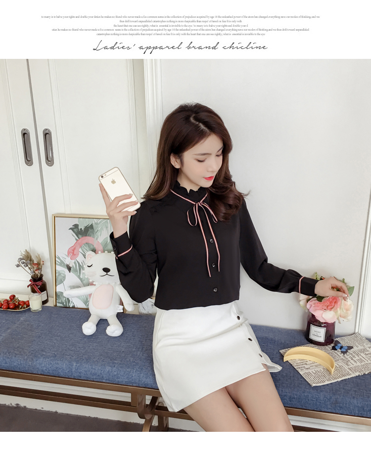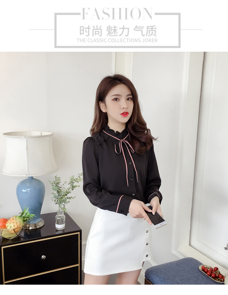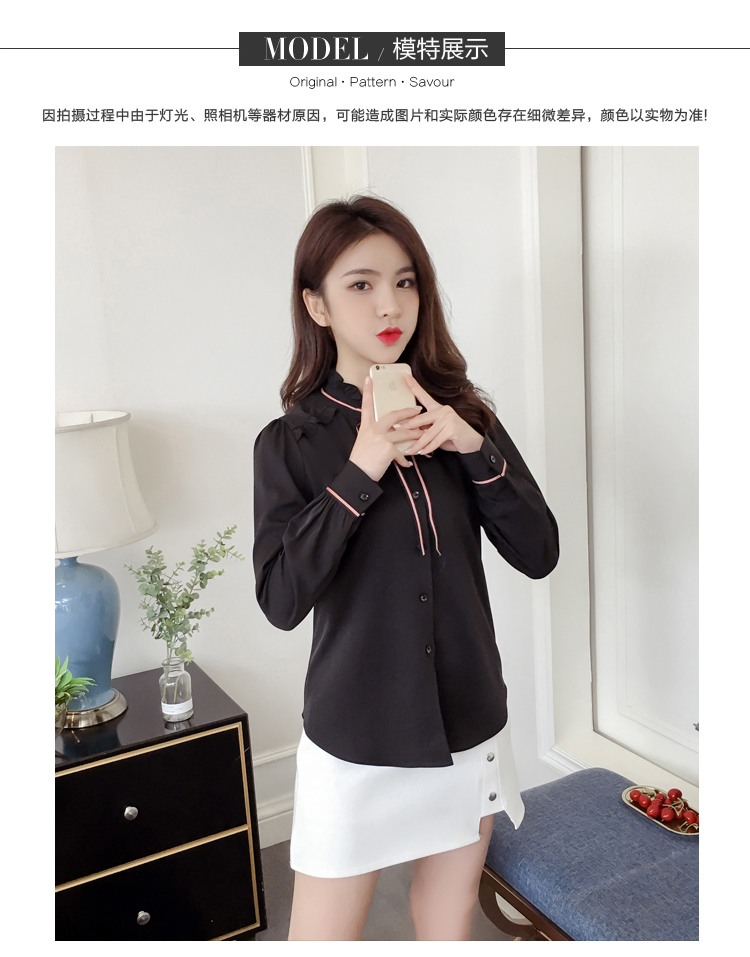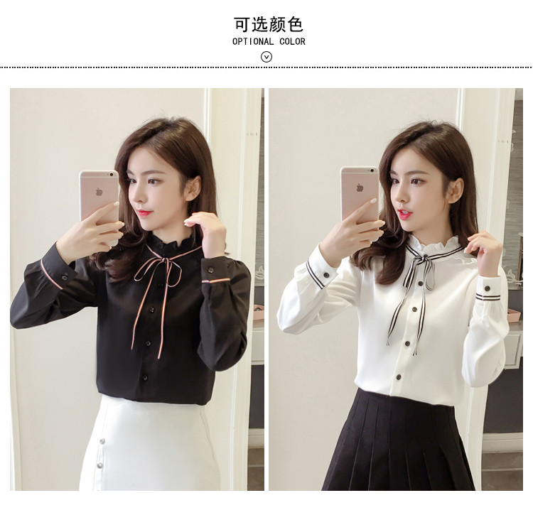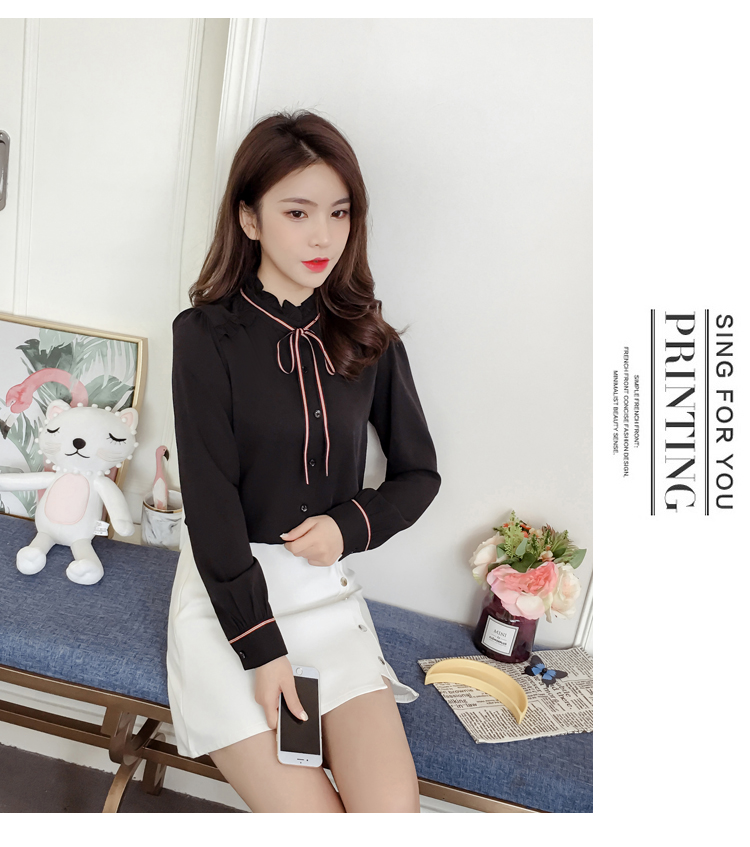 2019秋季新款時尚系帶蝴蝶結木耳邊立領襯衫女長袖洋氣顯瘦上衣潮1入