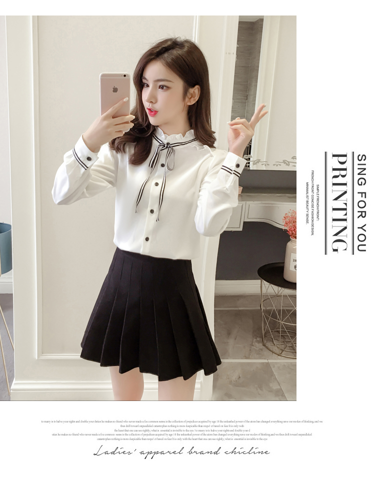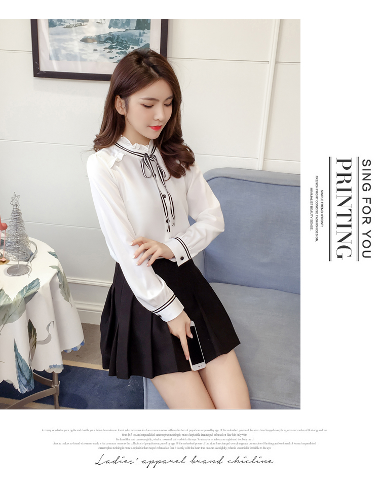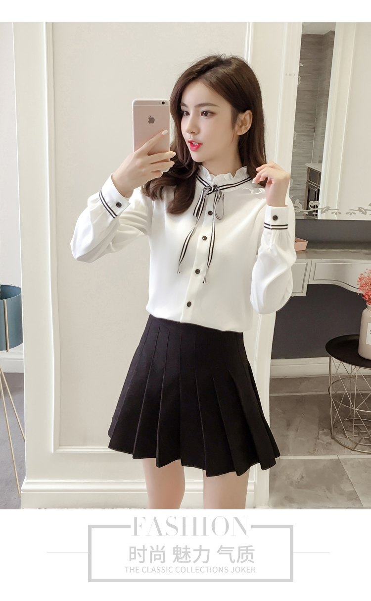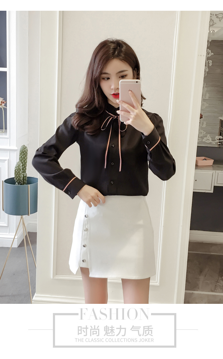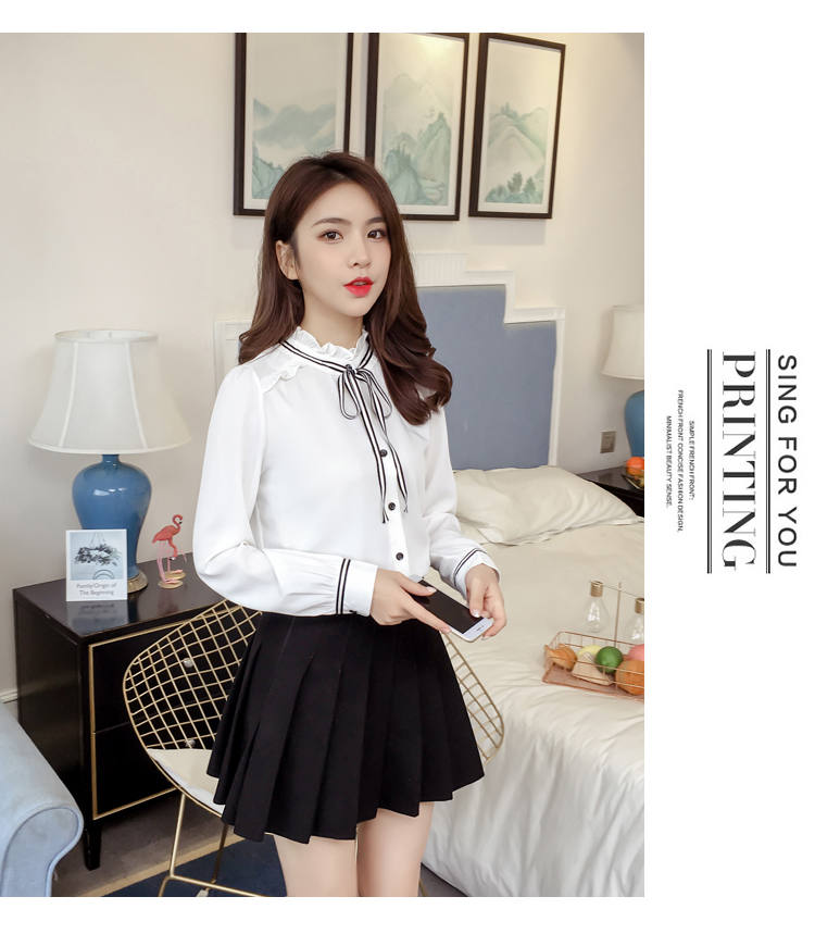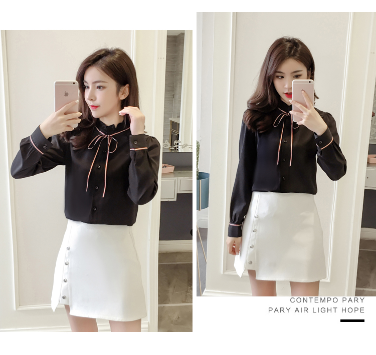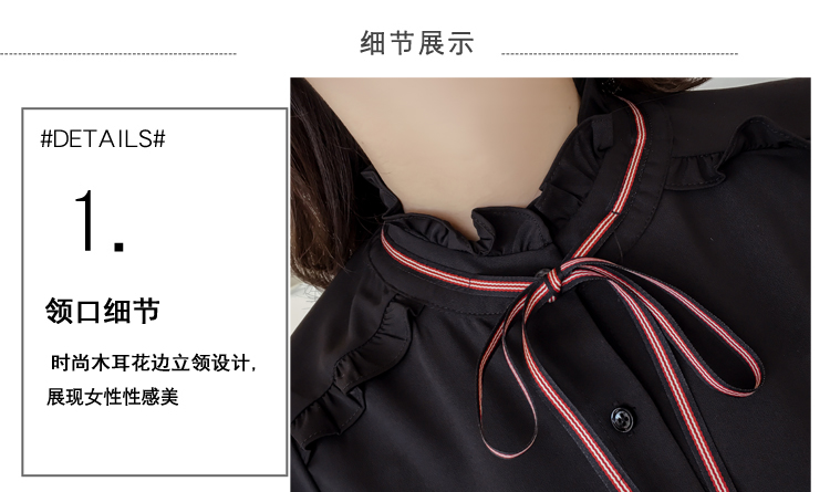 2019秋季新款時尚系帶蝴蝶結木耳邊立領襯衫女長袖洋氣顯瘦上衣潮1入