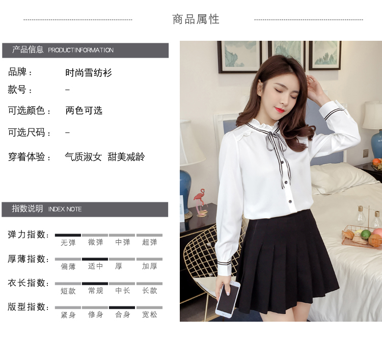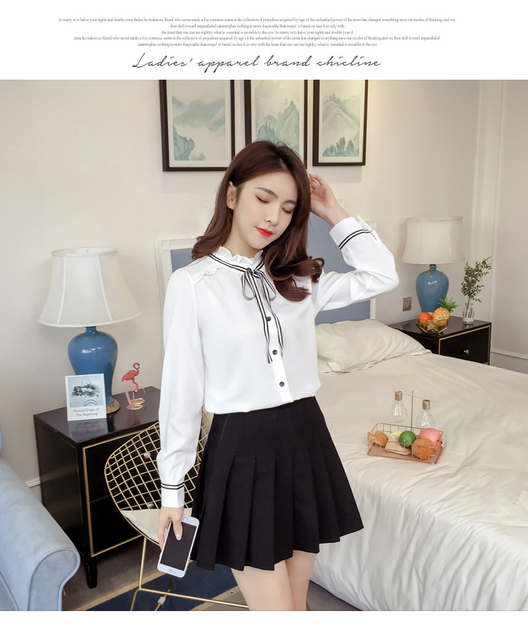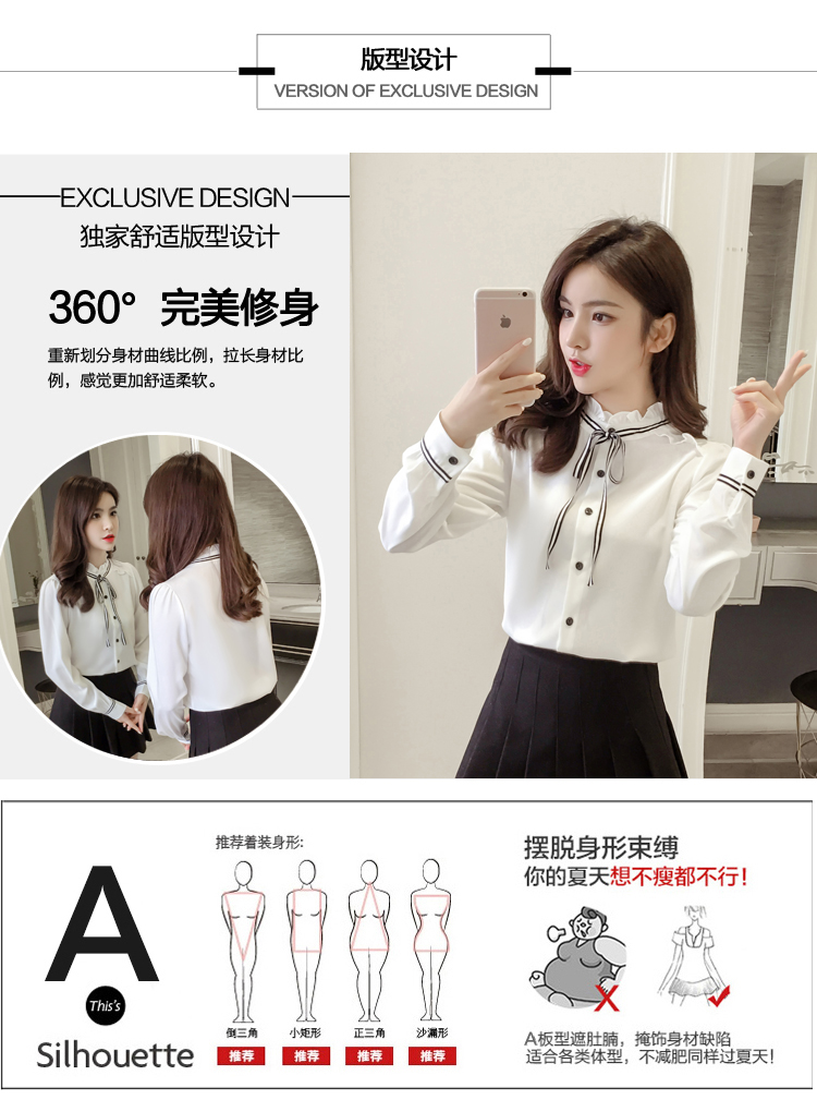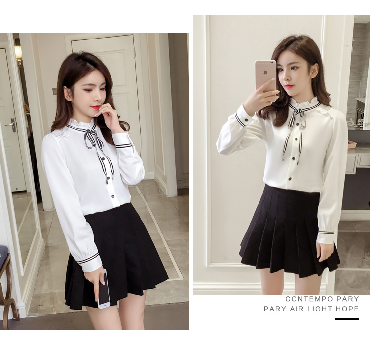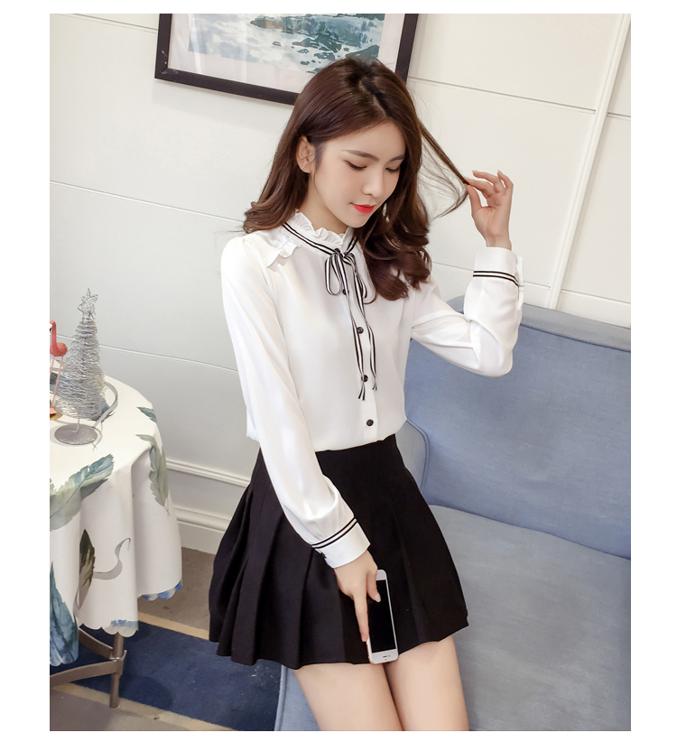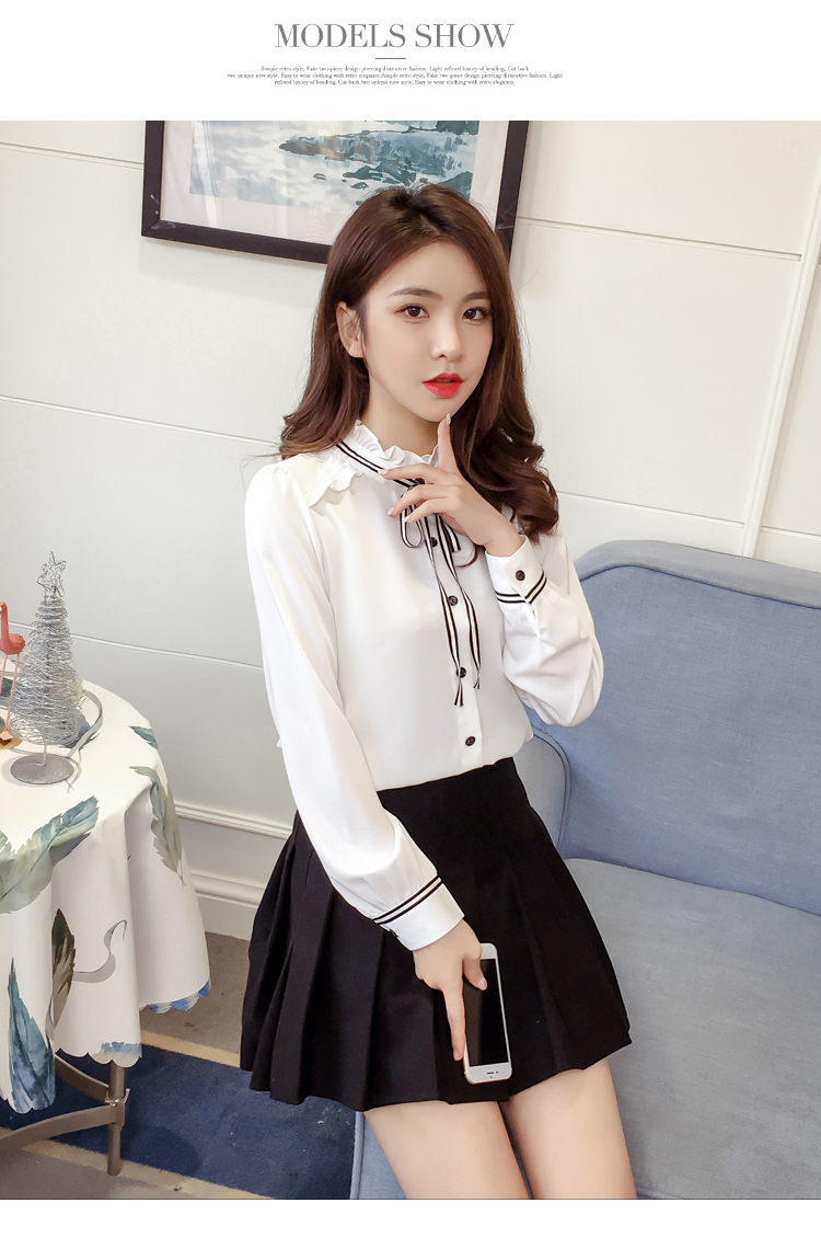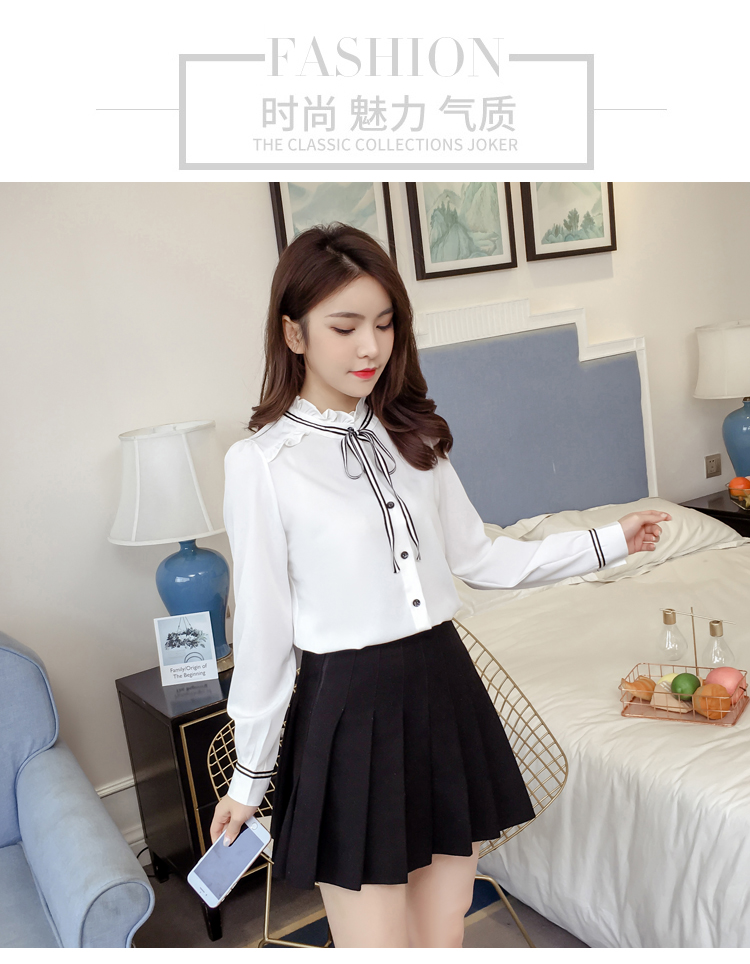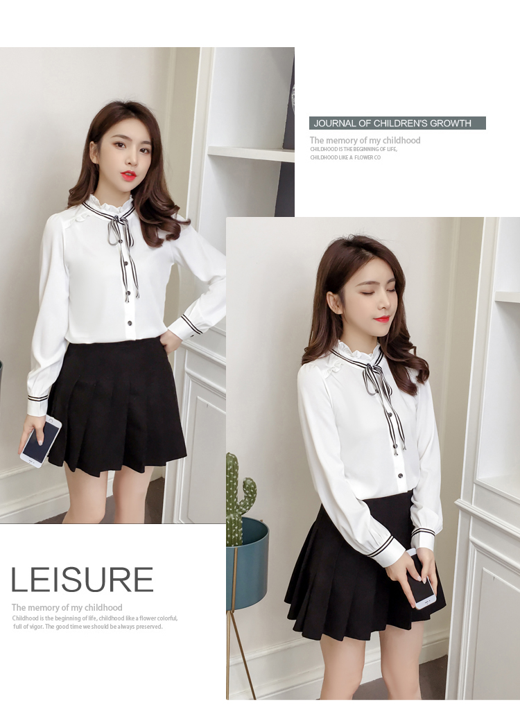 2019秋季新款時尚系帶蝴蝶結木耳邊立領襯衫女長袖洋氣顯瘦上衣潮1入