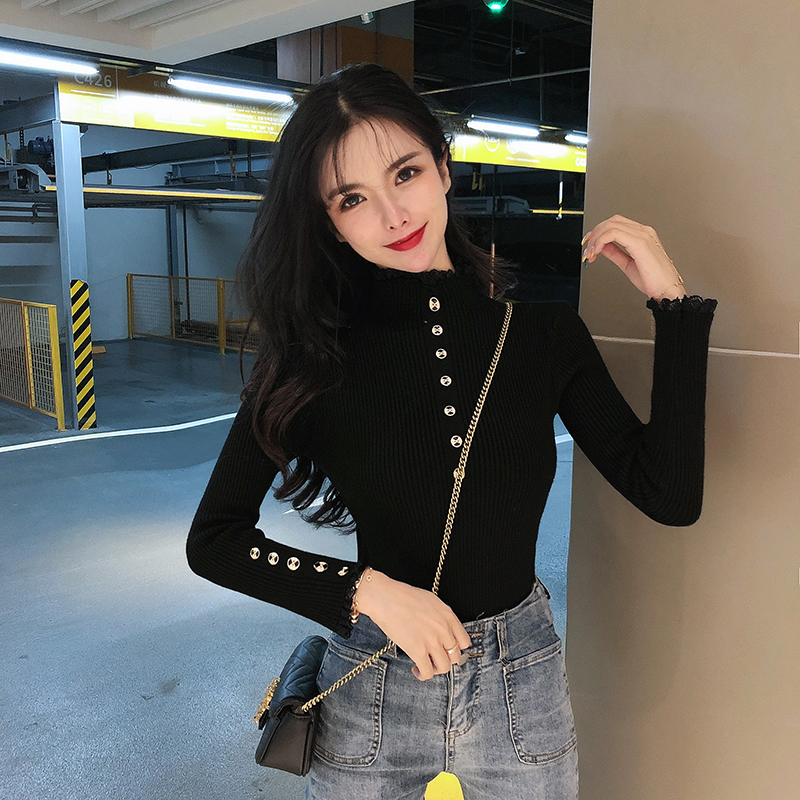 黑色打底衫女秋冬2019新款半高領長袖花邊修身顯瘦針織毛衣上衣潮1入