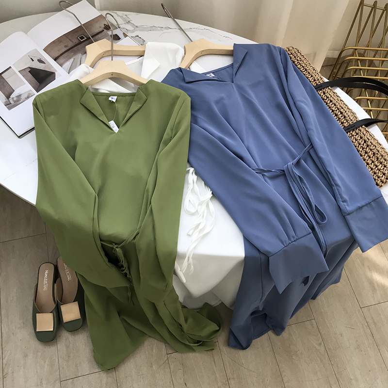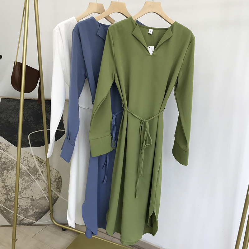 裙子女純色長袖系帶收腰顯瘦連衣裙學院風 J#11入