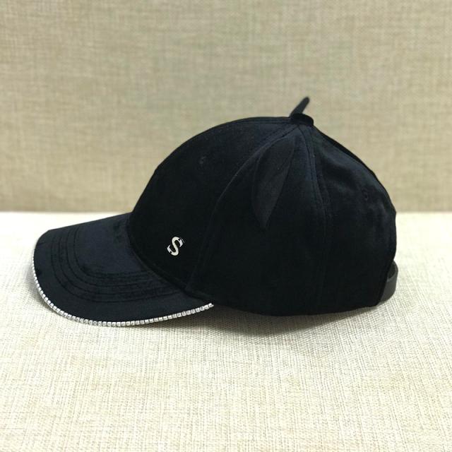 超萌可愛帽子女水鉆貓耳朵棒球帽潮秋冬天鵝絨百搭休閑黑色鴨舌帽1入