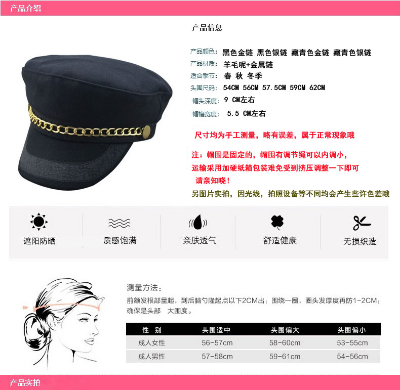 這款帽子叫"水手帽".也可叫海軍帽。是俏皮甜美或者偶爾中型帥氣的。三種裝飾風格,鏈條率性滿滿簡潔雅致。鏈條采用合金材質,經久耐用不掉色哦!