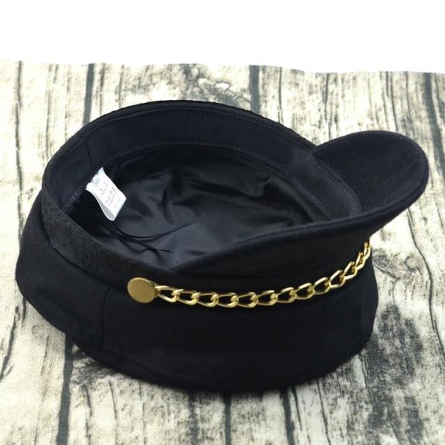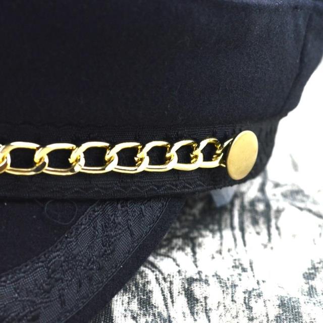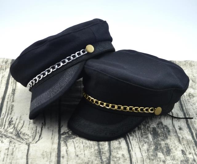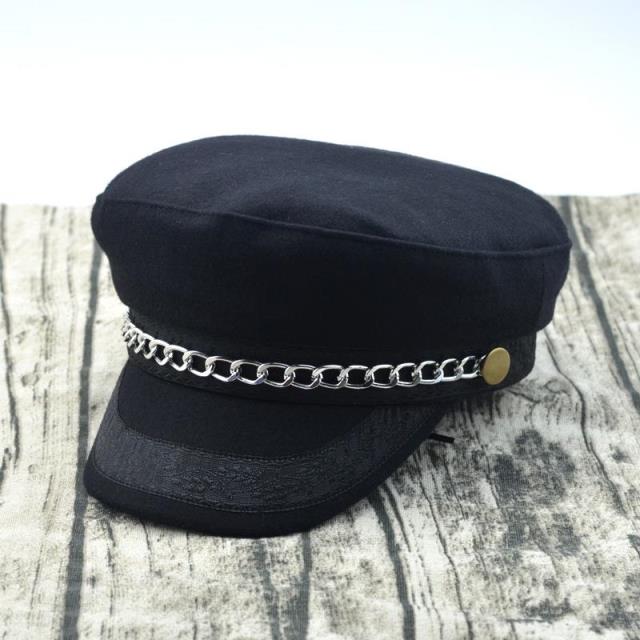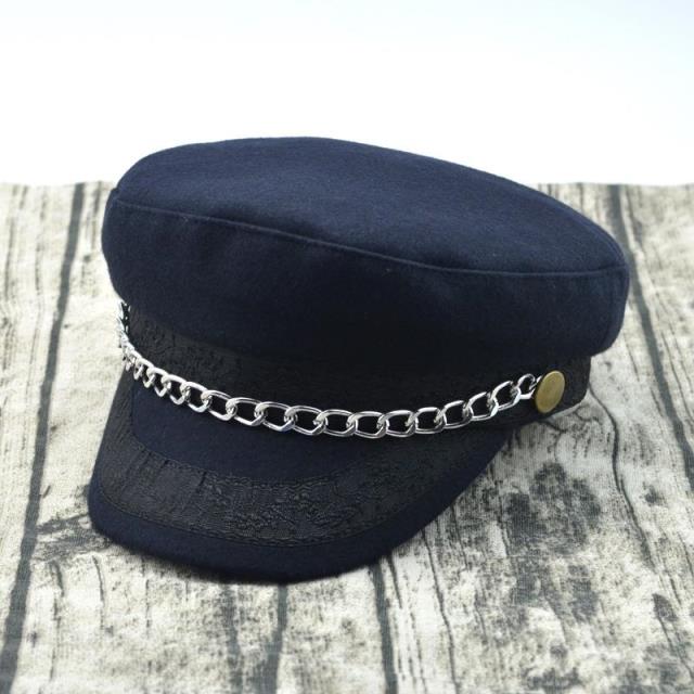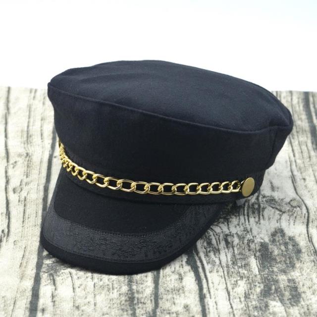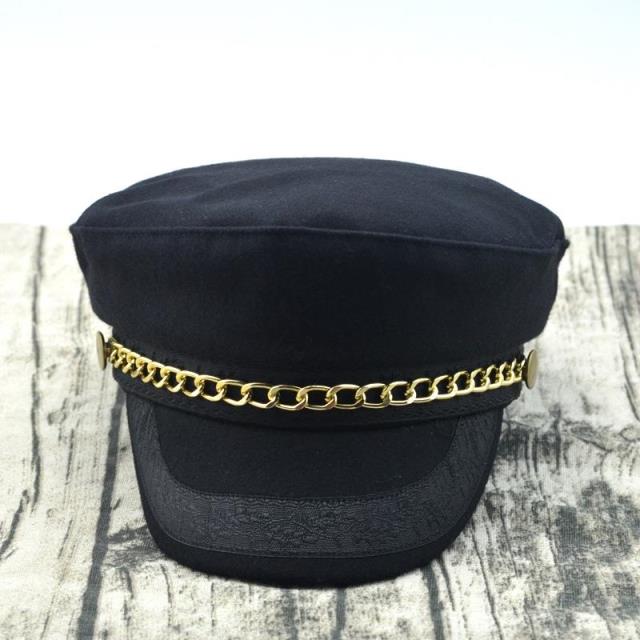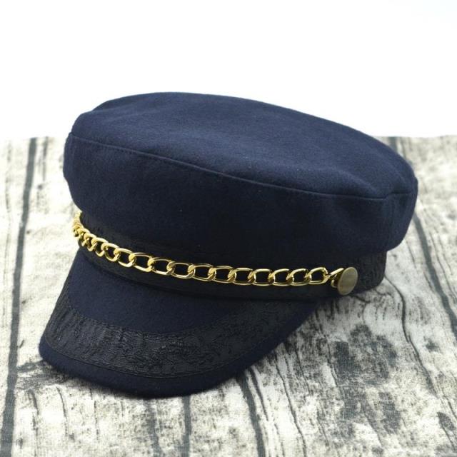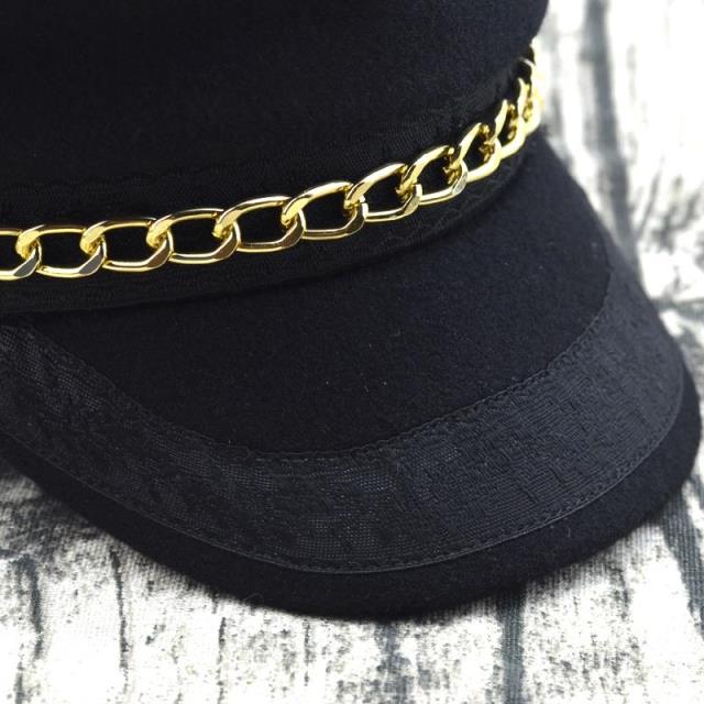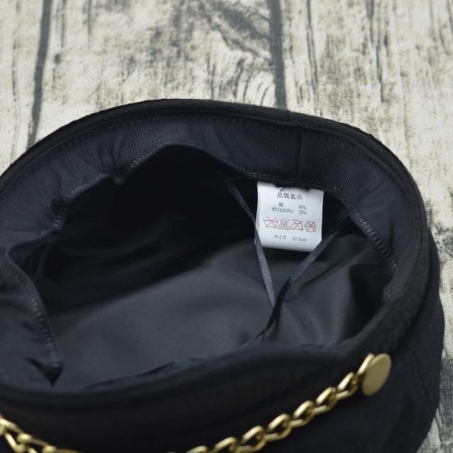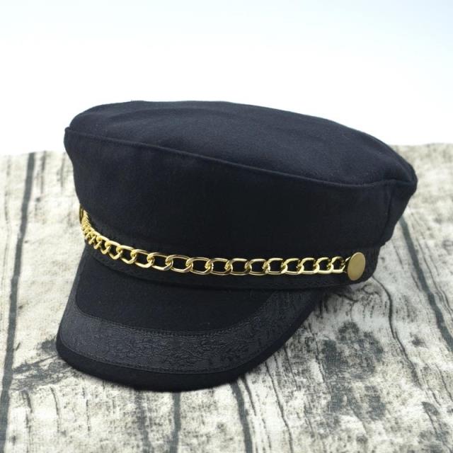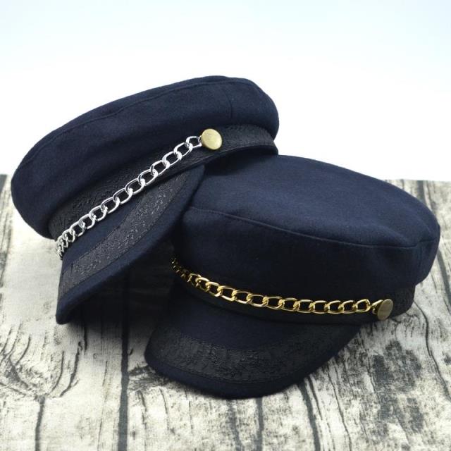 輕奢時尚百搭羊毛呢海軍帽金色鏈條帽子女冬天韓版潮船長帽平頂帽1入