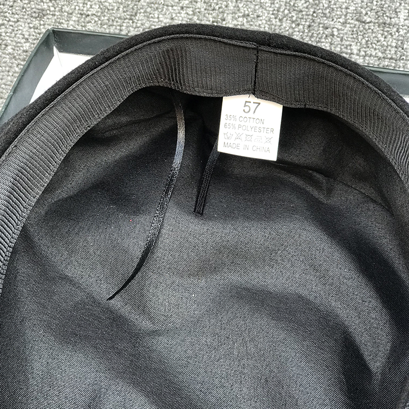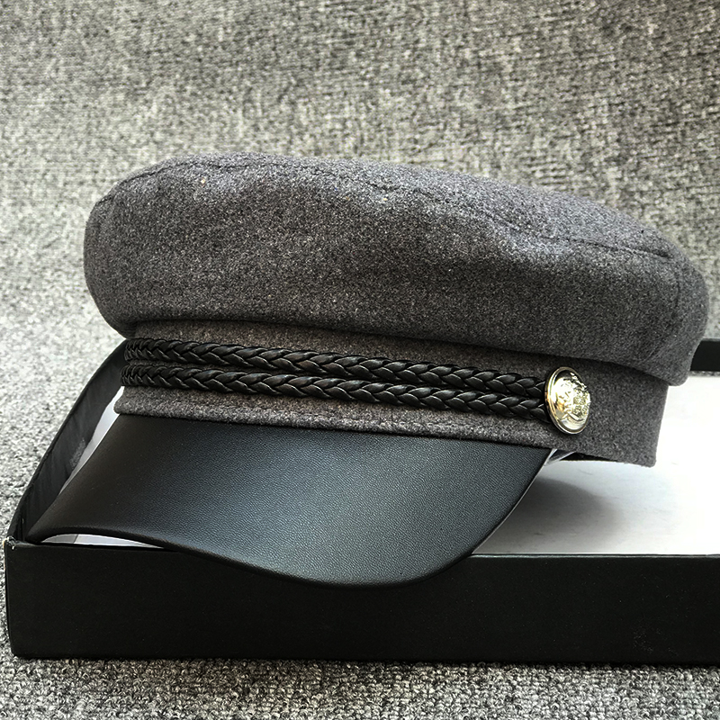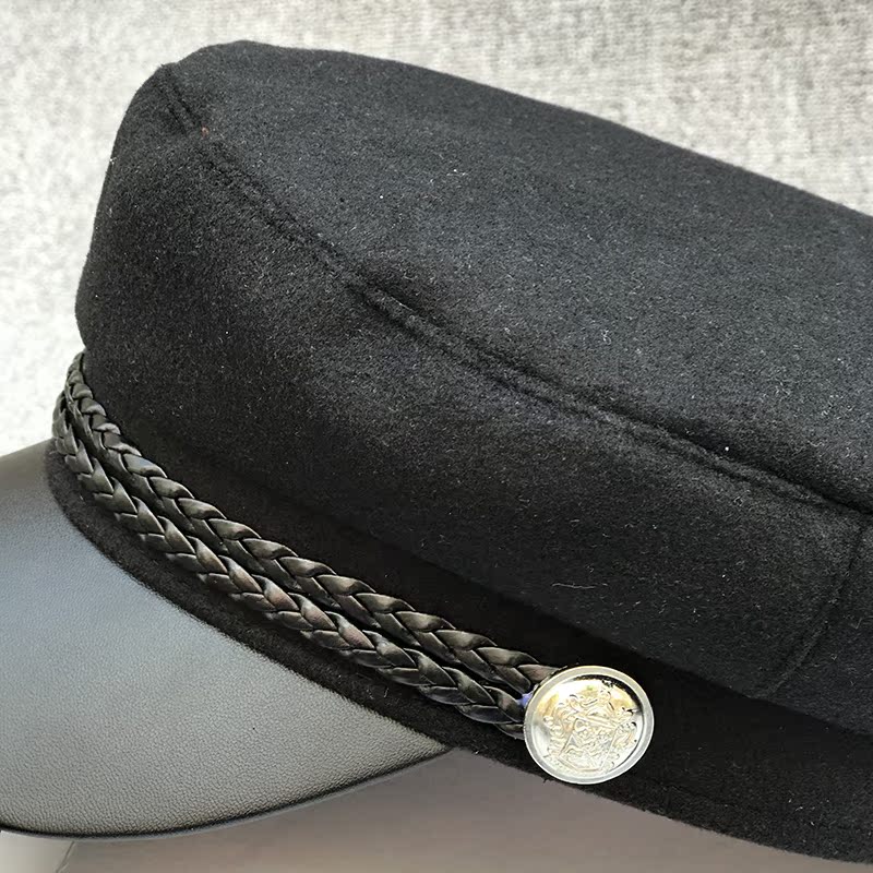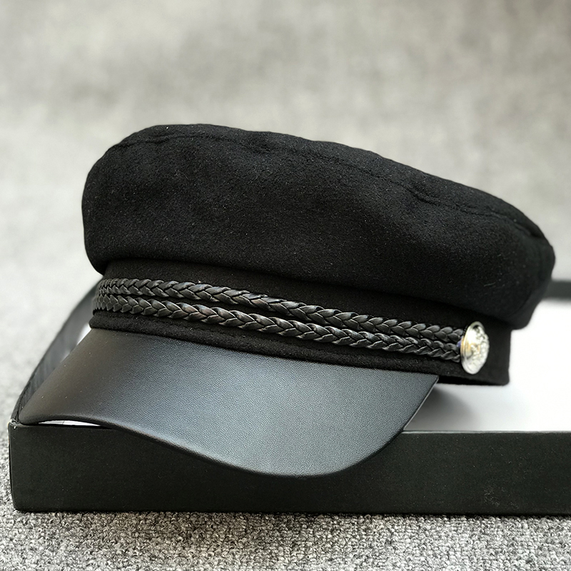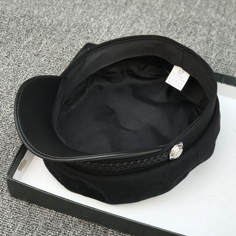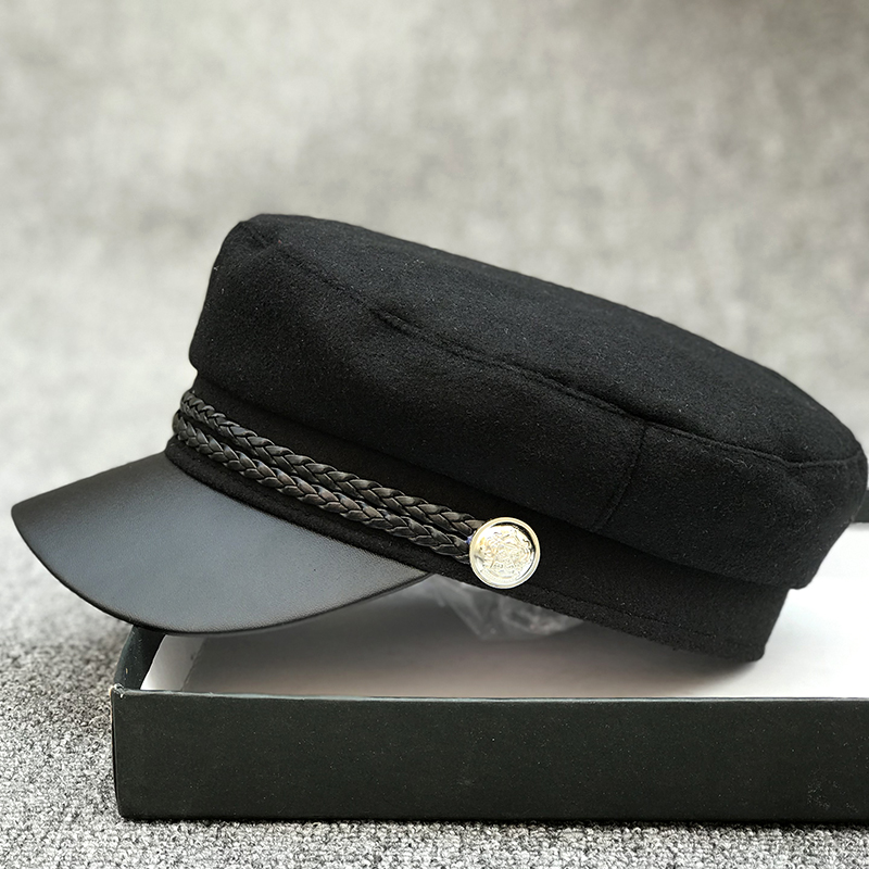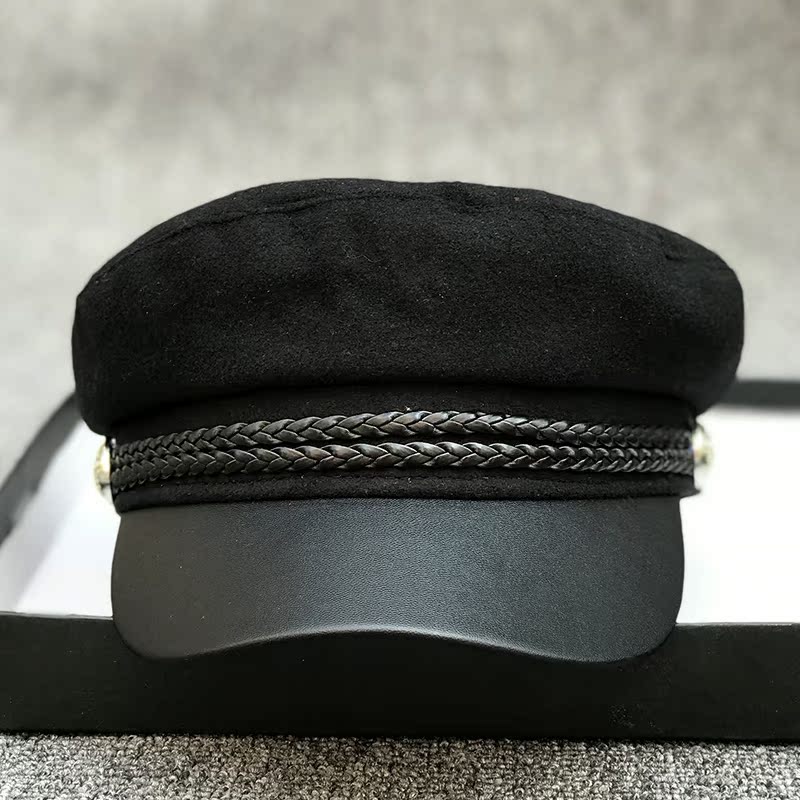 2019秋冬毛呢皮沿皮繩銀扣裝飾軍帽女貝雷帽百搭英倫復古平頂帽子1入