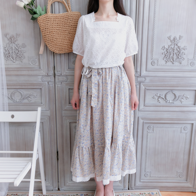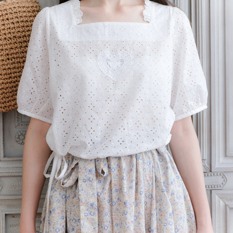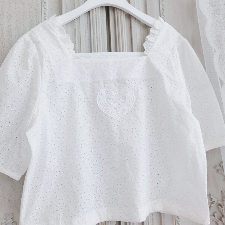 熙醬復古法式下擺抽短款帶方領口愛心可愛鏤空棉布材質龍心襯衣1入
