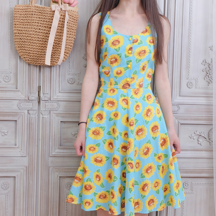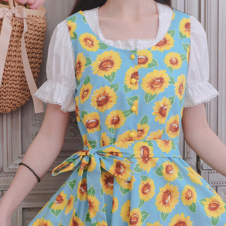 熙醬手工制作復古大擺向日葵美式棉布背心裙少女感短款連衣裙1入