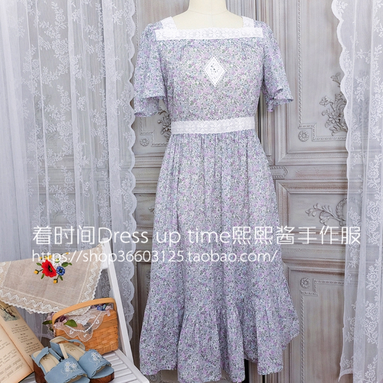 英國風復古70年代喇叭袖大擺茶會碎花連衣裙1入