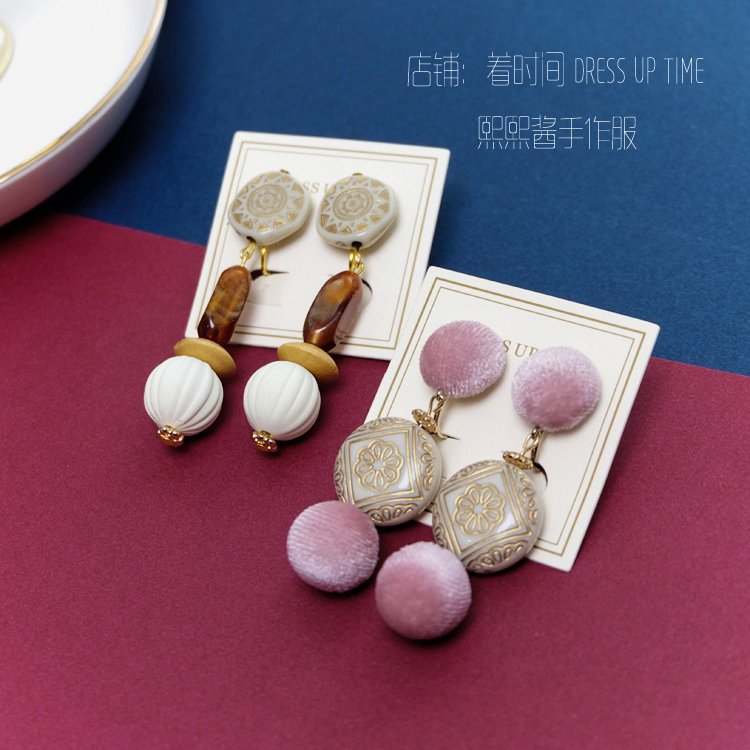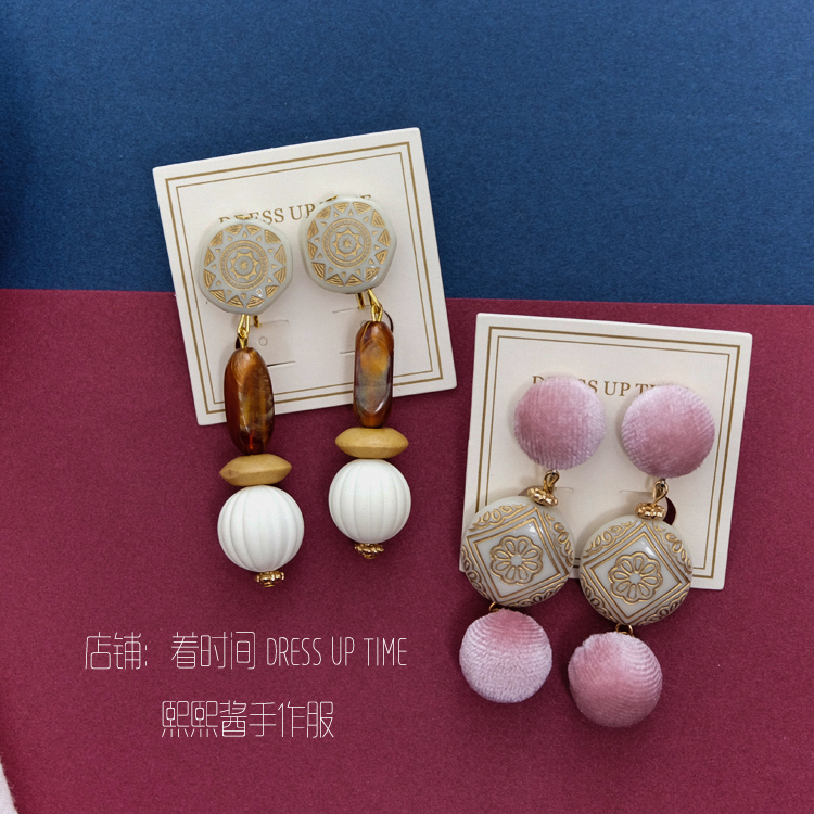 手工制作藝術系絨絨可愛材質復古系串珠耳環1入