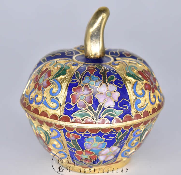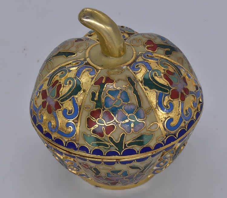 此款金地南瓜罐采用傳統景泰藍工藝與金地鑲嵌工藝相結合,一半是傳統實地磨光,一半是金底勾花。金地景泰藍,使平面景泰藍展現出層次感和立體感。六個面棱角分明,不同于花瓶或者圓球類器型,這種器型更難打磨,其制作難度高于其他圓形景泰藍很多倍。