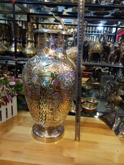 【產品名稱】:印度銅雕彩繪花瓶,吉祥如意、招財進寶平安富貴瓶 巴基斯坦批發商亞瑟王手工藝品店 【產地】:印度 【材質】:印度銅器 【工藝】: 純手工銅雕漆彩孔雀玫瑰花工藝 【歷史簡介】:巴基斯坦銅雕、石雕.木雕手工藝品及印度銅雕手工藝品、手織地毯、掛毯及民族服裝飾品歷史悠久,具有濃郁的伊斯蘭宗教和民族特色。其中鑄銅雕刻手工藝品最具代表和典型性。其制作工藝的歷史可追溯至幾百年前。早在幾百年前土爾其和伊朗開始在石頭上雕刻,后來改變在銅的表面上雕刻,而后這種雕刻技術傳入北印度(NORTH INDIA MURAD ABAD),經這里流傳到印度、巴基斯坦。雕刻而成的瓶、壺、盤以及各種造形的生肖動物,形象逼真,栩栩如生,大多以人們生活用品演變為裝飾工藝品。 【規格】:(見圖示) 【用途】:印度銅雕手工藝品,平安聚財聚寶富貴瓶,喬遷,新婚,生日、節日時饋贈的高檔商務禮品 家居裝飾、賓館、酒店、辦公場所的異域風格工藝品擺件。 【買家須知】: 純手工雕刻的每件寶貝的花紋都不同,有各種圖案和花色,隨機發貨,有特殊要求的請聯系客服。本店所有寶貝均為巴基斯坦民間匠人在手工作坊里一刀一鑿雕琢出來的,是百分之百純手工雕刻的,每一件寶貝都凝聚著匠人們的精湛技藝和獨特的匠心。,每一件寶貝都是獨一無二的,絕不雷同。價格單位:一個 1、印度銅雕、巴基斯坦銅雕、木雕手工藝品,是純手工制作,在翻砂、鑄模、零部件焊接、雕刻過程中出現的雕刻細紋、拋光、雜色、缺(不顯眼小坑)、邊緣打磨少許粗糙、噴漆不均勻、輕微裂、包裹體等均為手工雕刻特征,不屬質量問題。經雕刻、點漆處理的小砂眼或小細紋,均屬手工制品允許的瑕疵范疇,不屬質量問題,不影響正常的擺設和觀賞,請追求絕對完美的您,要慎拍或是不拍,以免發生糾紛! 2、印度銅雕、巴基斯坦銅器、巴基斯坦木雕、巴基斯坦手工牛皮鞋等手工藝品的保養方法:臟了,是用牛仔干布子擦拭,不可用水直接泡洗,牛皮鞋可沾水擦洗,(忌雨天穿著)本店所有寶貝均為店家實物拍攝,如相機和拍攝環境的原因出現色差,都以本店實物顏色為準。(不容色差的朋友慎拍或不拍,謝謝!) 3、請在購物前仔細閱讀買家須知,絕對追求好評,我很真實的反應了寶貝的具體情況,如寶貝本身的質量問題,請于收貨當日拍下質量問題所在處,讓我確定后,會及時給您退換。如無任何異議請親們在3日內盡快確認,謝謝! 4、我會精挑細選找最好的,最漂亮的商品給您,真誠為您服務,您的滿意是我最大的心愿!請您在收到寶貝時,當著快遞員面打開郵包,仔細查看后,確認貨物完好無損及滿意后再簽收,如果包裹有損壞,請拒絕簽收,并且及時聯系我們。 5、印度銅雕、巴基斯坦銅雕、木雕手工藝品都用的是英國計量尺寸英寸,多少會有些偏差,因為是手工測量,小件寶貝允許1-4cm的誤差,大件寶貝允許1-8cm的誤差。在這里為了尺度準確均以中國計量單位( 厘米)為準,請親們注意查看哦!謝謝!【備注:1英寸=2.54厘米】 默認物流:申通、韻達快遞,三到五天到貨,物流均送貨上門。如需其他物流,請聯系客服說明。北京時間17點之前拍的訂單當日發貨,17點之后拍的訂單次日發貨。 祝您購物愉快,如有其它問題請聯系掌柜,電話0991-8556985(店),傳真:0991-8556985,18999259173、13325628582,旺旺:亞瑟阿夫塔,實體店地址:新疆烏魯木齊國際大巴扎4號樓二樓B-310、311、312店 庫房B-324、325、326、 328庫。