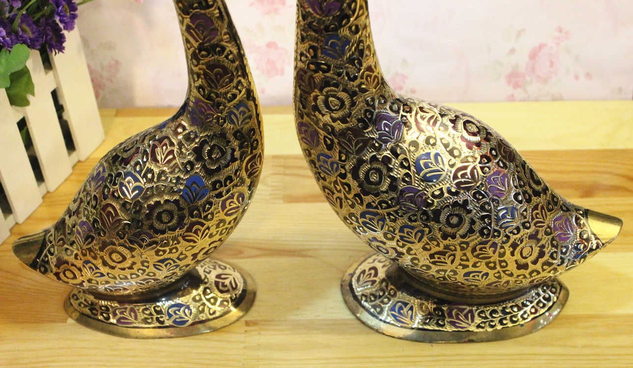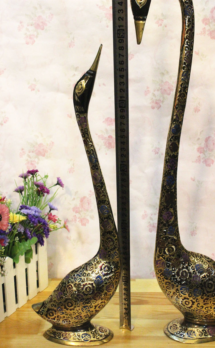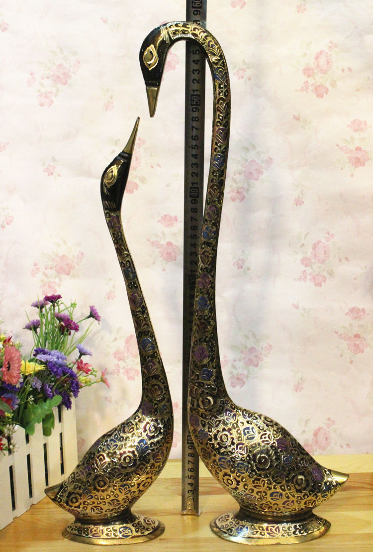 【產品名稱】:巴基斯坦銅雕情侶天鵝 巴基斯坦批發商亞瑟王手工藝品店 【產地】:巴基斯坦 【材質】:巴基斯坦銅器 【工藝】: 純手工新漆彩雕刻工藝 【歷史簡介】:印度銅雕、巴基斯坦銅雕、石雕.木雕手工藝品及印度銅雕手工藝品、手織地毯、掛毯及民族服裝飾品歷史悠久,具有濃郁的伊斯蘭宗教和民族特色。其中鑄銅雕刻手工藝品最具代表和典型性。其制作工藝的歷史可追溯至幾百年前。早在幾百年前土爾其和伊朗開始在石頭上雕刻,后來改變在銅的表面上雕刻,而后這種雕刻技術傳入北印度(NORTH INDIA MURAD ABAD),經這里流傳到巴基斯坦。雕刻而成的瓶、壺、盤以及各種造形的生肖動物,形象逼真,栩栩如生,大多以人們生活用品演變為裝飾工藝品。 巴基斯坦鑄銅雕刻手工藝品從制作工藝上可分為十五種工藝,上千個品種,每件工藝品根據雕刻的需要銅含量約為60%,其他金屬合金含量約占40%,制作程序可分為七大步驟:1.模具翻砂2.零部件焊接3.打磨修整4.拋光電鍍5.劃線雕刻6.刻花處理7.噴、烤漆成型。雕刻手法有:側刀刻、立刀鑿、平刀削。其生產方式以家庭手工作坊為主,子承父業,代代相傳為生產理念。學徒從五、六歲開始從師學藝,直至十五、六歲技藝嫻熟另立門戶終身從事銅制手工藝品雕刻。 【規格】:24英寸(見圖示)低頭鵝高度58公分左右,昂頭鵝高度48公分左右