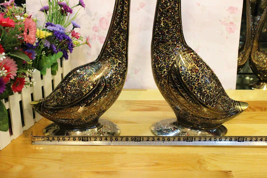 【產品名稱】:巴基斯坦銅雕情侶天鵝 巴基斯坦批發商亞瑟王手工藝品店 【產地】:巴基斯坦 【材質】:巴基斯坦銅器 【工藝】: 純手工精雕彩點雕刻工藝 【歷史簡介】:印度銅雕、巴基斯坦銅雕、石雕.木雕手工藝品及印度銅雕手工藝品、手織地毯、掛毯及民族服裝飾品歷史悠久,具有濃郁的伊斯蘭宗教和民族特色。其中鑄銅雕刻手工藝品最具代表和典型性。其制作工藝的歷史可追溯至幾百年前。早在幾百年前土爾其和伊朗開始在石頭上雕刻,后來改變在銅的表面上雕刻,而后這種雕刻技術傳入北印度(NORTH INDIA MURAD ABAD),經這里流傳到巴基斯坦。雕刻而成的瓶、壺、盤以及各種造形的生肖動物,形象逼真,栩栩如生,大多以人們生活用品演變為裝飾工藝品。 巴基斯坦鑄銅雕刻手工藝品從制作工藝上可分為十五種工藝,上千個品種,每件工藝品根據雕刻的需要銅含量約為60%,其他金屬合金含量約占40%,制作程序可分為七大步驟:1.模具翻砂2.零部件焊接3.打磨修整4.拋光電鍍5.劃線雕刻6.刻花處理7.噴、烤漆成型。雕刻手法有:側刀刻、立刀鑿、平刀削。其生產方式以家庭手工作坊為主,子承父業,代代相傳為生產理念。學徒從五、六歲開始從師學藝,直至十五、六歲技藝嫻熟另立門戶終身從事銅制手工藝品雕刻。 【規格】:28英寸(見圖示)雄鵝高度73厘米左右,雌鵝高度63厘米左右 【用途】:平安聚財聚寶富貴情侶天鵝,喬遷,新婚,生日、節日時饋贈的高檔商務禮品 家居裝飾、賓館、酒店、辦公場所的異域風格工藝品擺件。 【買家須知】:純手工雕刻的每件寶貝的花紋都不同,有各種圖案和花色,隨機發貨,有特殊要求的請聯系客服。本店所有寶貝均為巴基斯坦民間匠人在手工作坊里一刀一鑿雕琢出來的,是百分之百純手工雕刻的,每一件寶貝都凝聚著匠人們的精湛技藝和獨特的匠心。,每一件寶貝都是獨一無二的,絕不雷同。價格單位:一對 1、印度銅雕、巴基斯坦銅雕、木雕手工藝品,是純手工制作,在翻砂、鑄模、零部件焊接、雕刻過程中出現的雕刻細紋、拋光、雜色、缺(不顯眼小坑)、邊緣打磨少許粗糙、噴漆不均勻、輕微裂、包裹體等均為手工雕刻特征,不屬質量問題。經雕刻、點漆處理的小砂眼或小細紋,均屬手工制品允許的瑕疵范疇,不屬質量問題,不影響正常的擺設和觀賞,請追求絕對完美的您,要慎拍或是不拍,以免發生糾紛! 2、印度銅雕、巴基斯坦銅器、巴基斯坦木雕、巴基斯坦手工牛皮鞋等手工藝品的保養方法:臟了,是用牛仔干布子擦拭,不可用水直接泡洗,牛皮鞋可沾水擦洗,(忌雨天穿著)本店所有寶貝均為店家實物拍攝,如相機和拍攝環境的原因出現色差,都以本店實物顏色為準。(不容色差的朋友慎拍或不拍,謝謝!) 3、請在購物前仔細閱讀買家須知,絕對追求好評,我很真實的反應了寶貝的具體情況,如寶貝本身的質量問題,請于收貨當日拍下質量問題所在處,讓我確定后,會及時給您退換。如無任何異議請親們在3日內盡快確認,謝謝! 4、我會精挑細選找最好的,最漂亮的商品給您,真誠為您服務,您的滿意是我最大的心愿!請您在收到寶貝時,當著快遞員面打開郵包,仔細查看后,確認貨物完好無損及滿意后再簽收,如果包裹有損壞請拒絕簽收,并且及時聯系我們。 5、印度銅雕、巴基斯坦銅雕、木雕手工藝品都用的是巴方的計量英寸,多少會有些偏差,因為是手工測量,小件寶貝允許1-4cm的誤差,大件寶貝允許1-8cm的誤差。在這里為了尺度準確均以中國計量單位( 厘米)為準,請親們注意查看哦!謝謝!【1英寸=2.54厘米】 默認物流:申通、韻達快遞、三到五天到貨,物流均送貨上門。如需其他物流,請聯系客服說明。北京時間17點之前拍的訂單當日發貨,17點之后拍的訂單次日發貨。 祝您購物愉快,如有其它問題請聯系掌柜,電話0991-8556985(店),傳真:0991-8556985,18999259173、13325628582 ,旺旺:亞瑟阿夫塔,實體店地址:新疆烏魯木齊國際大巴扎4號樓二樓B-310、311、312店 庫房B-324、325、326、 328庫。 ![]()