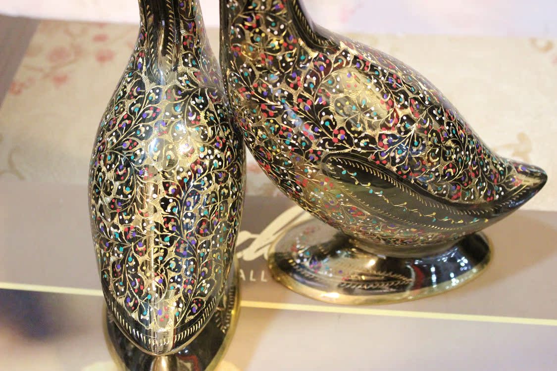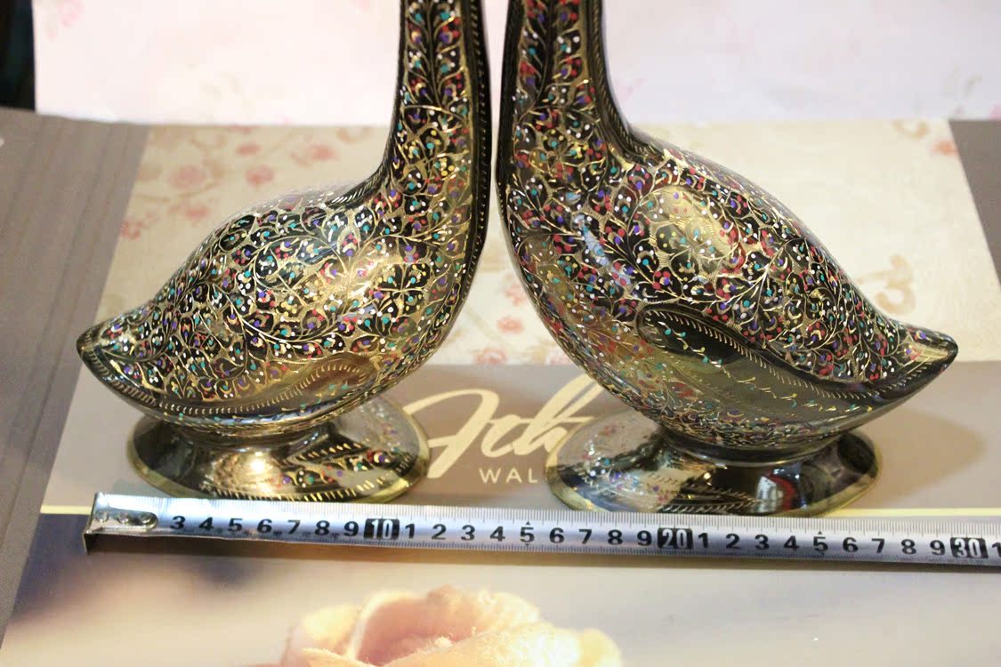 【產品名稱】:巴基斯坦銅雕情侶天鵝 巴基斯坦批發商亞瑟王手工藝品店 【產地】:巴基斯坦 【材質】:巴基斯坦銅器 【工藝】: 純手工彩點雕刻工藝 【歷史簡介】:印度銅雕、巴基斯坦銅雕、石雕.木雕手工藝品及印度銅雕手工藝品、手織地毯、掛毯及民族服裝飾品歷史悠久,具有濃郁的伊斯蘭宗教和民族特色。其中鑄銅雕刻手工藝品最具代表和典型性。其制作工藝的歷史可追溯至幾百年前。早在幾百年前土爾其和伊朗開始在石頭上雕刻,后來改變在銅的表面上雕刻,而后這種雕刻技術傳入北印度(NORTH INDIA MURAD ABAD),經這里流傳到巴基斯坦。雕刻而成的瓶、壺、盤以及各種造形的生肖動物,形象逼真,栩栩如生,大多以人們生活用品演變為裝飾工藝品。 巴基斯坦鑄銅雕刻手工藝品從制作工藝上可分為十五種工藝,上千個品種,每件工藝品根據雕刻的需要銅含量約為60%,其他金屬合金含量約占40%,制作程序可分為七大步驟:1.模具翻砂2.零部件焊接3.打磨修整4.拋光電鍍5.劃線雕刻6.刻花處理7.噴、烤漆成型。雕刻手法有:側刀刻、立刀鑿、平刀削。其生產方式以家庭手工作坊為主,子承父業,代代相傳為生產理念。學徒從五、六歲開始從師學藝,直至十五、六歲技藝嫻熟另立門戶終身從事銅制手工藝品雕刻。 【規格】:24英寸(見圖示)仰頭鵝高度60公分左右