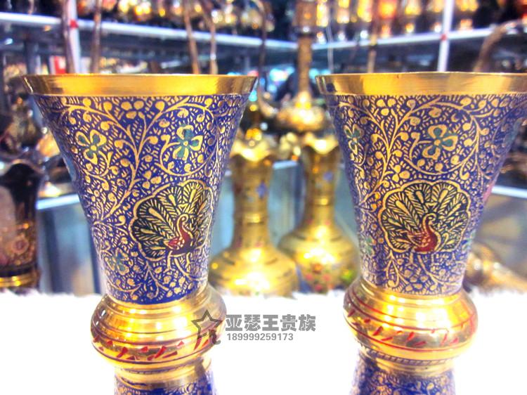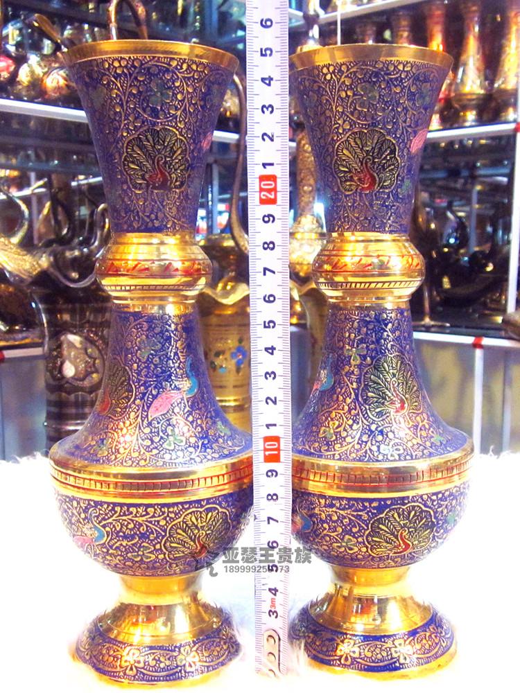 【產品名稱】:印度銅雕彩繪情侶瓶 聚財聚寶如意富貴瓶 【產地】:印度 【材質】:印度銅器 【工藝】: 純手工彩繪雕刻 【歷史簡介】:巴基斯坦銅雕、石雕.木雕手工藝品及印度銅雕手工藝品、手織地毯、掛毯及民族服裝飾品歷史悠久,具有濃郁的伊斯蘭宗教和民族特色。其中鑄銅雕刻手工藝品最具代表和典型性。其制作工藝的歷史可追溯至幾百年前。早在幾百年前土爾其和伊朗開始在石頭上雕刻,后來改變在銅的表面上雕刻,而后這種雕刻技術傳入北印度(NORTH INDIA MURAD ABAD),經這里流傳到印度、巴基斯坦。雕刻而成的瓶、壺、盤以及各種造形的生肖動物,形象逼真,栩栩如生,大多以人們生活用品演變為裝飾工藝品。 巴基斯坦鑄銅雕刻手工藝品從制作工藝上可分為十五種工藝,上千個品種,每件工藝品根據雕刻的需要銅含量約為60%,其他金屬合金含量約占40%,制作程序可分為七大步驟:1.模具翻砂2.零部件焊接3.打磨修整4.拋光電鍍5.劃線雕刻6.刻花處理7.噴、烤漆成型。雕刻手法有:側刀刻、立刀鑿、平刀削。其生產方式以家庭手工作坊為主,子承父業,代代相傳為生產理念。學徒從五、六歲開始從師學藝,直至十五、六歲技藝嫻熟另立門戶終身從事銅制手工藝品雕刻。 【規格】:10英寸