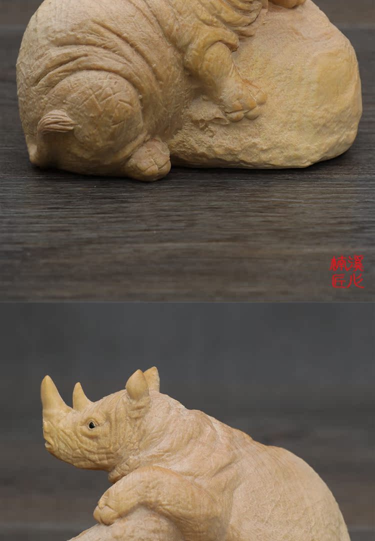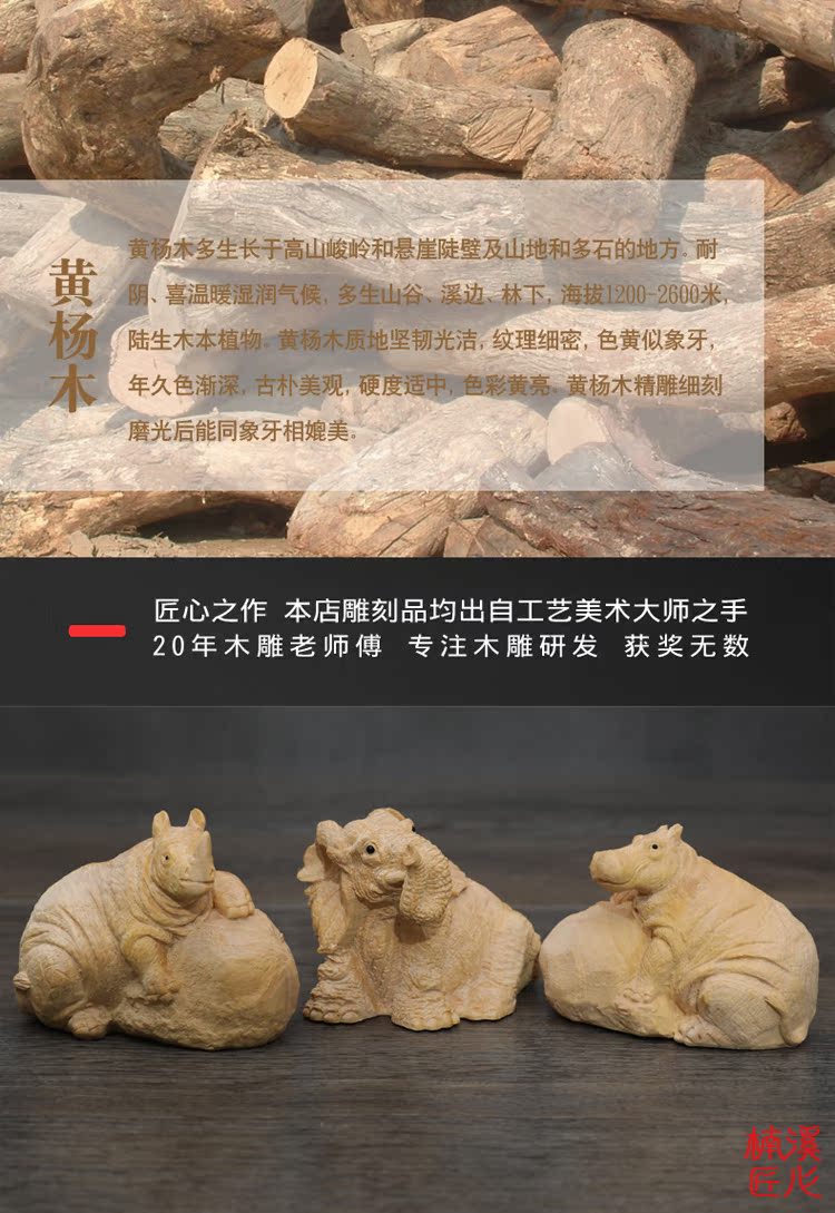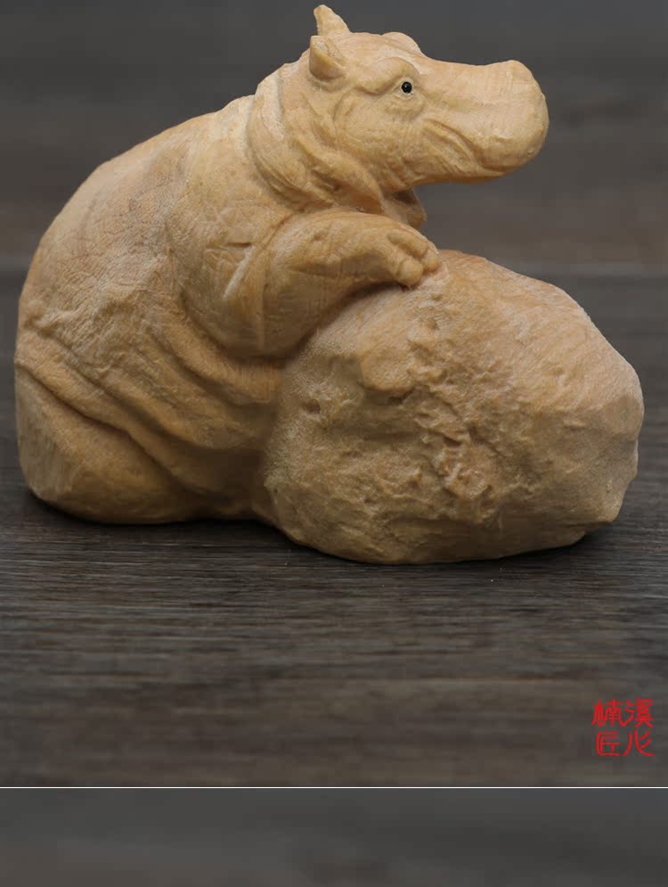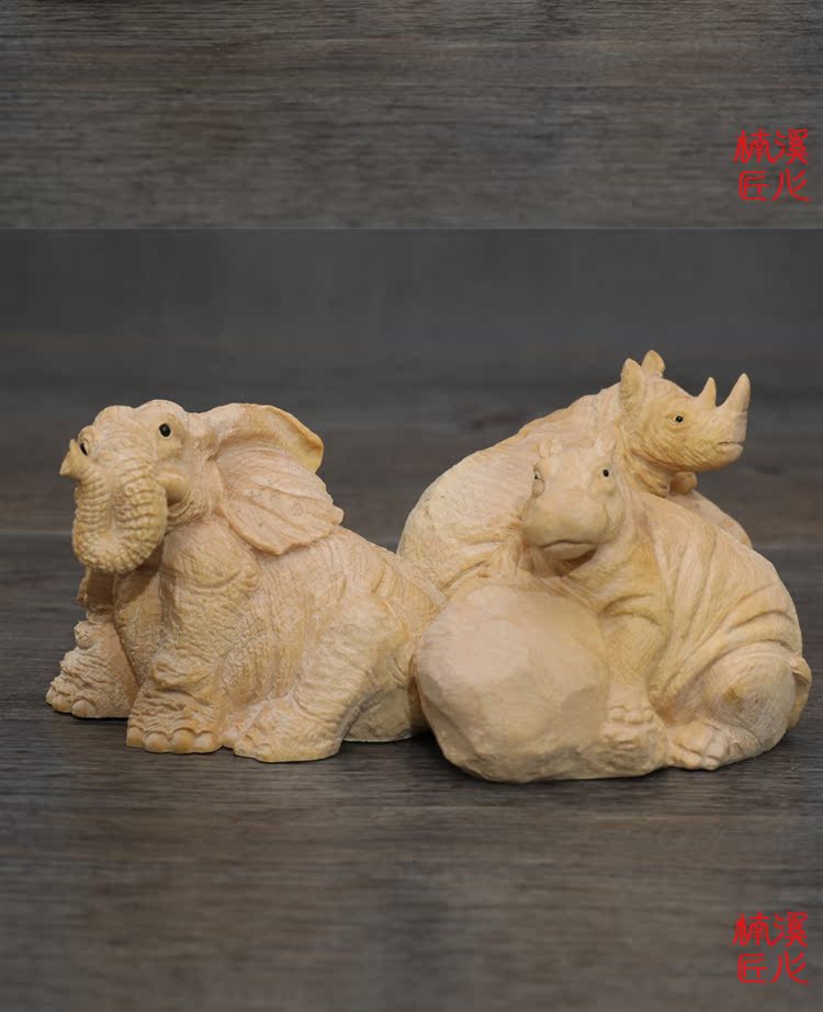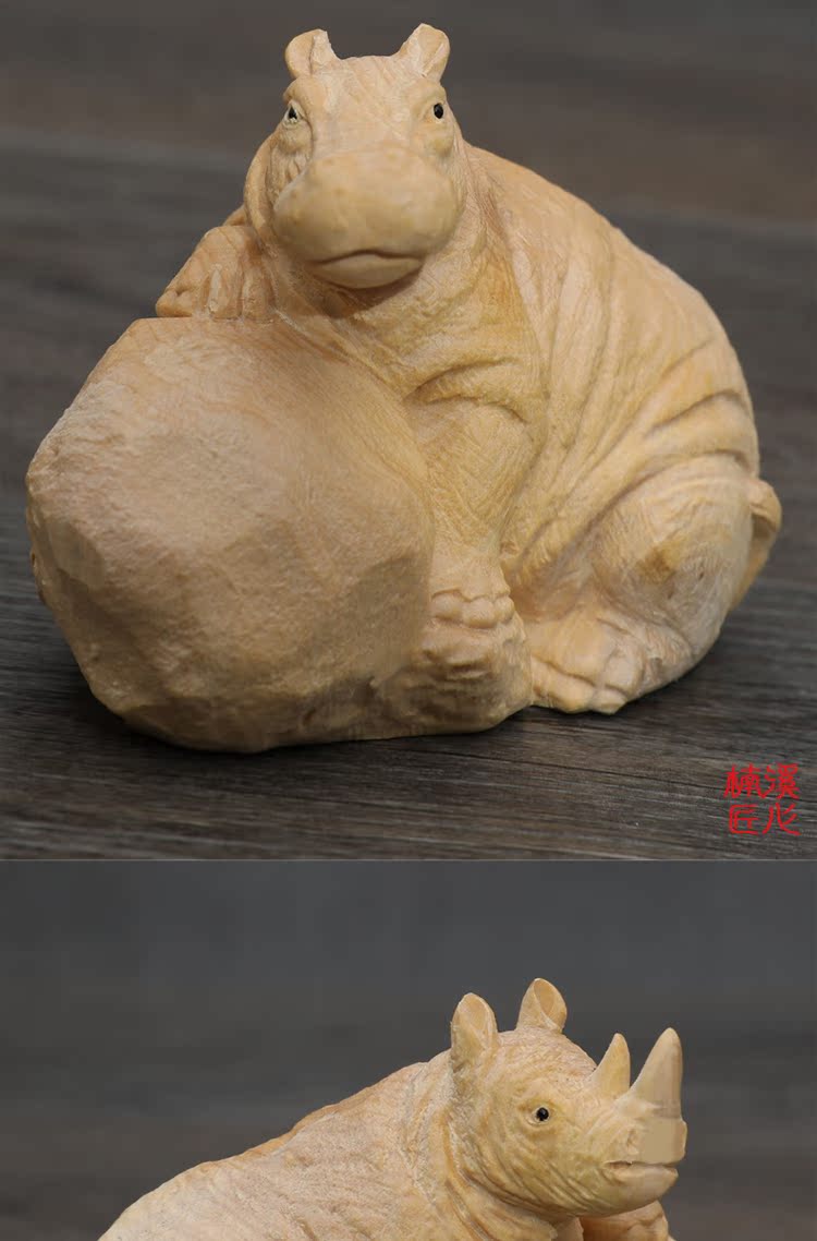 楠溪匠心黃楊木雕手把件非洲三寶大象河馬犀牛手工家居動物小擺件1入
