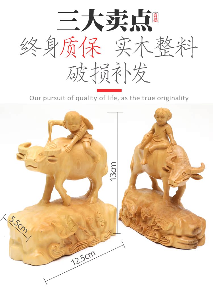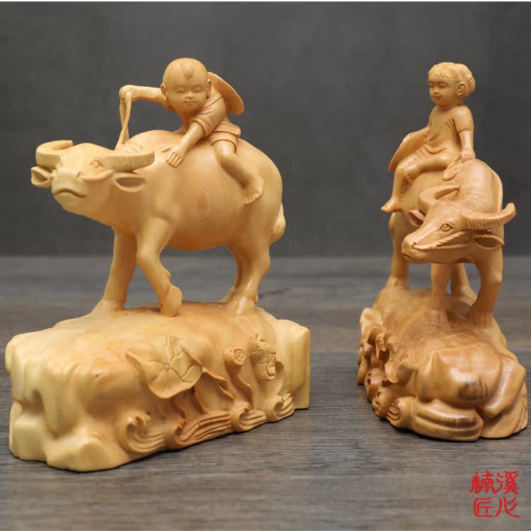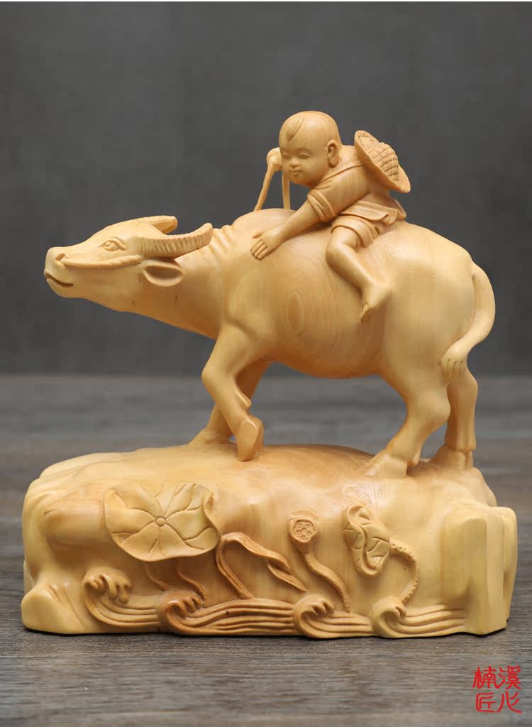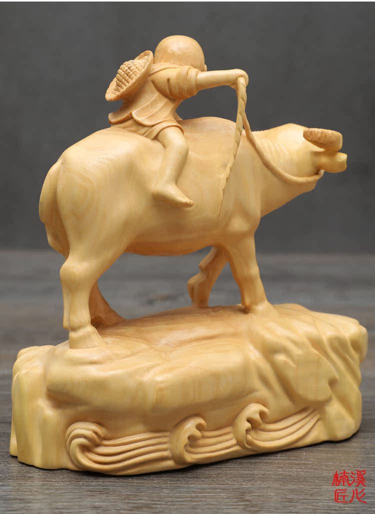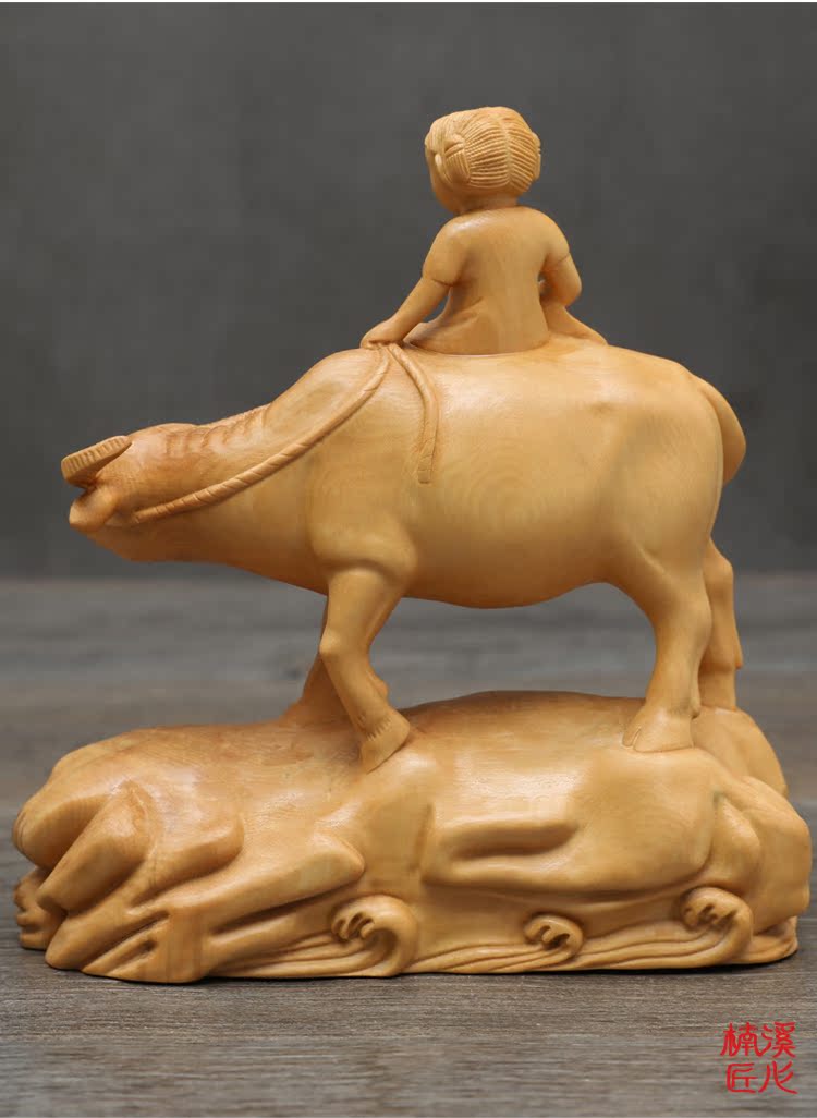 楠溪匠心小葉黃楊木雕牧童騎牛擺件放牛娃中式工藝品牛童家居擺設1入