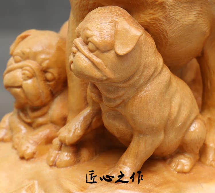 楠溪匠心小葉黃楊木雕法國斗牛犬一家擺件法斗家犬擺設創意藝術品1入