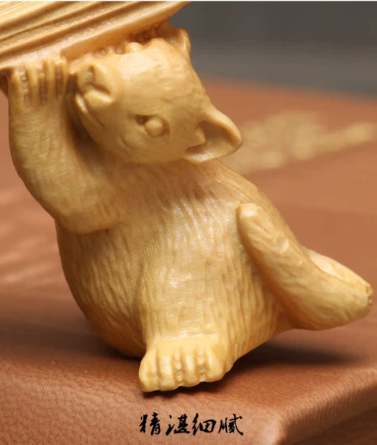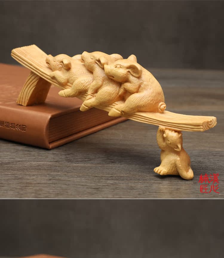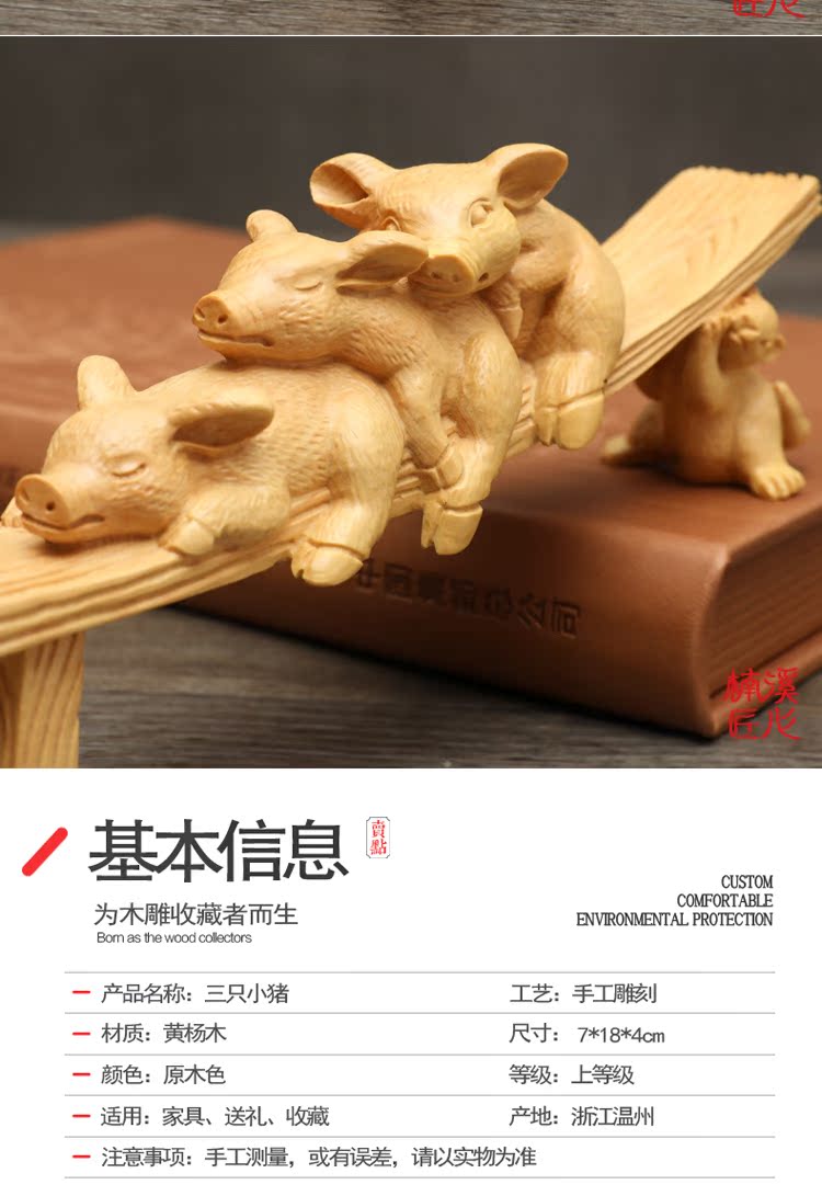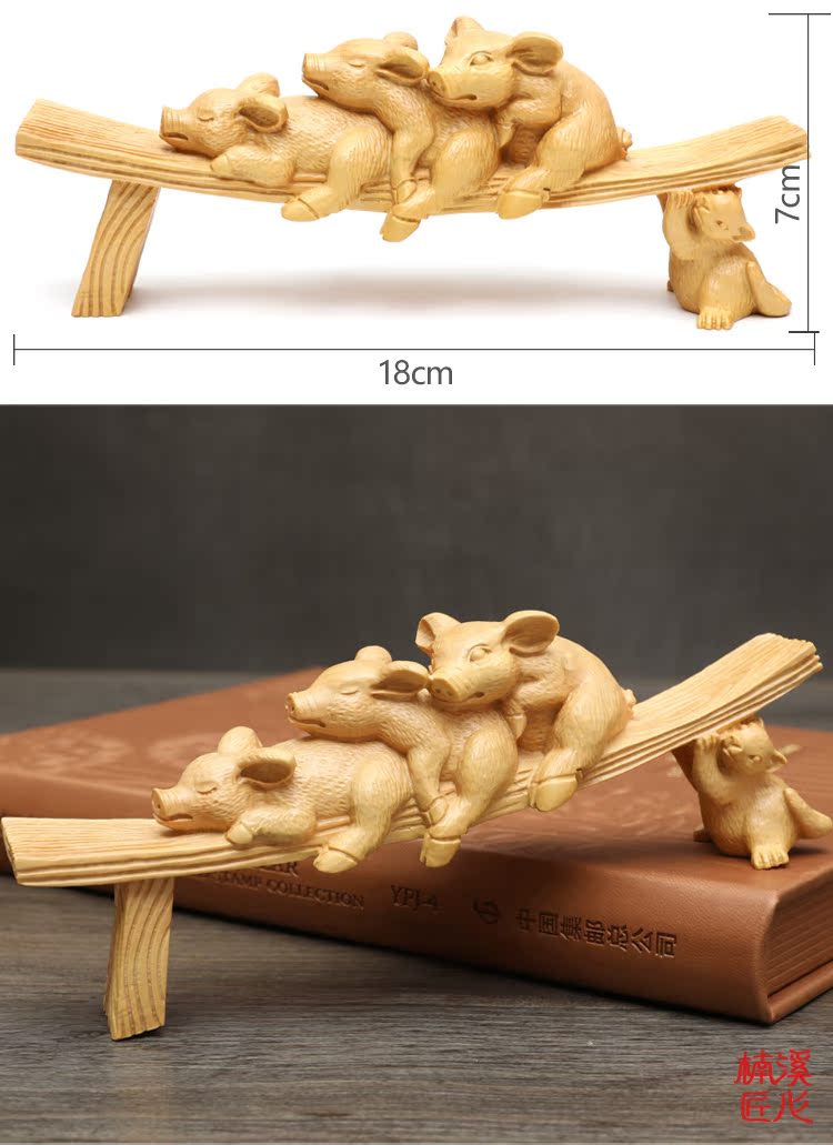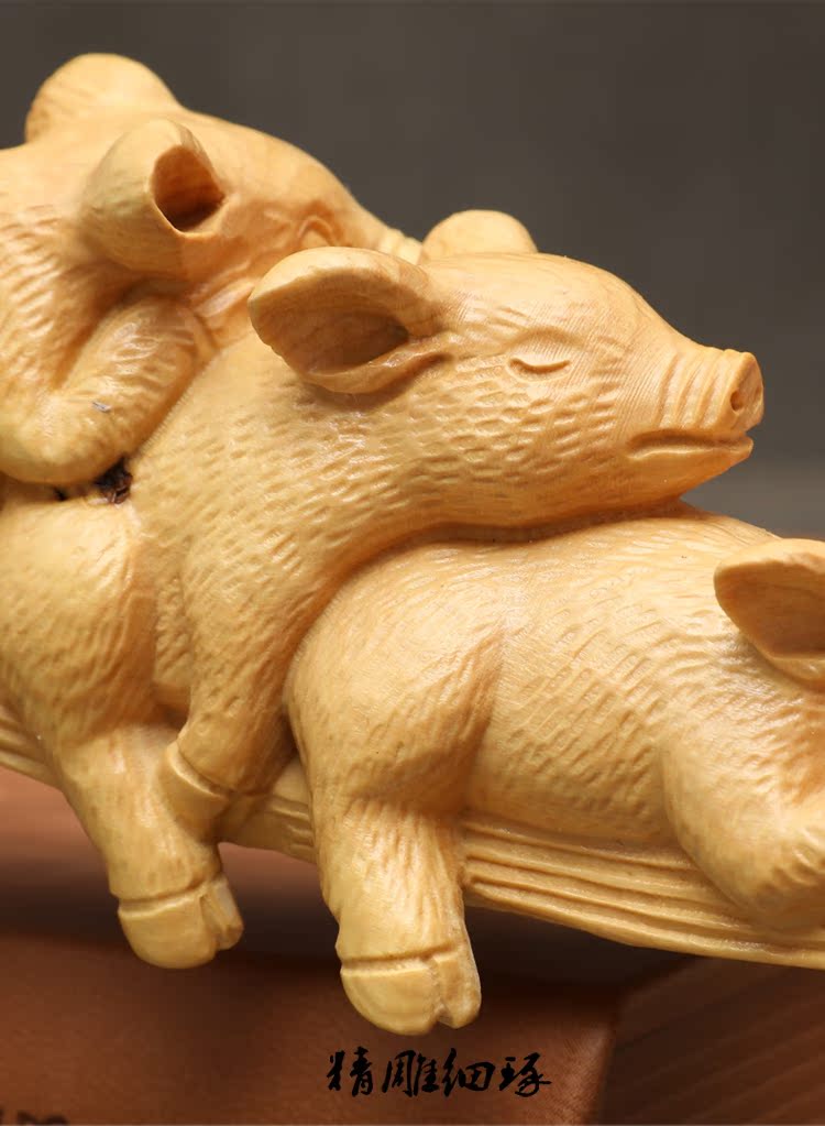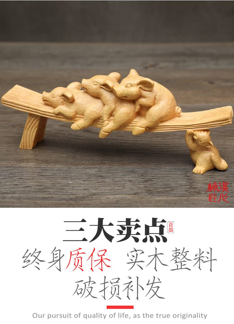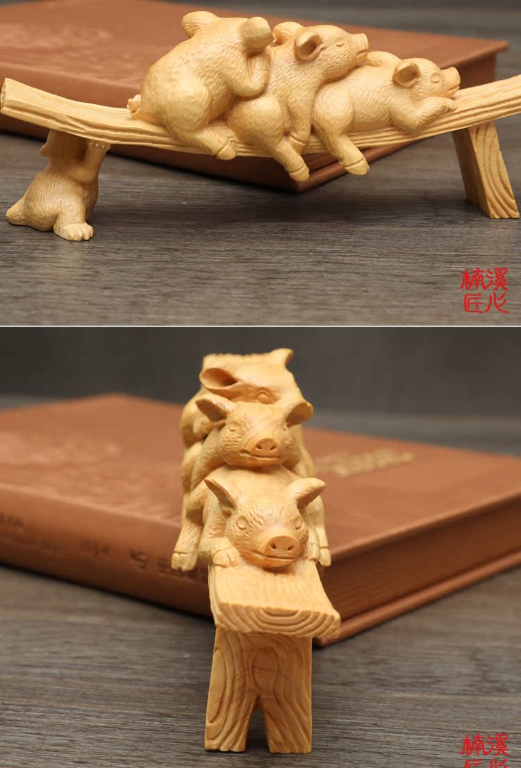 [2]楠溪匠心黃楊木雕松鼠板凳三只小豬實木動物福氣豬擺件手把件家居1入