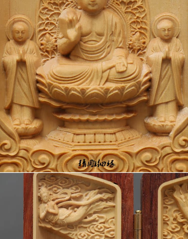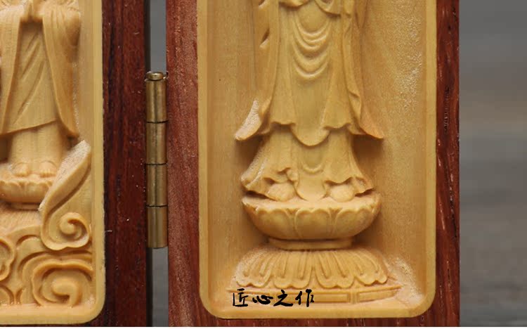 [2]楠溪匠心黃楊木雕擺件佛像西方三圣觀音實木隨身佛龕福祿壽三開盒1入