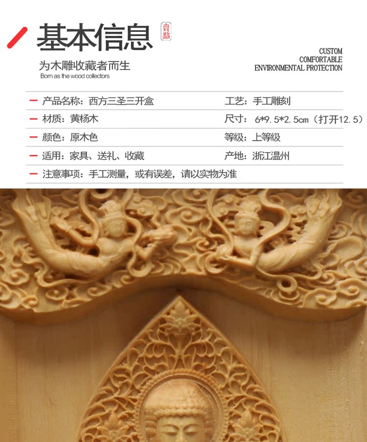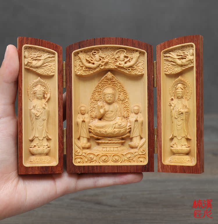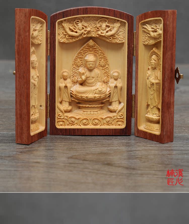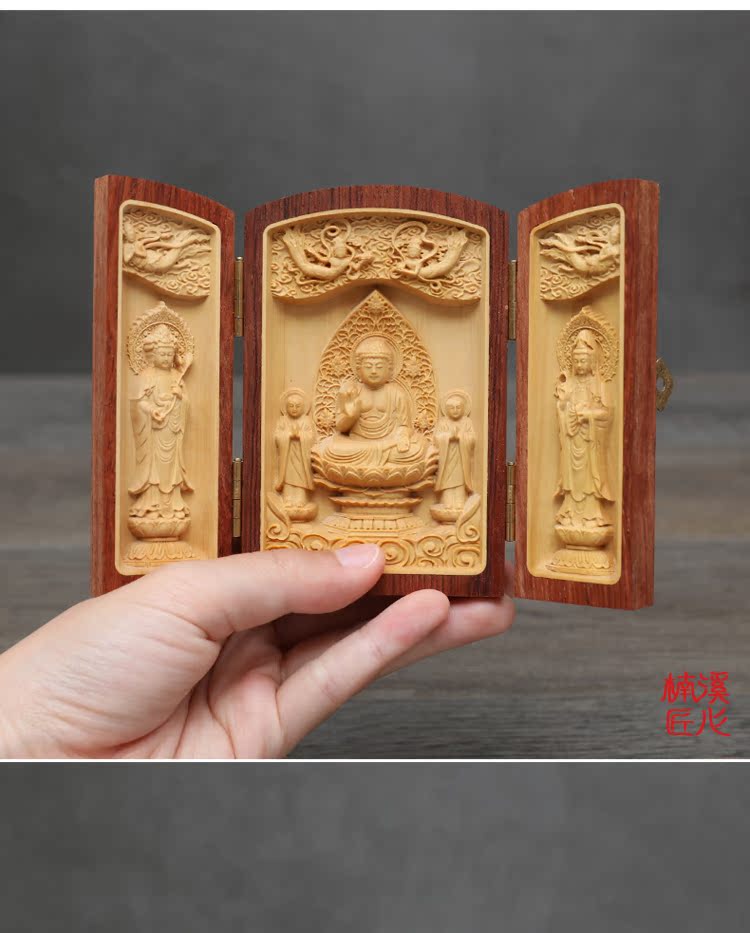 楠溪匠心黃楊木雕擺件佛像西方三圣觀音實木隨身佛龕福祿壽三開盒1入