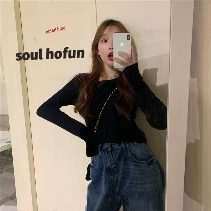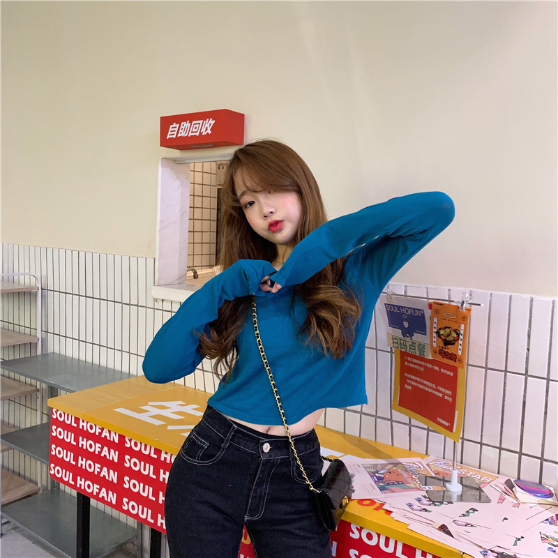 2019秋裝新款圓領長袖基礎款短款針織T恤韓版chic簡約顯瘦上衣女1入