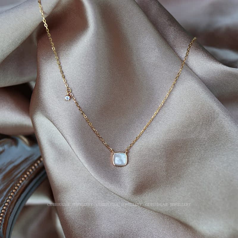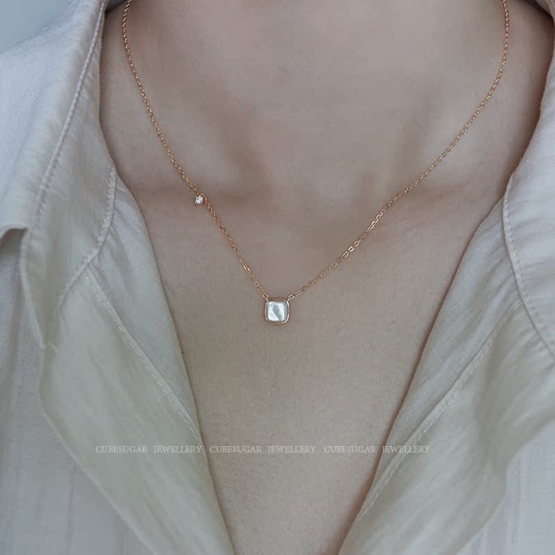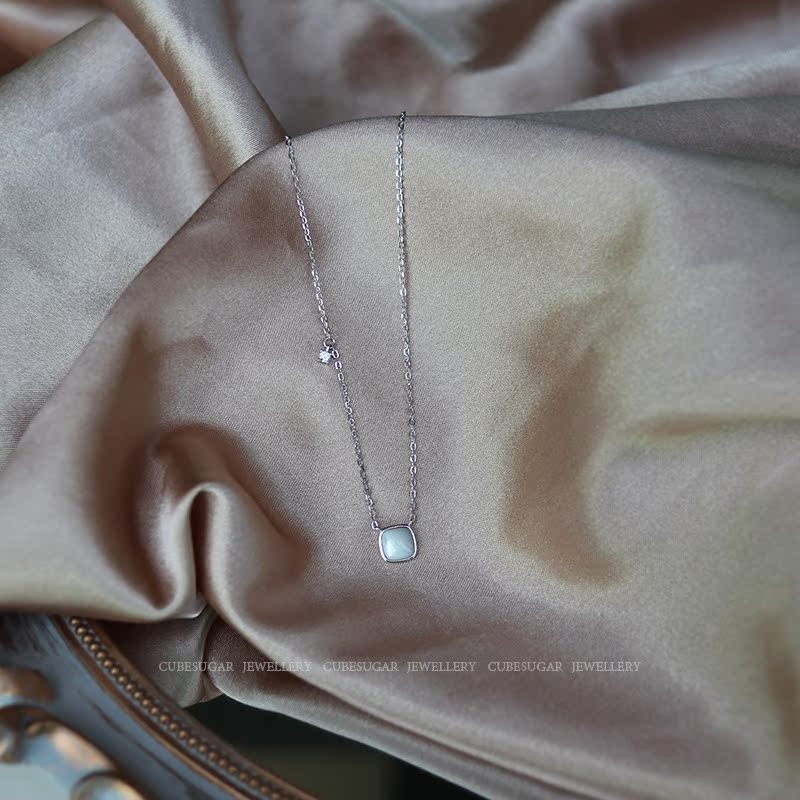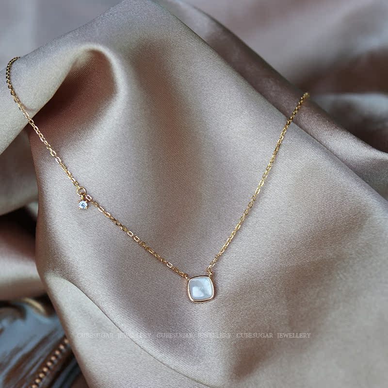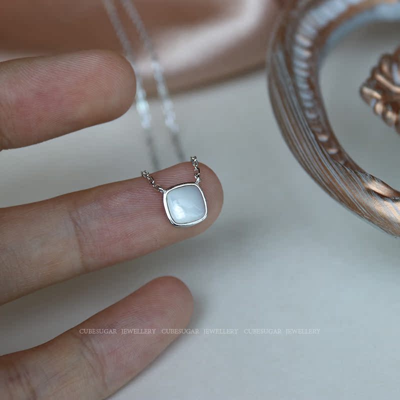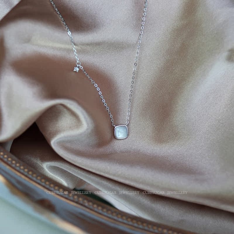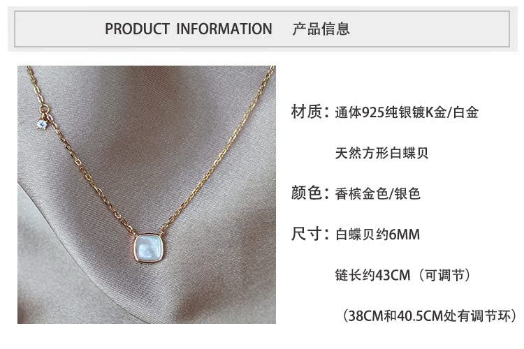 通體925純銀方形天然白蝶貝項鏈高級感輕奢小眾簡約氣質鎖骨鏈女1入