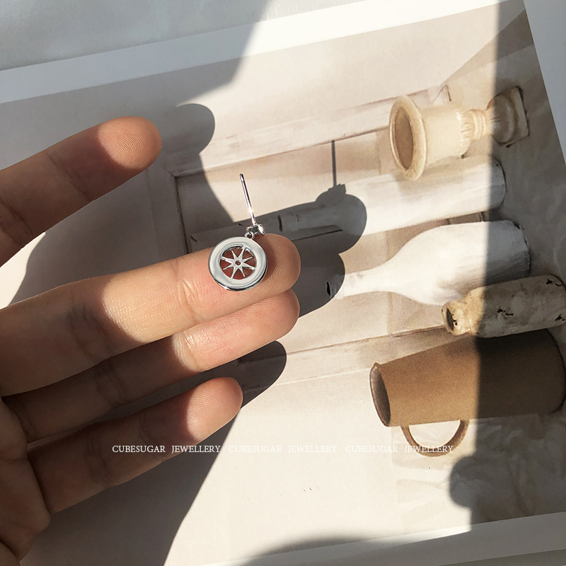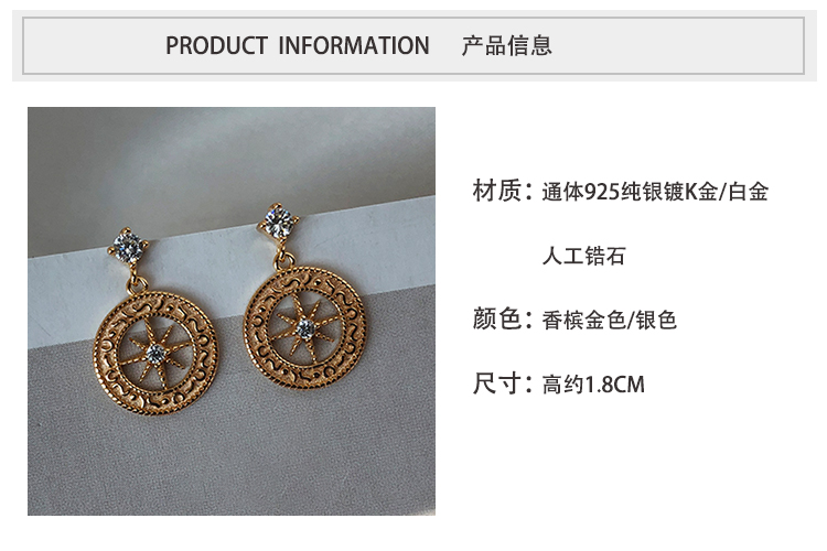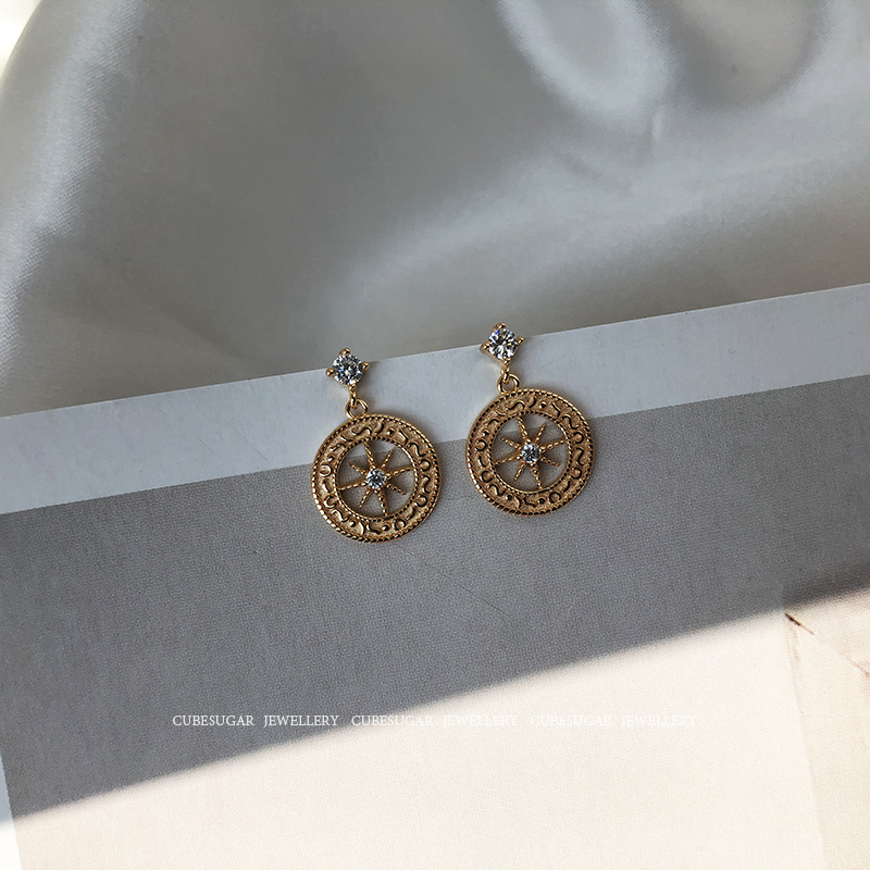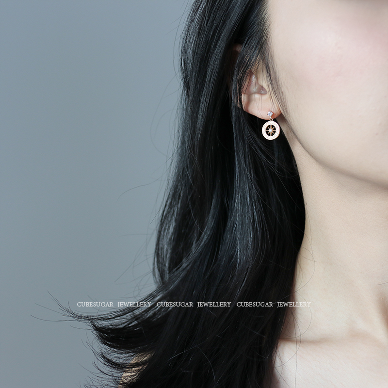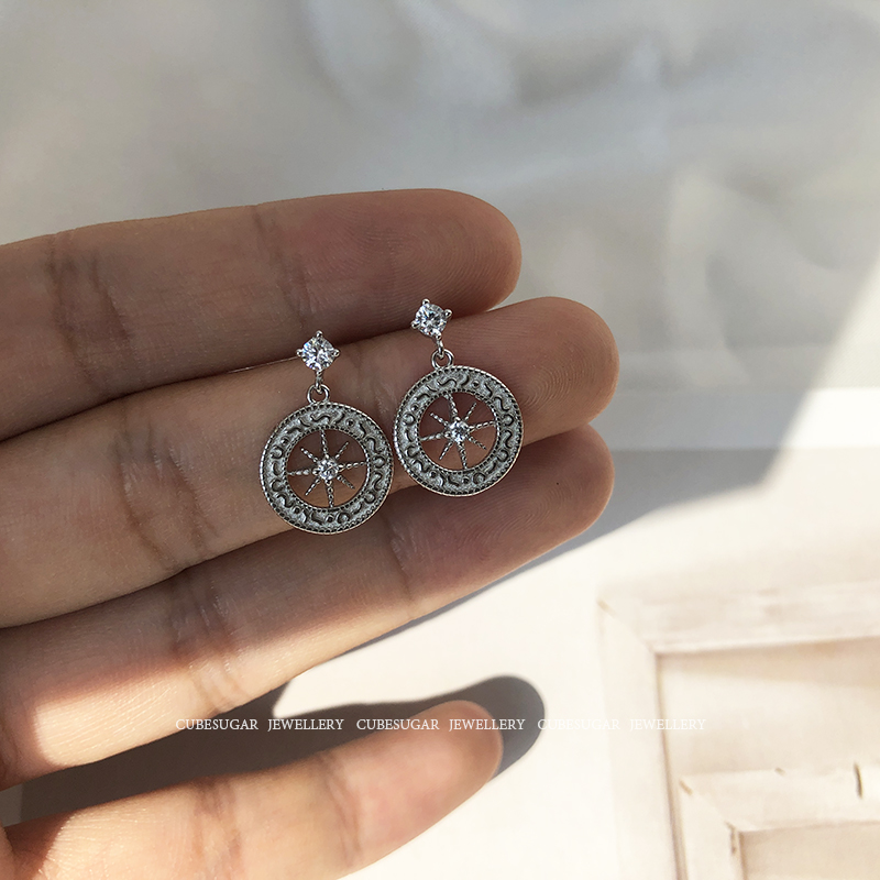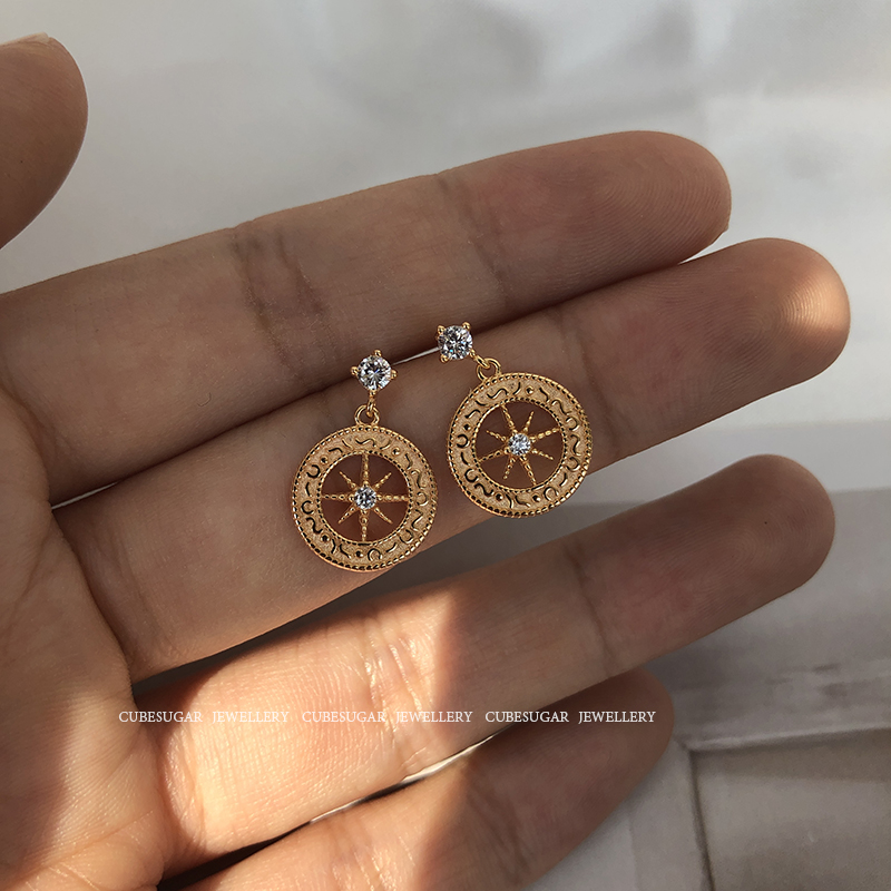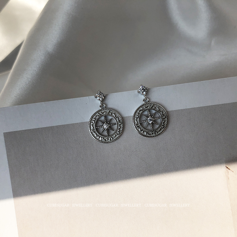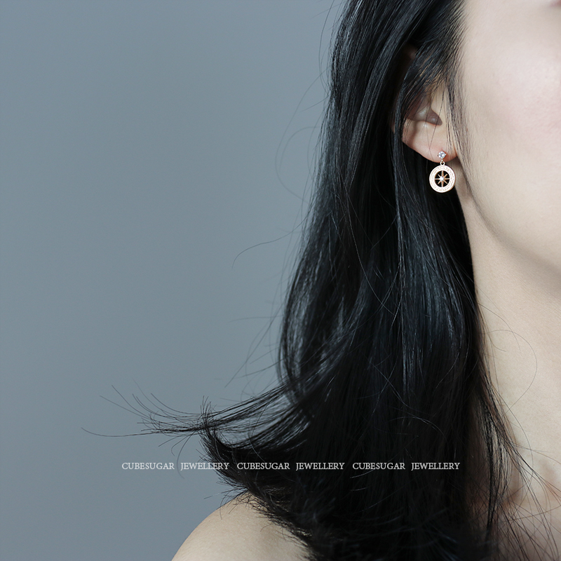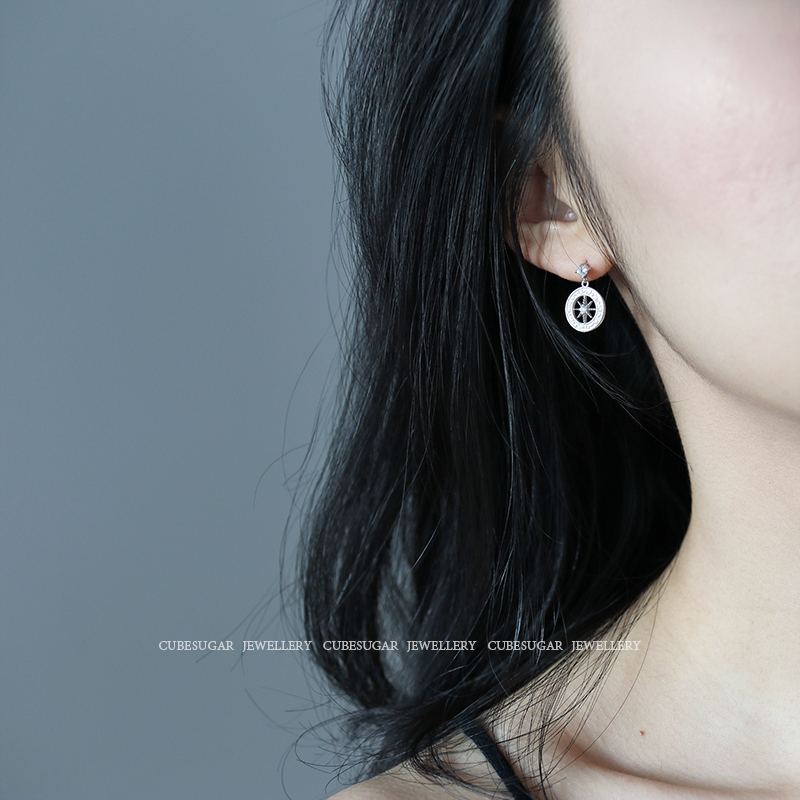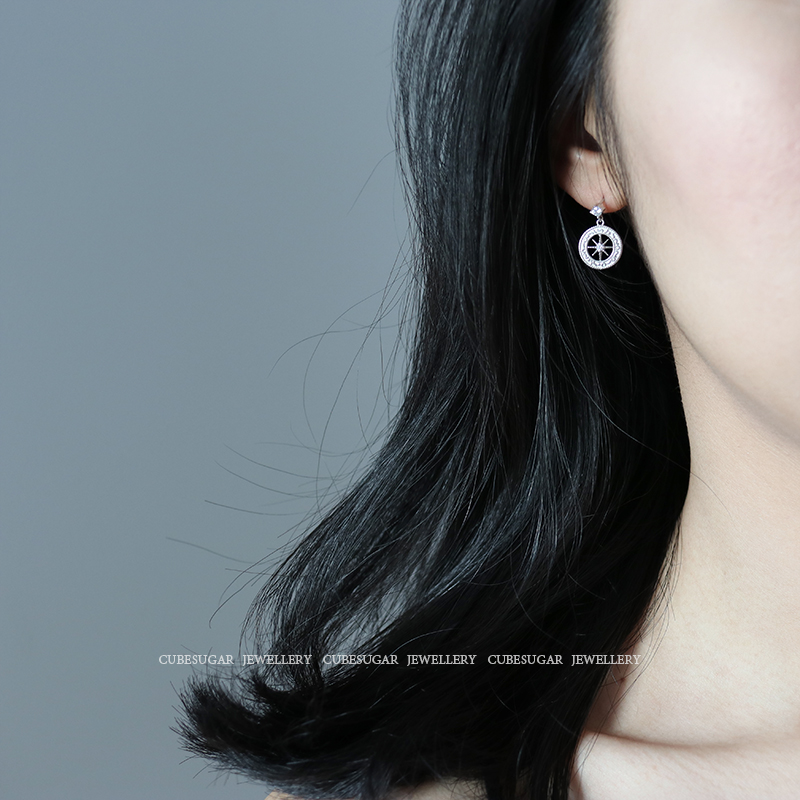 通體925純銀羅盤星星耳釘個性創意設計少女鋯石精致甜美韓國耳環1入