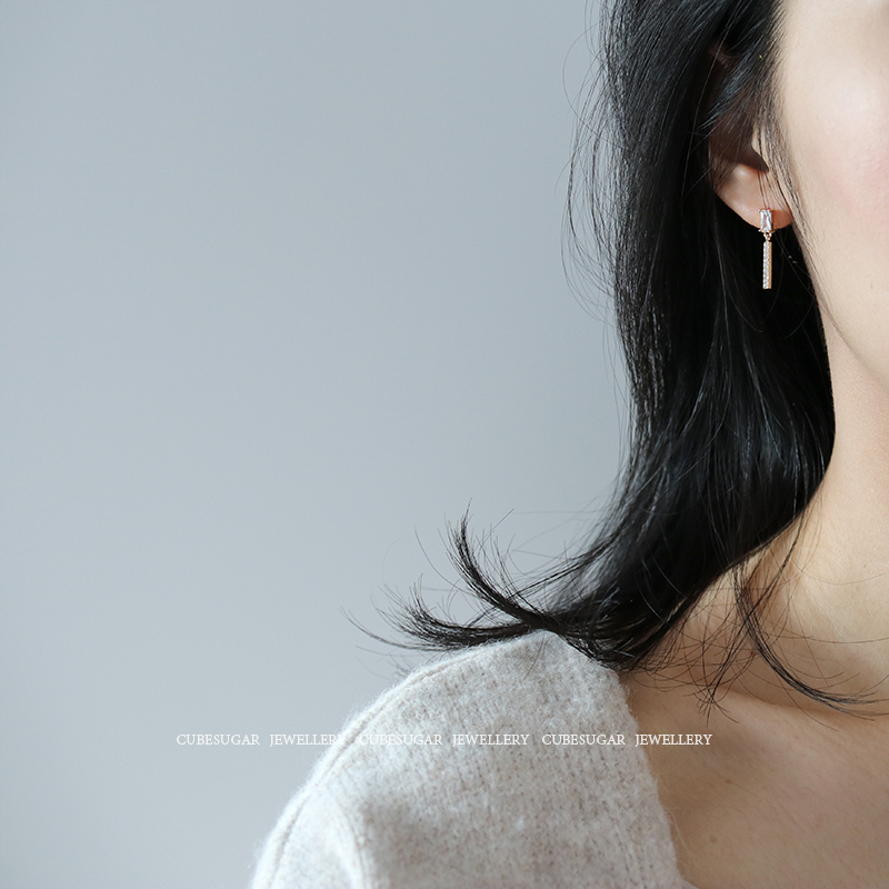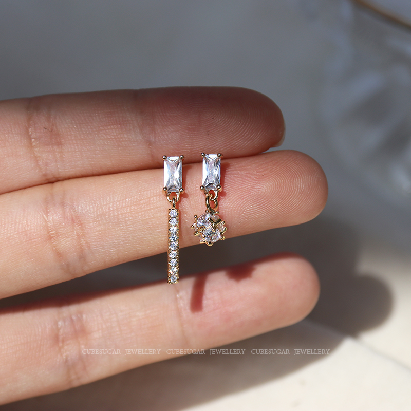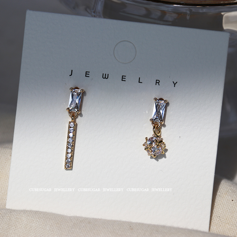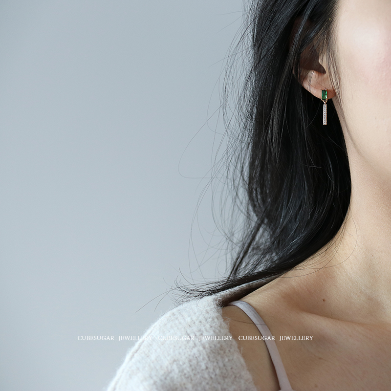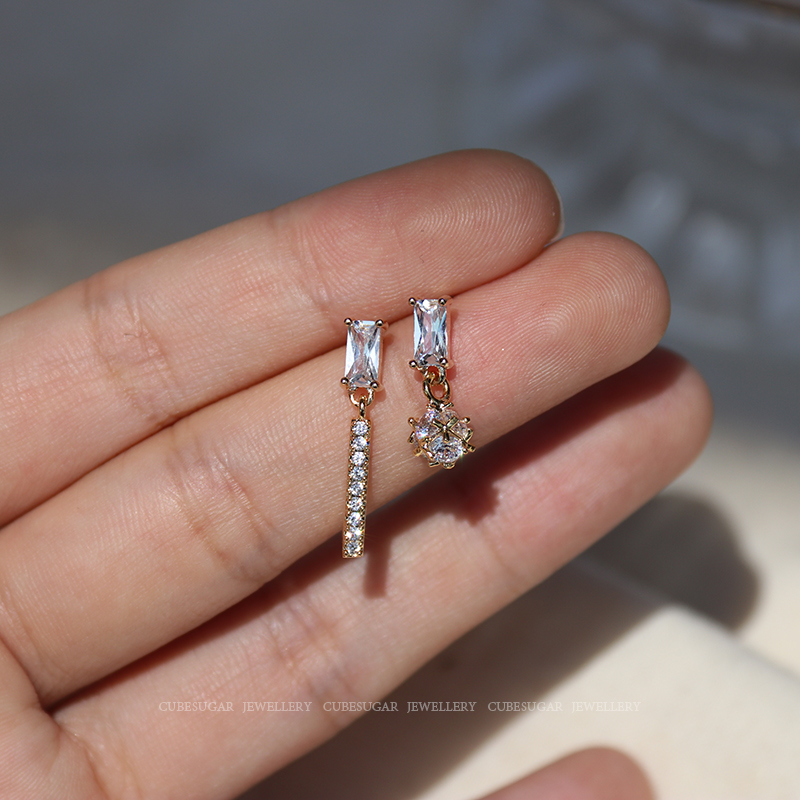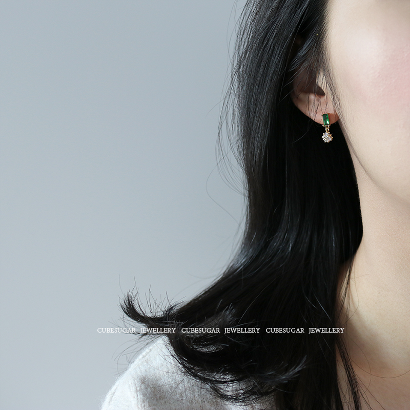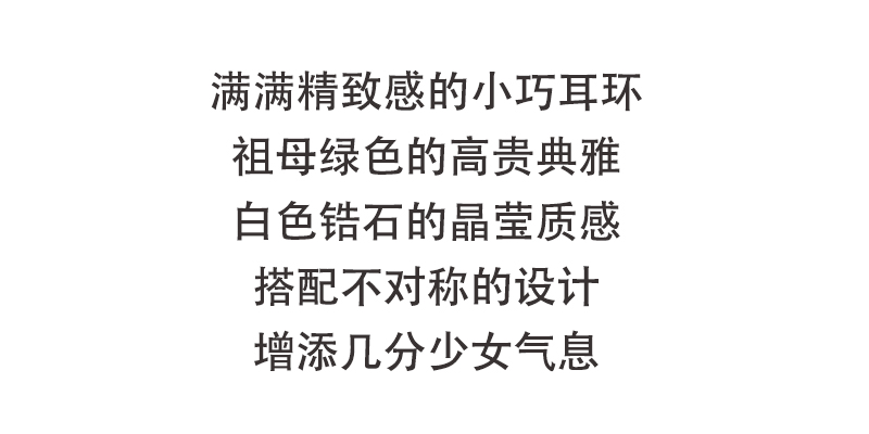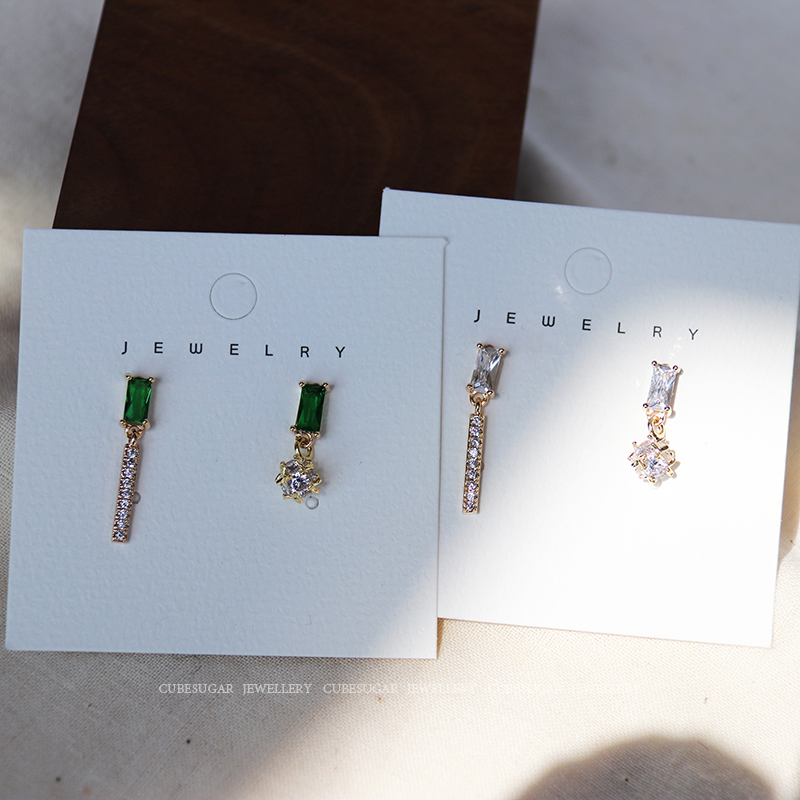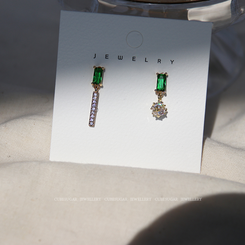 鍍14K真金925銀針祖母綠色/白色鋯石高級感法式氣質不對稱耳環女1入