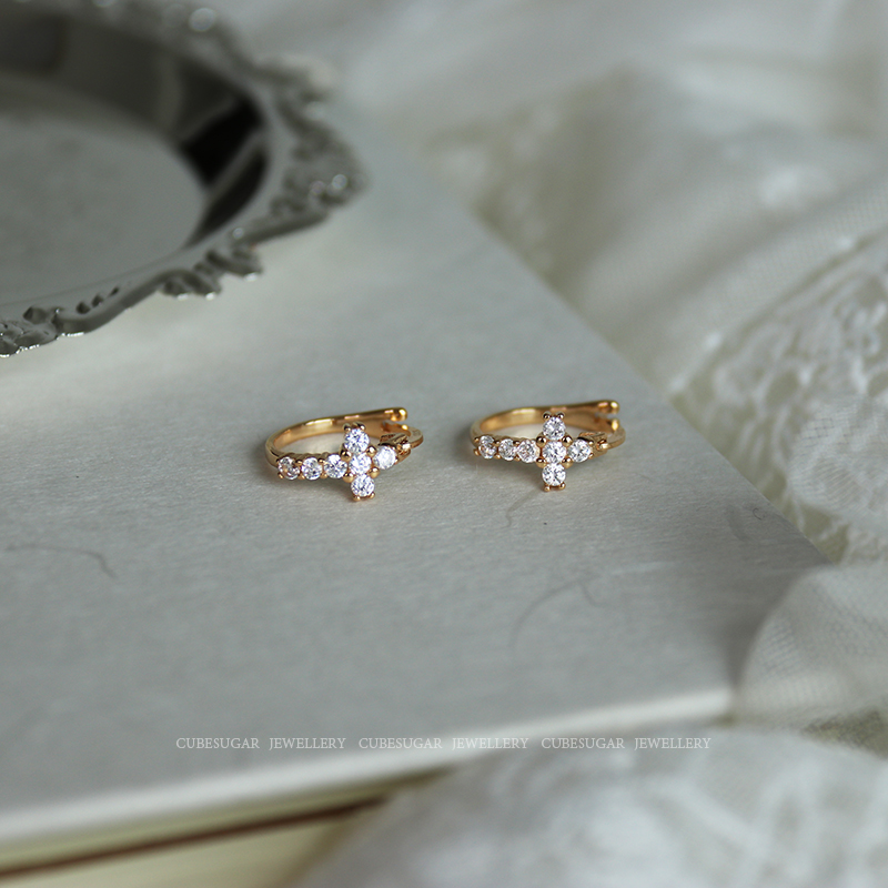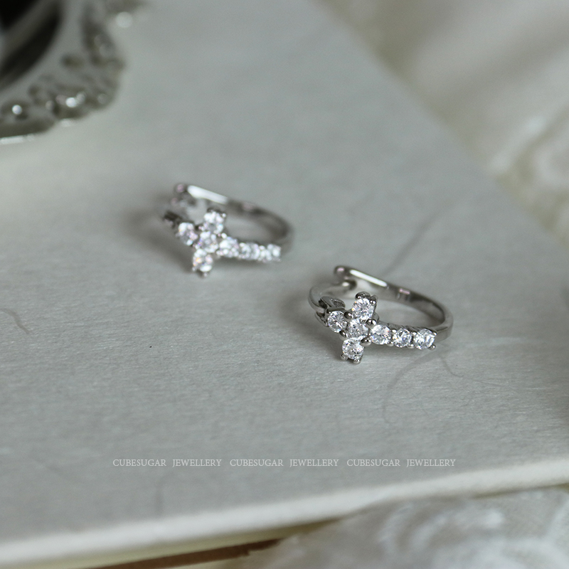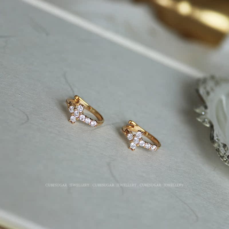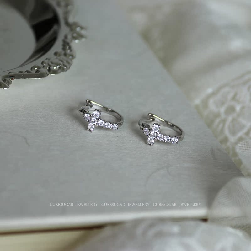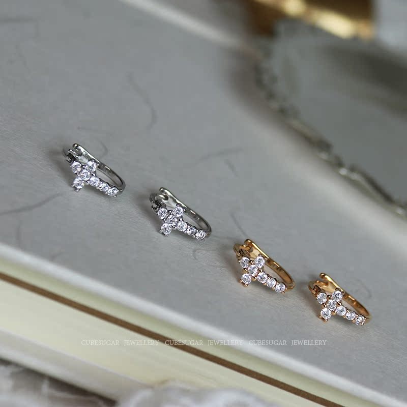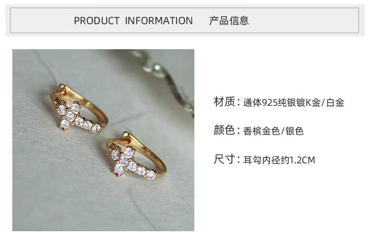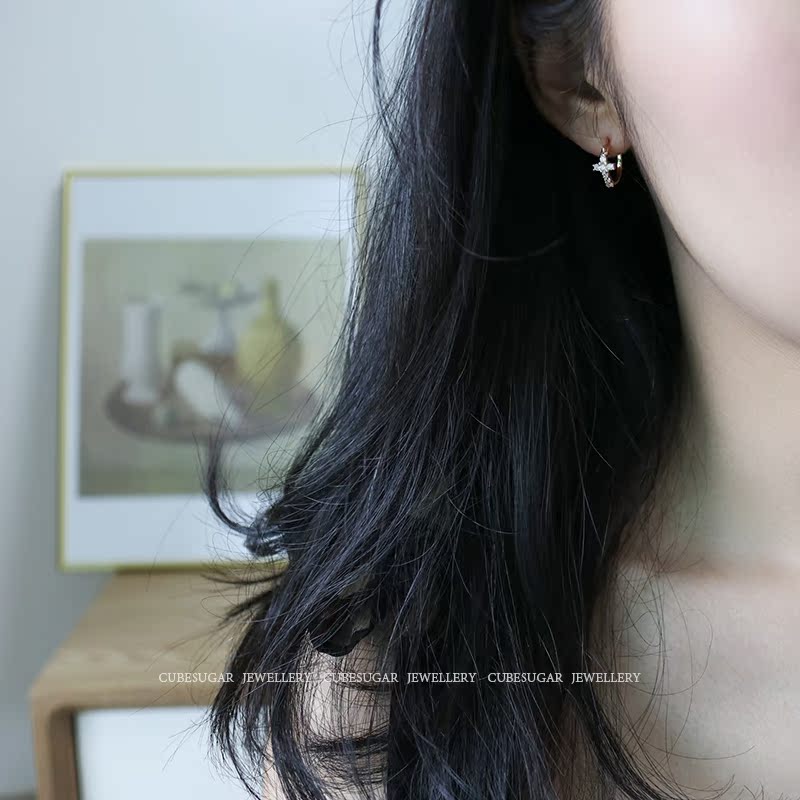 通體925純銀鑲鉆十字架耳扣精致鋯石簡約個性時尚氣質韓國耳環1入