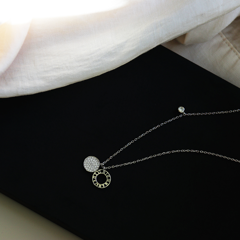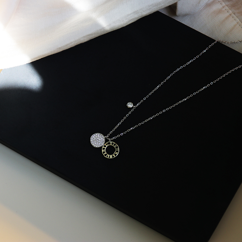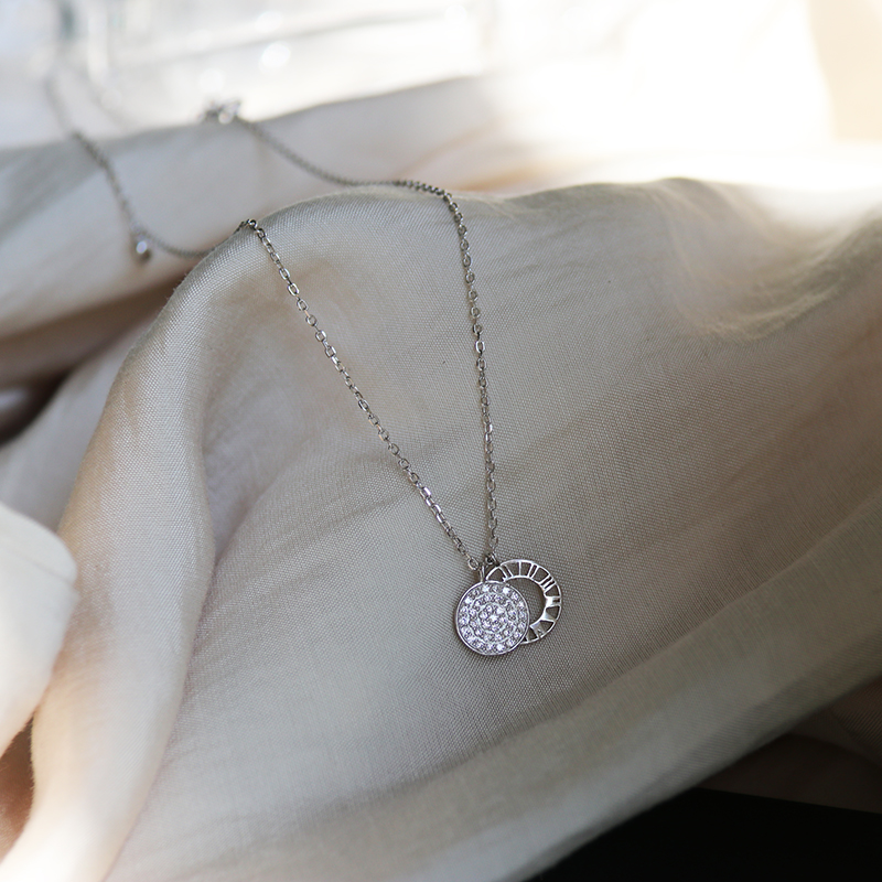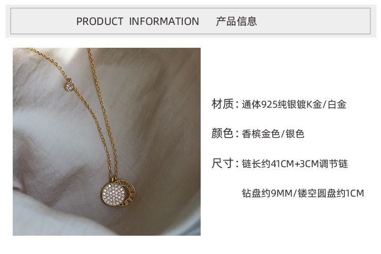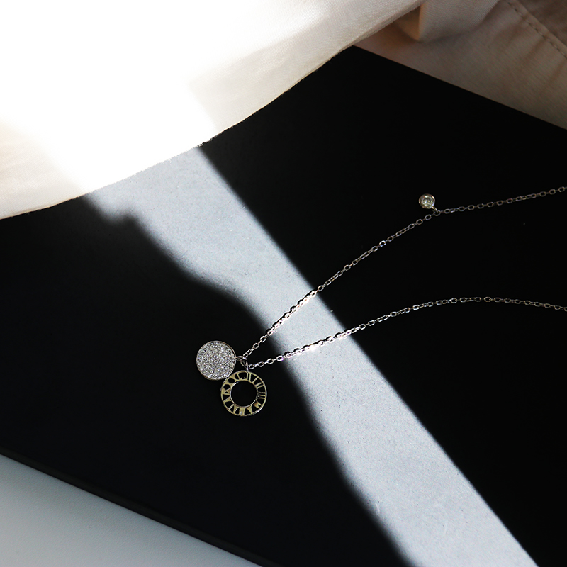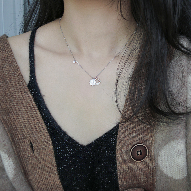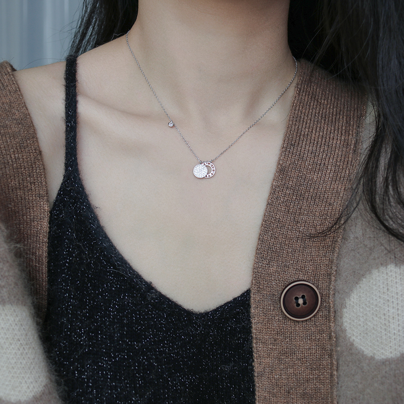 設計感通體925純銀幾何圓形鑲鉆項鏈韓國個性小眾圓牌百搭鎖骨鏈1入