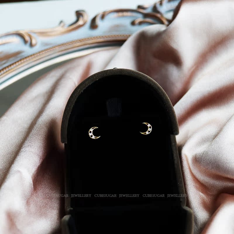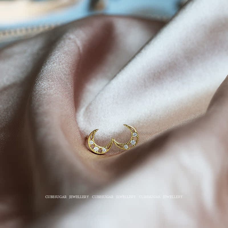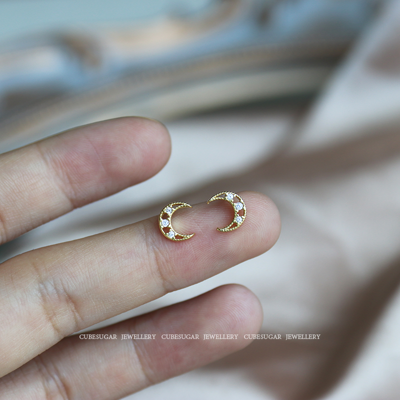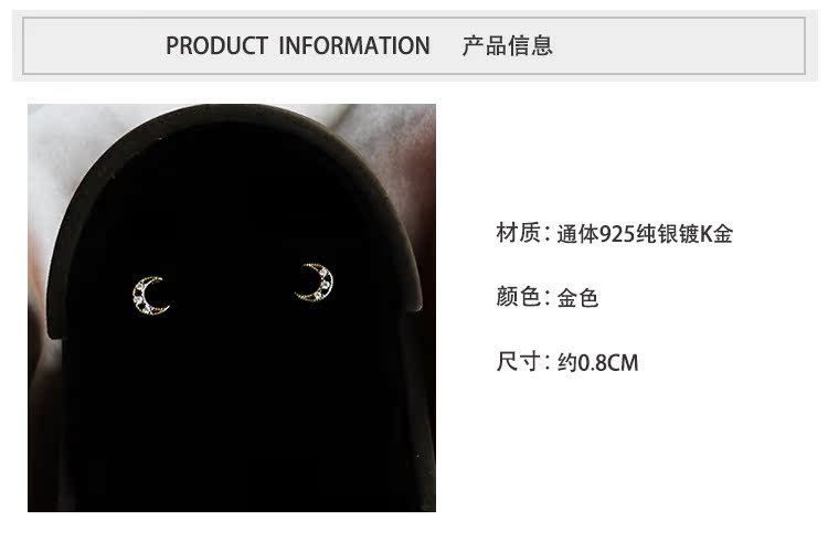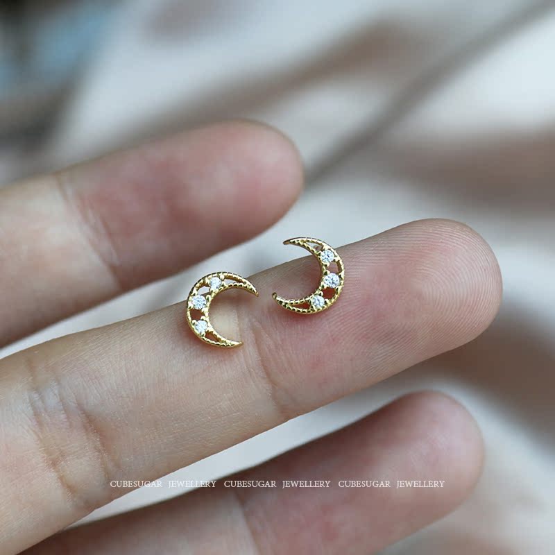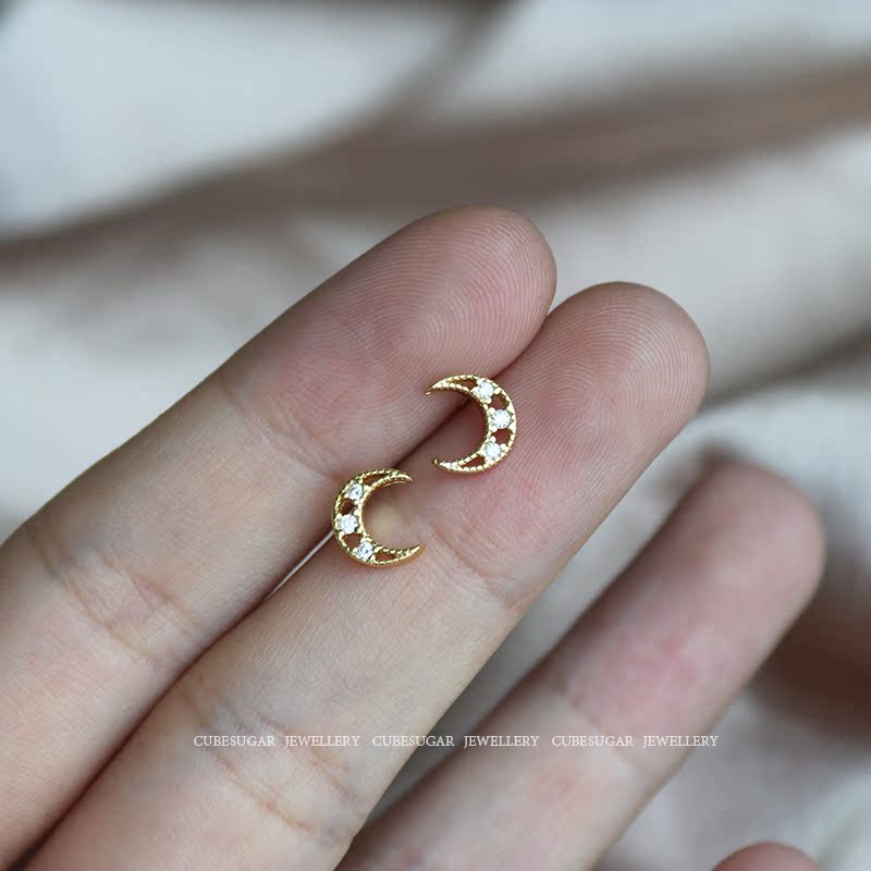 通體925純銀鏤空鑲鉆月亮耳環復古可愛氣質迷你小耳垂適合的耳釘1入