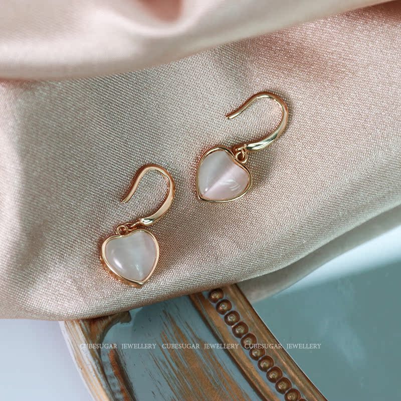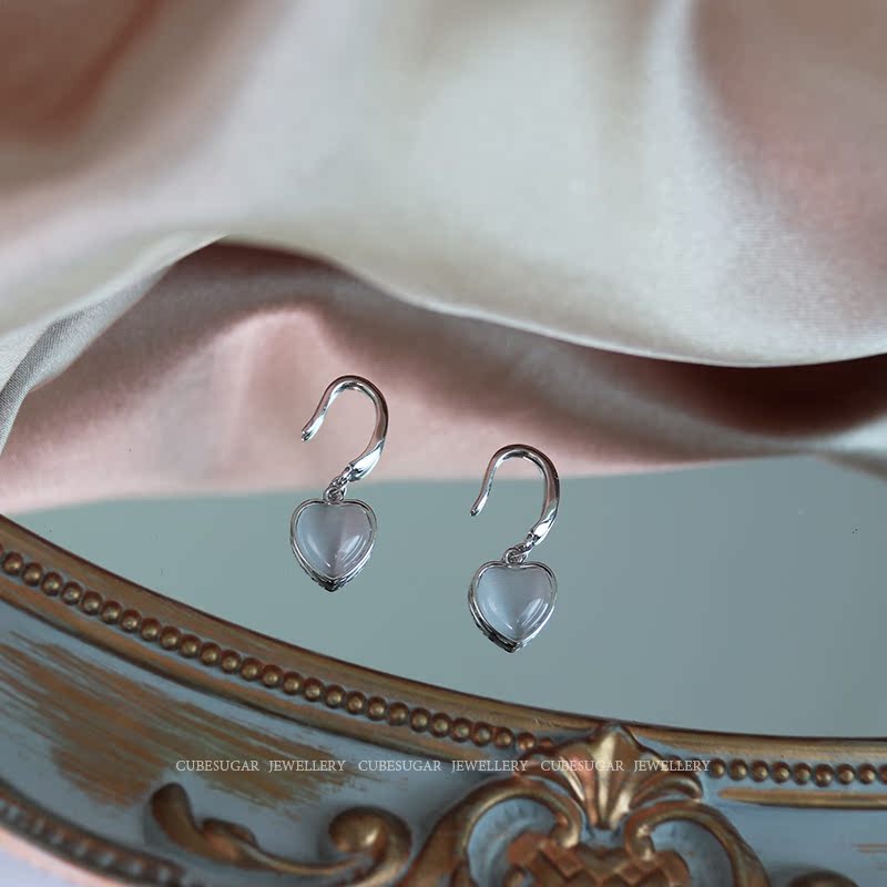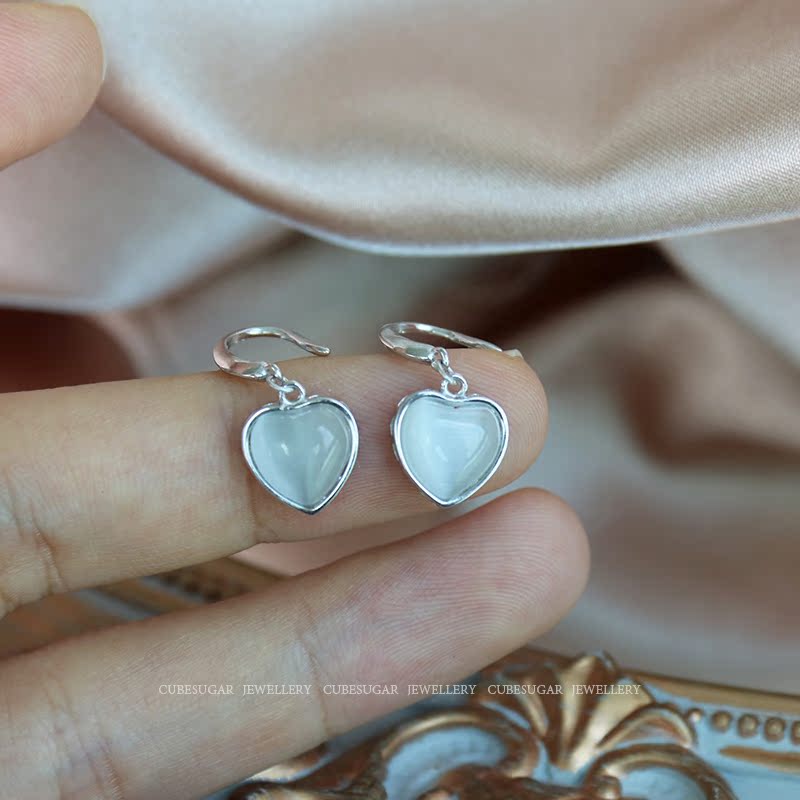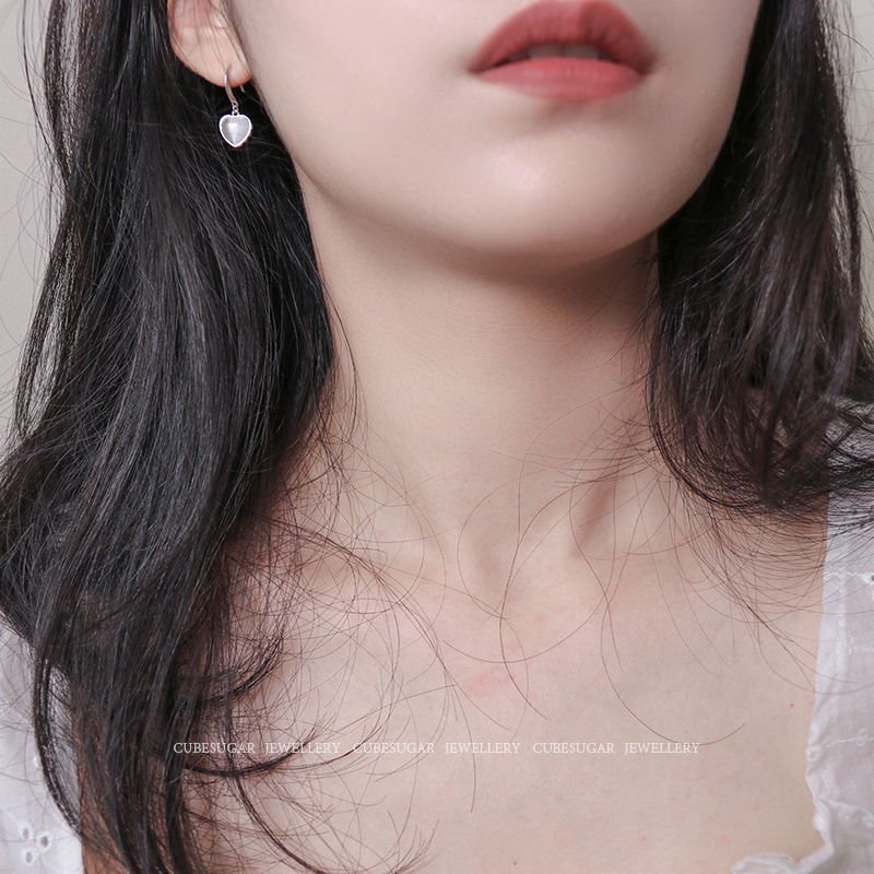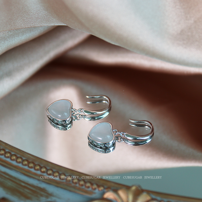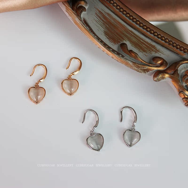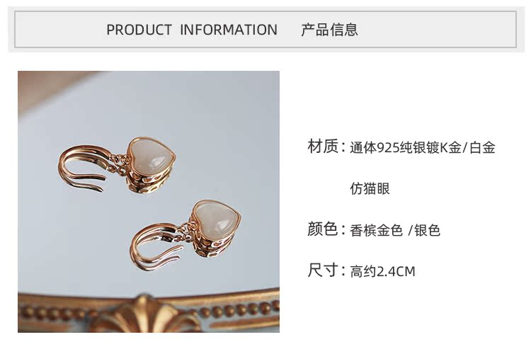 通體925純銀愛心仿貓眼石耳環簡約氣質法式輕奢高級感復古耳勾1入