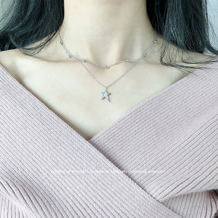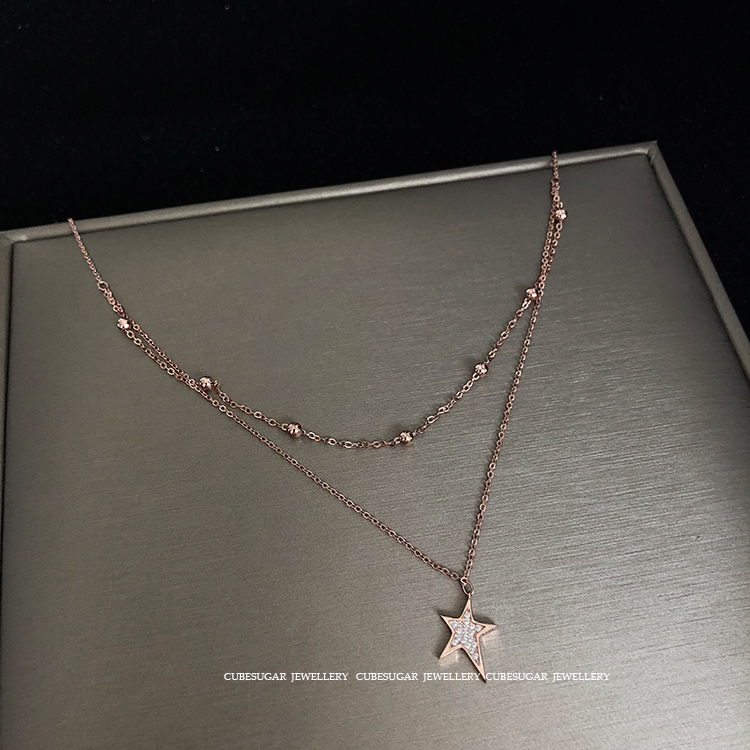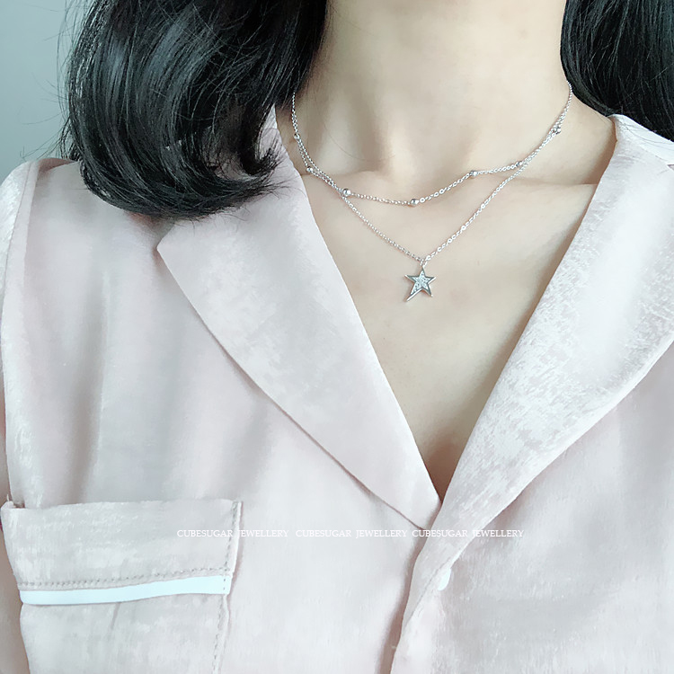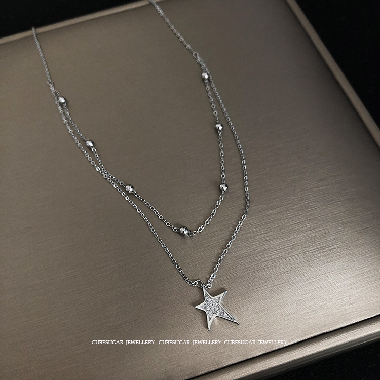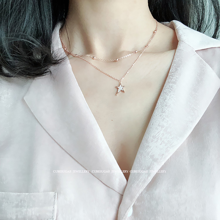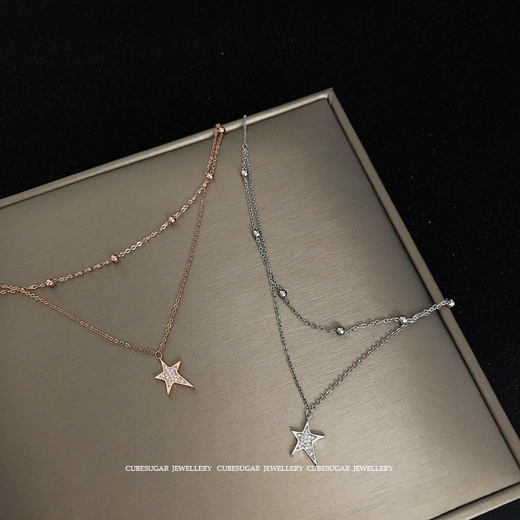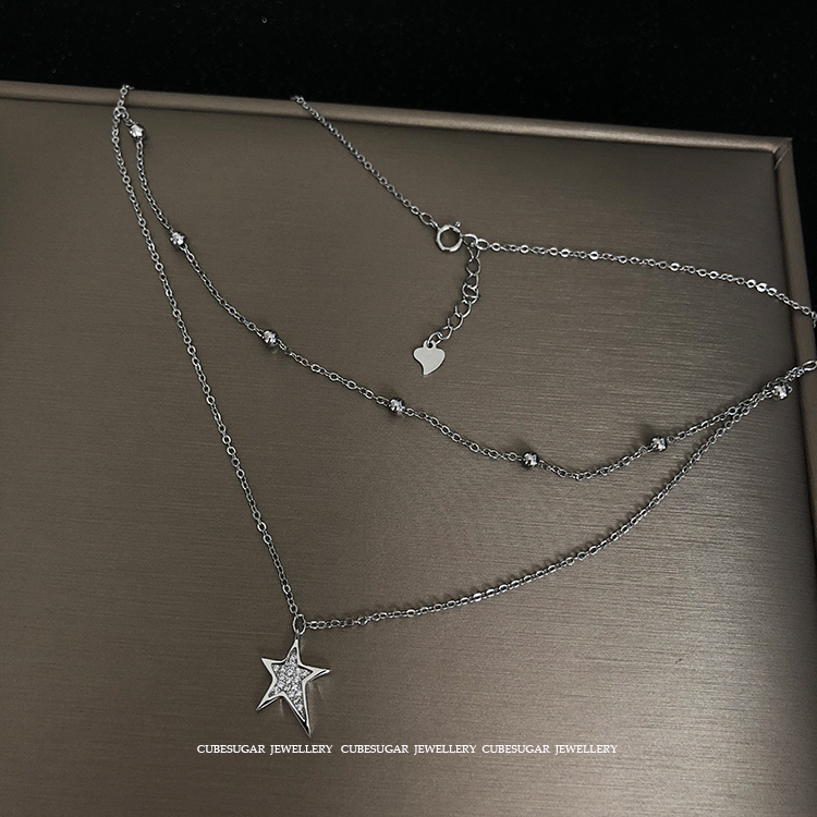 雙層。通體925純銀鍍白金/玫瑰金不規則滿鉆五角星吊墜珠鏈鎖骨鏈1入