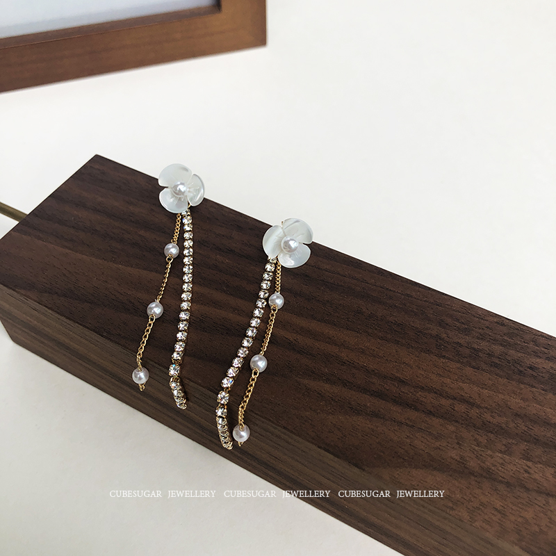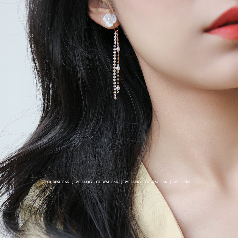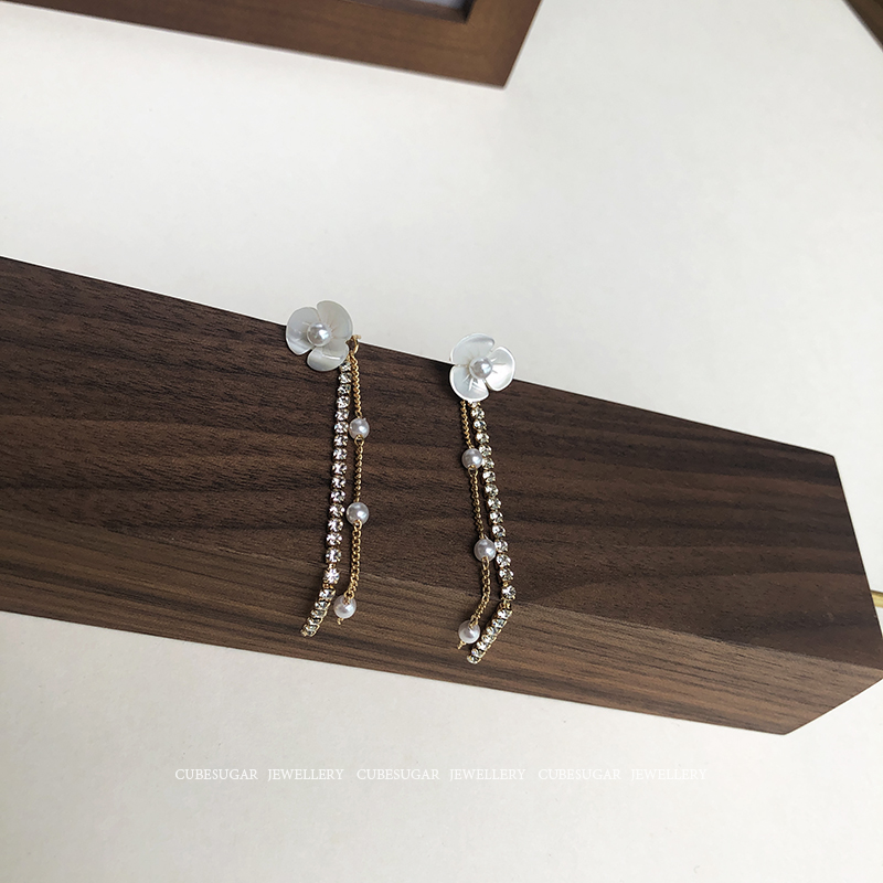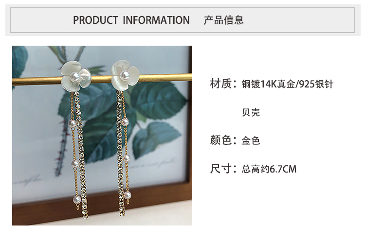 鍍14K真金925銀針貝殼花朵長鉆耳環森系小眾流蘇超閃氣質 顯臉瘦1入