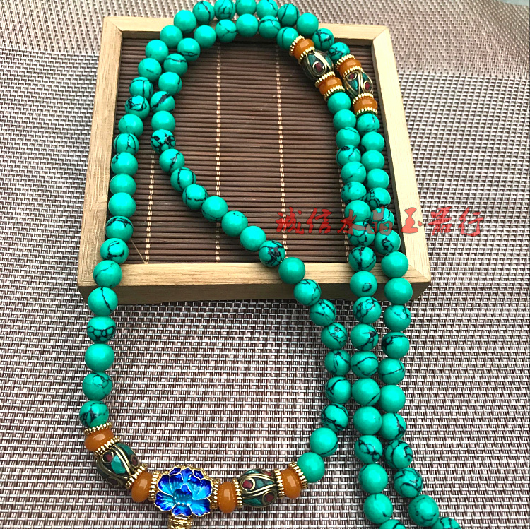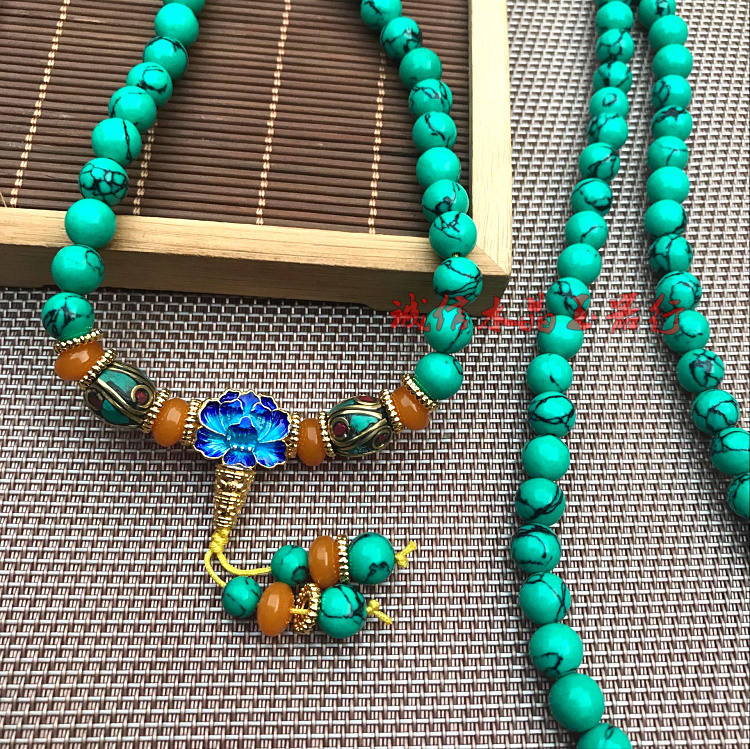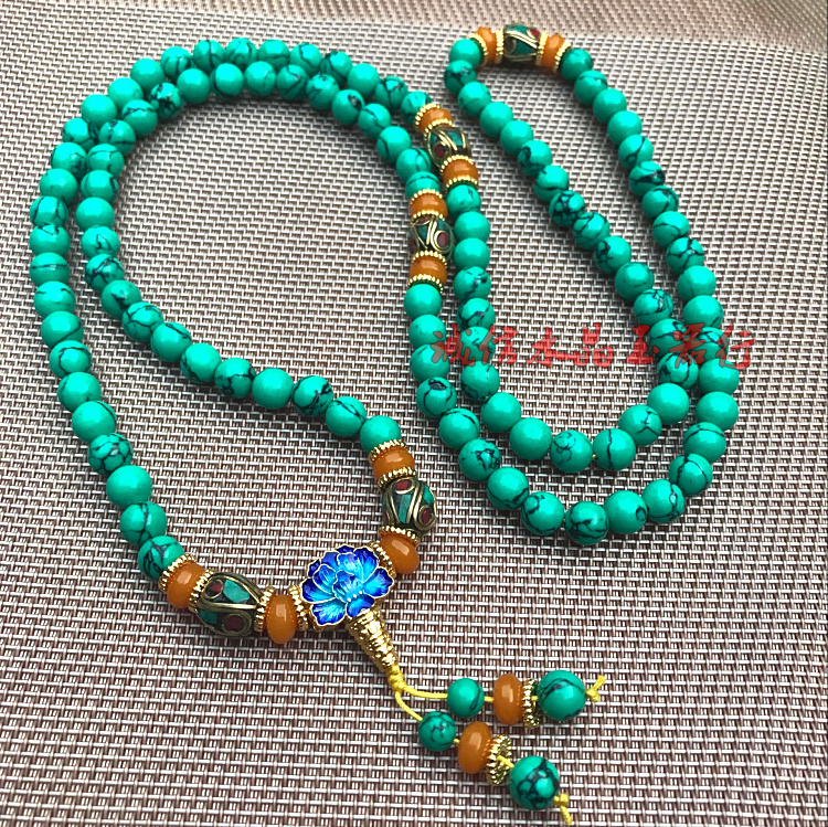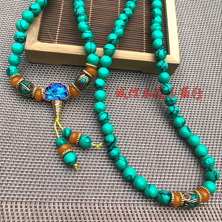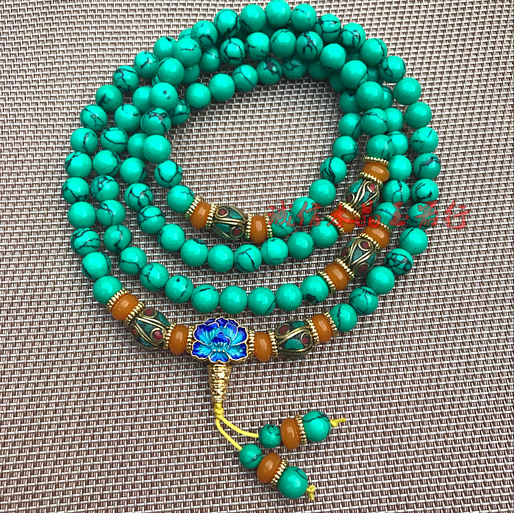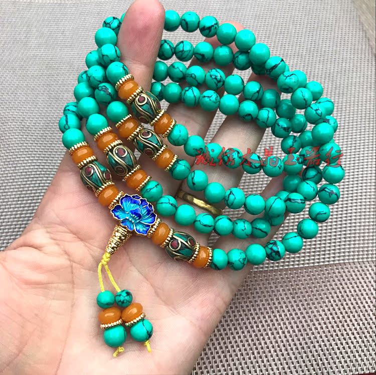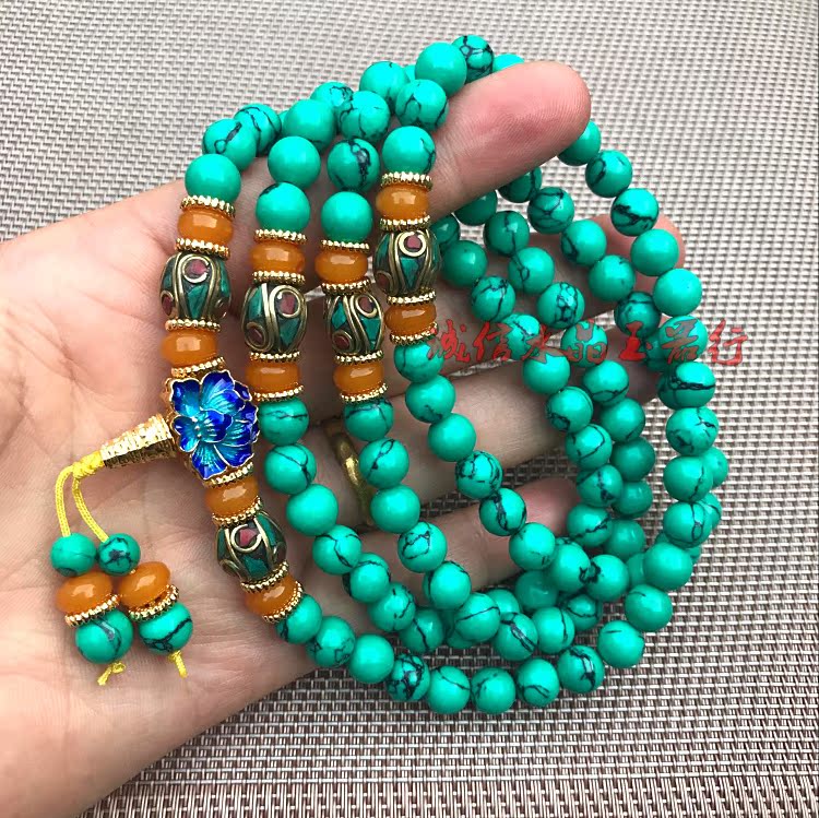 藏式尼泊爾佛珠手鏈108顆綠松石手串蜜蠟藏式黃銅佛頭手鏈1入