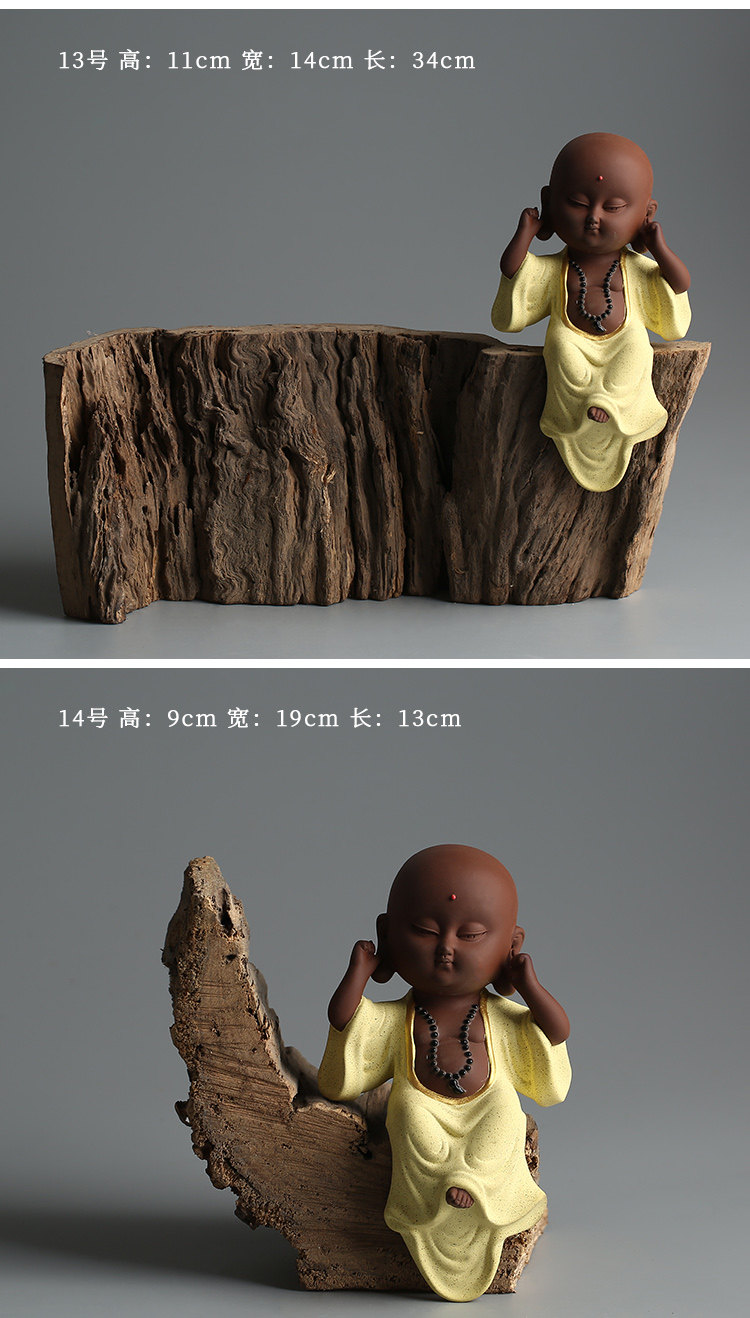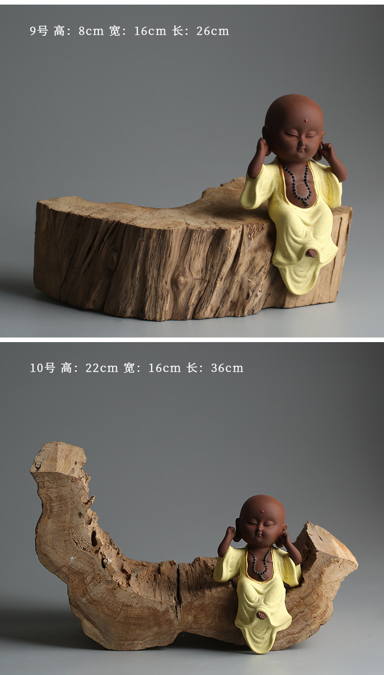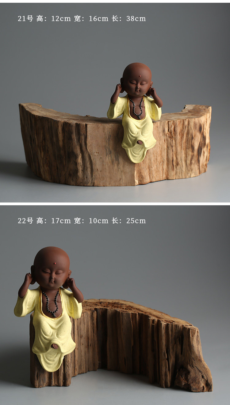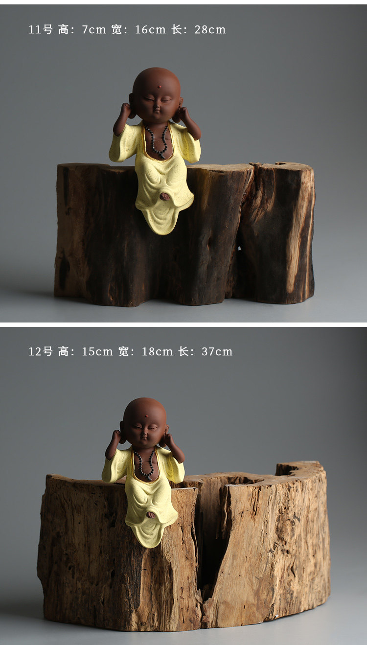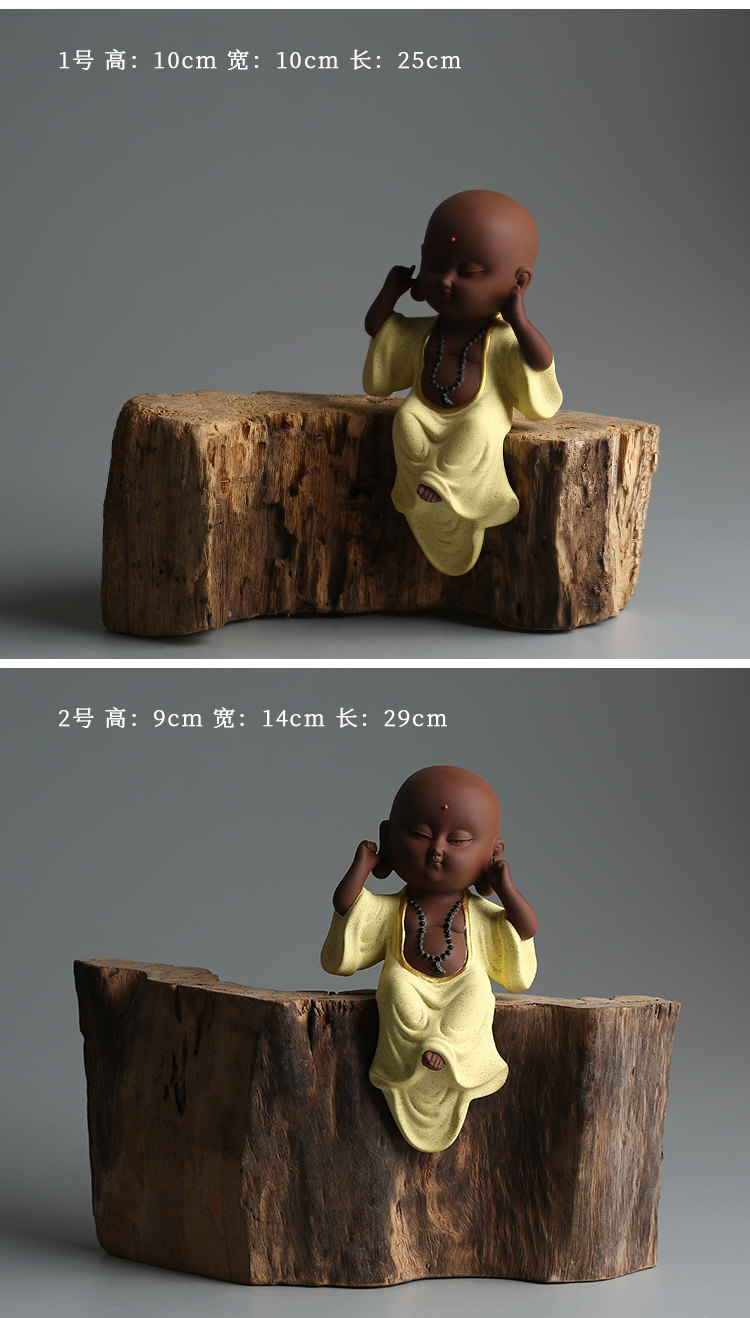 棲鳳居 新中式禪意手工陶瓷沙彌風化木底座 創意家用裝飾品根擺件1入