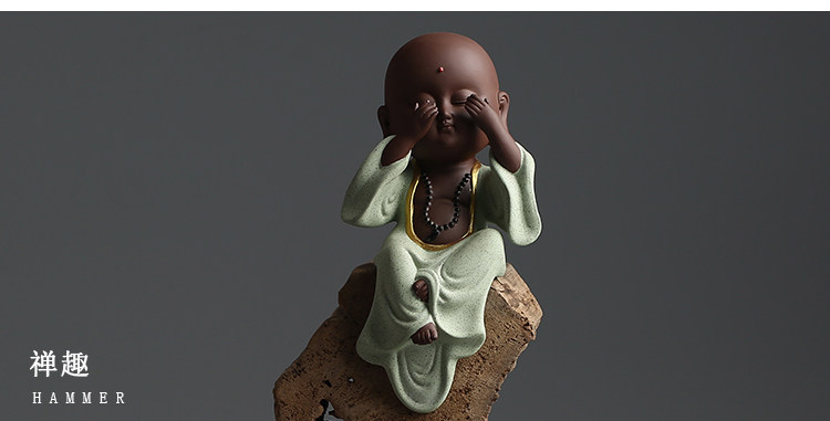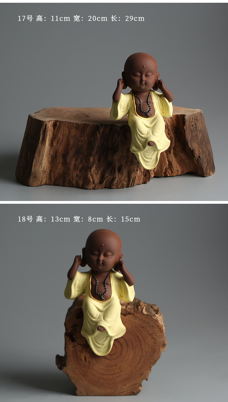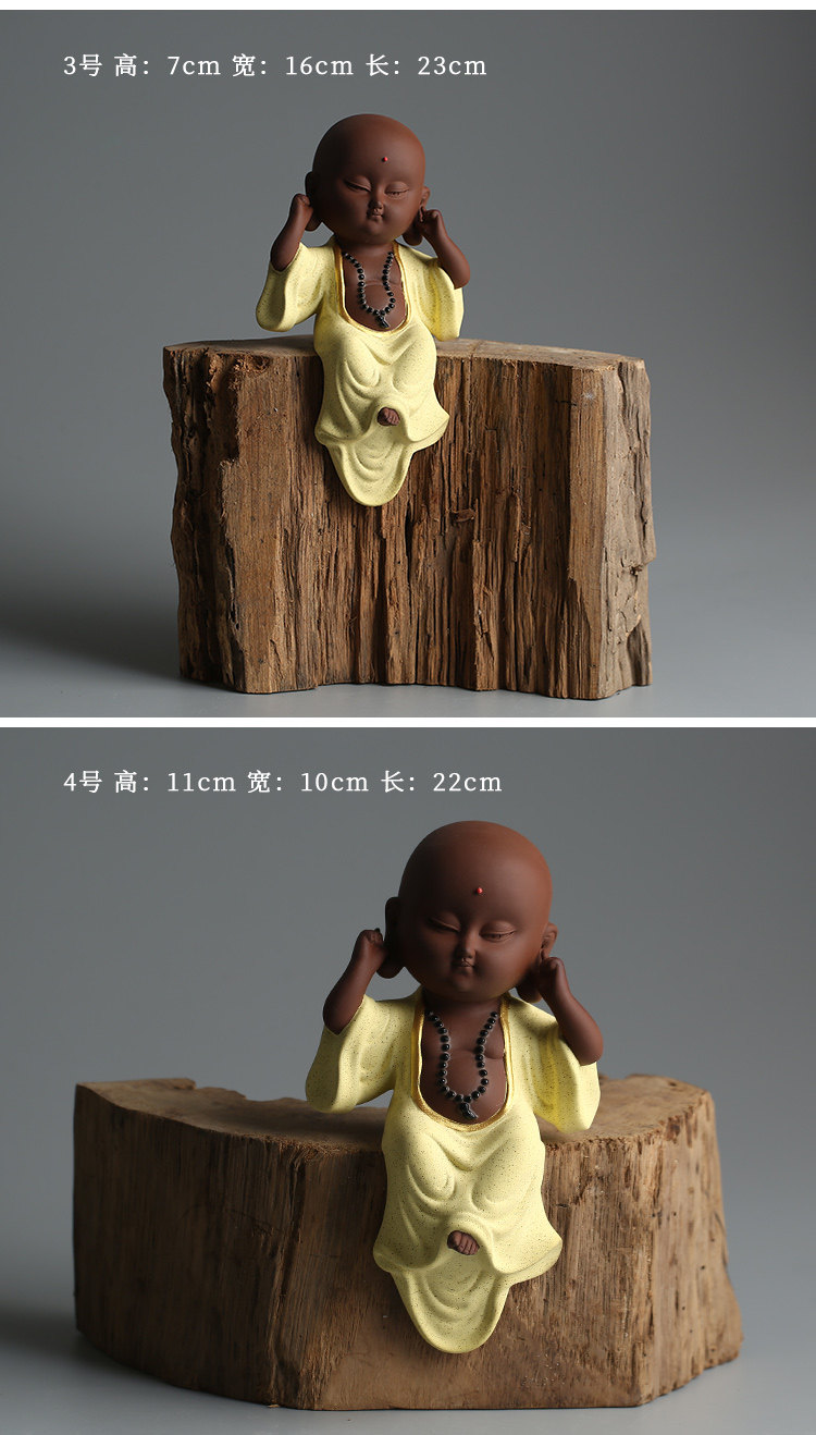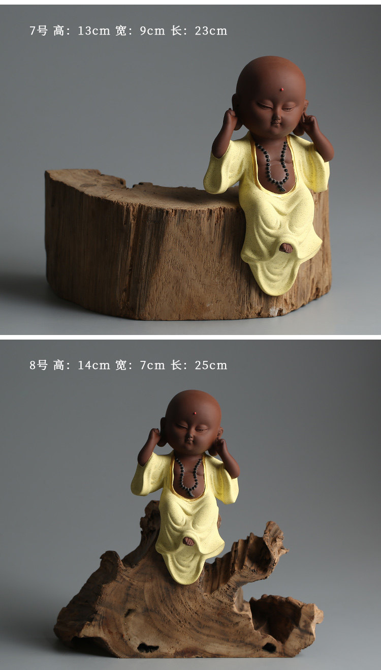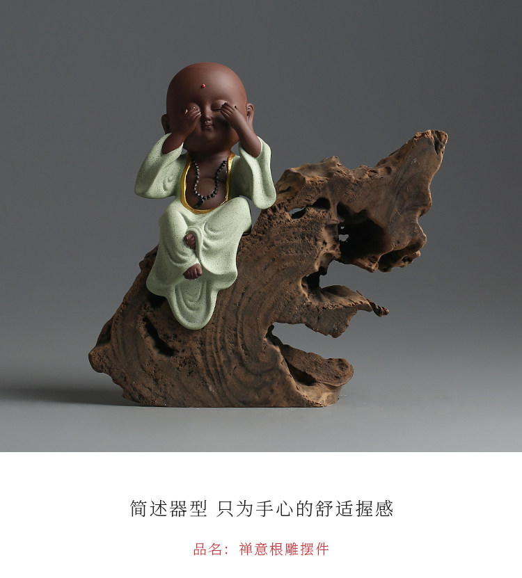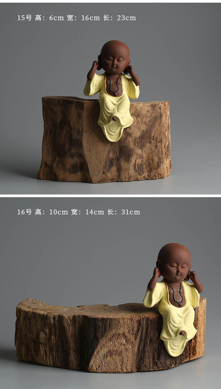 棲鳳居 新中式禪意手工陶瓷沙彌風化木底座 創意家用裝飾品根擺件1入
