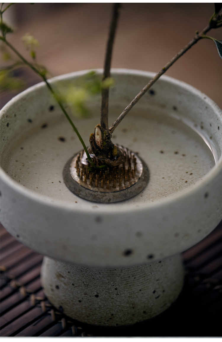 日式禪意花瓶茶道擺件小原流教學插花花器粗陶高足手工花盆1入