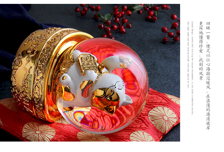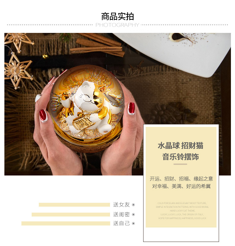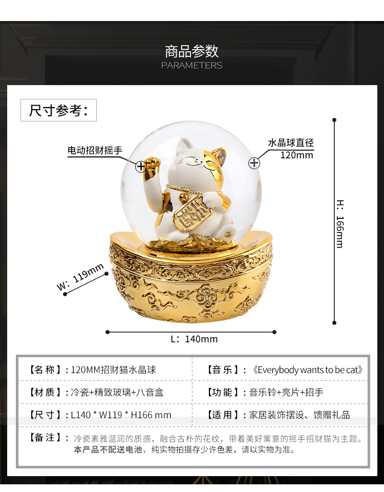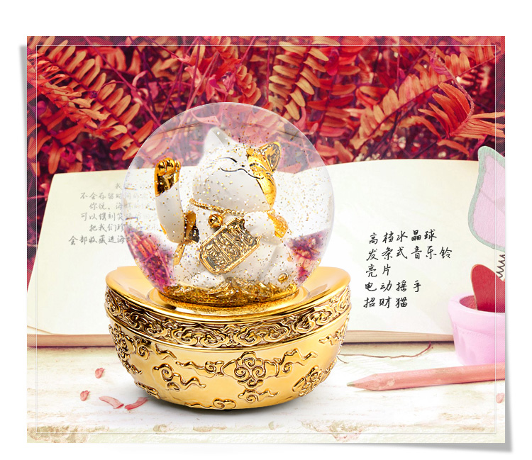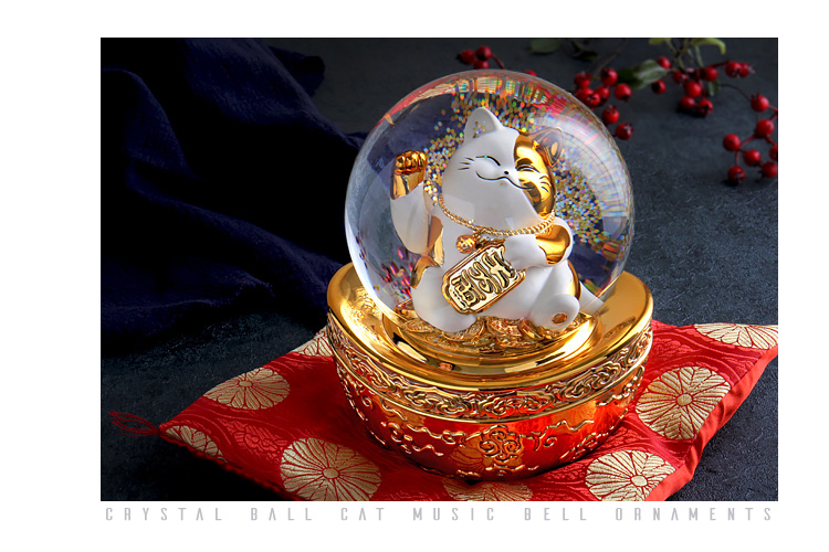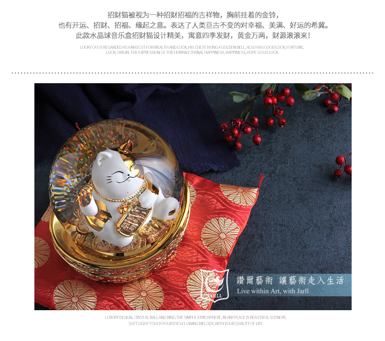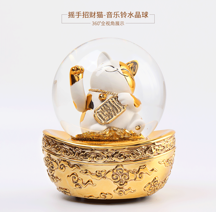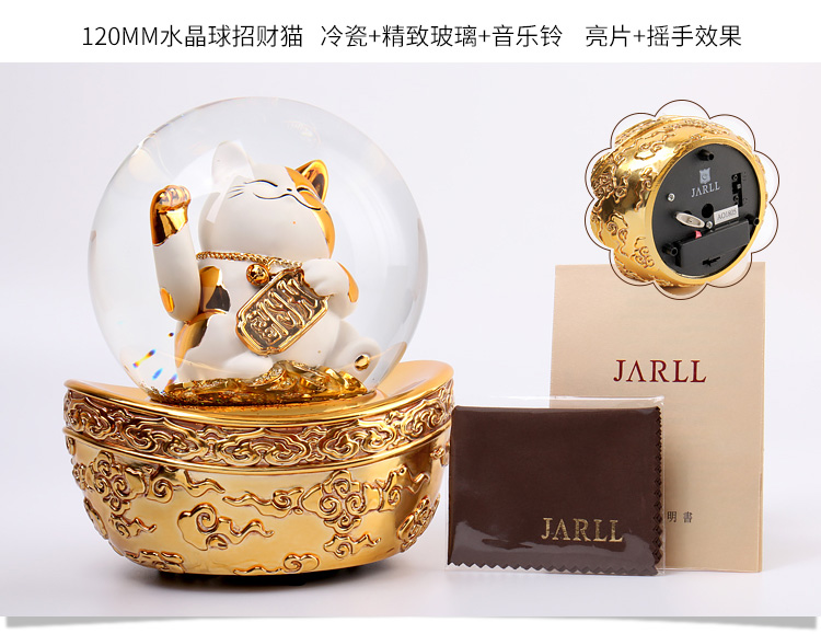 JARLL金色搖手招財貓水晶球音樂盒店鋪開業禮品創意收銀臺擺件1入