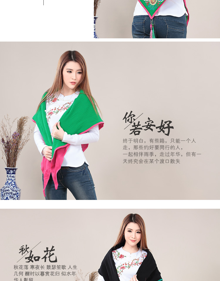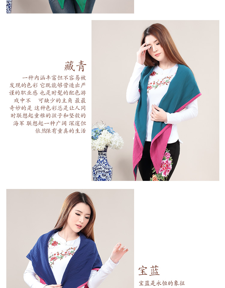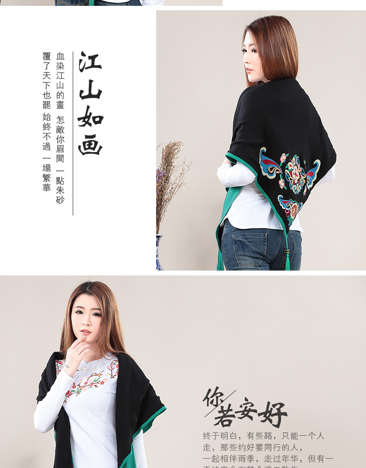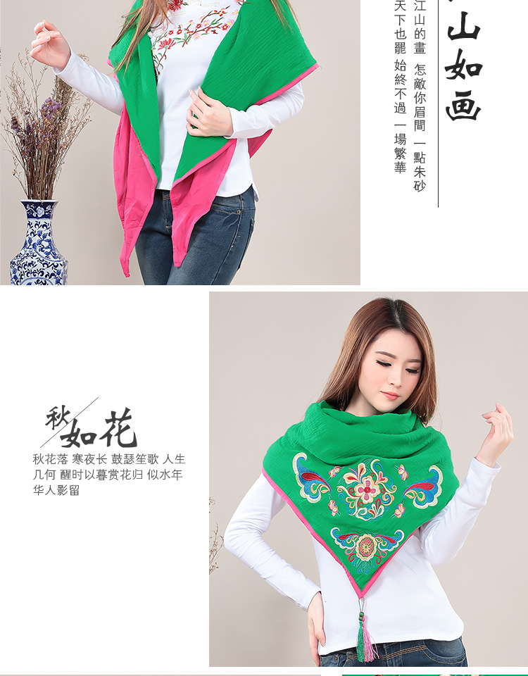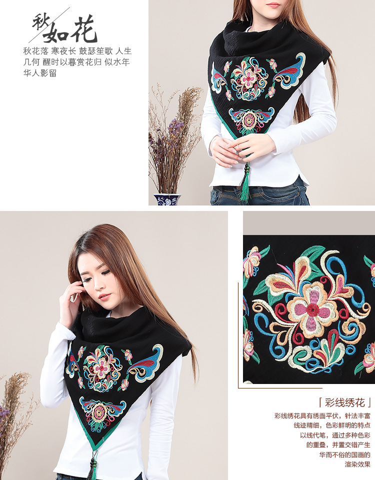 2019春秋冬季新款民族風圍巾配飾繡花披肩方巾復古棉麻圍巾披巾女1入