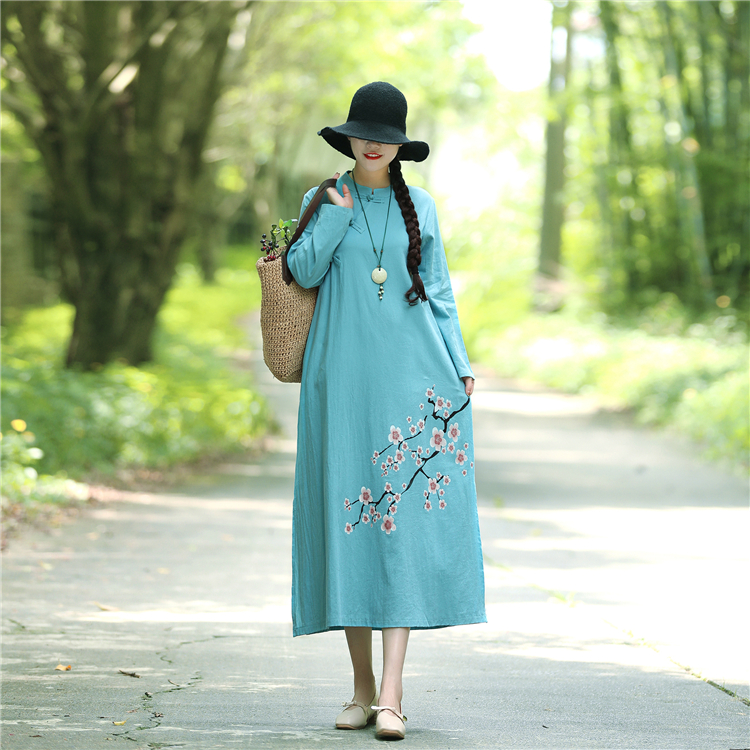 2019秋裝新款民族風女裝中式復古盤扣中國風長袖印花連衣裙長袖1入