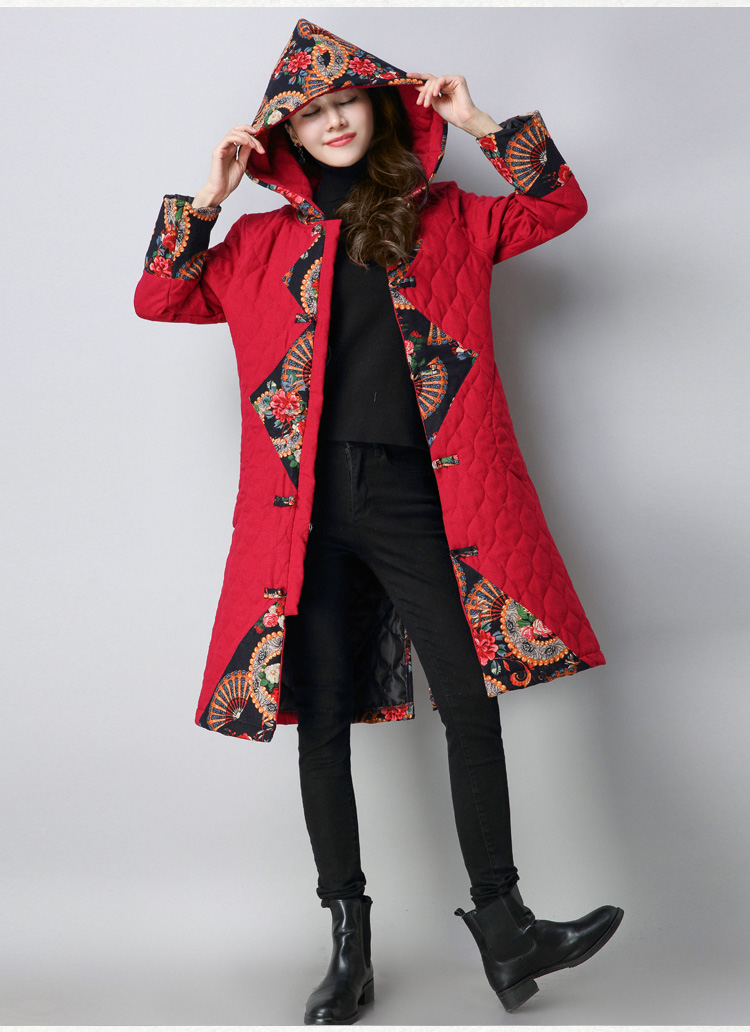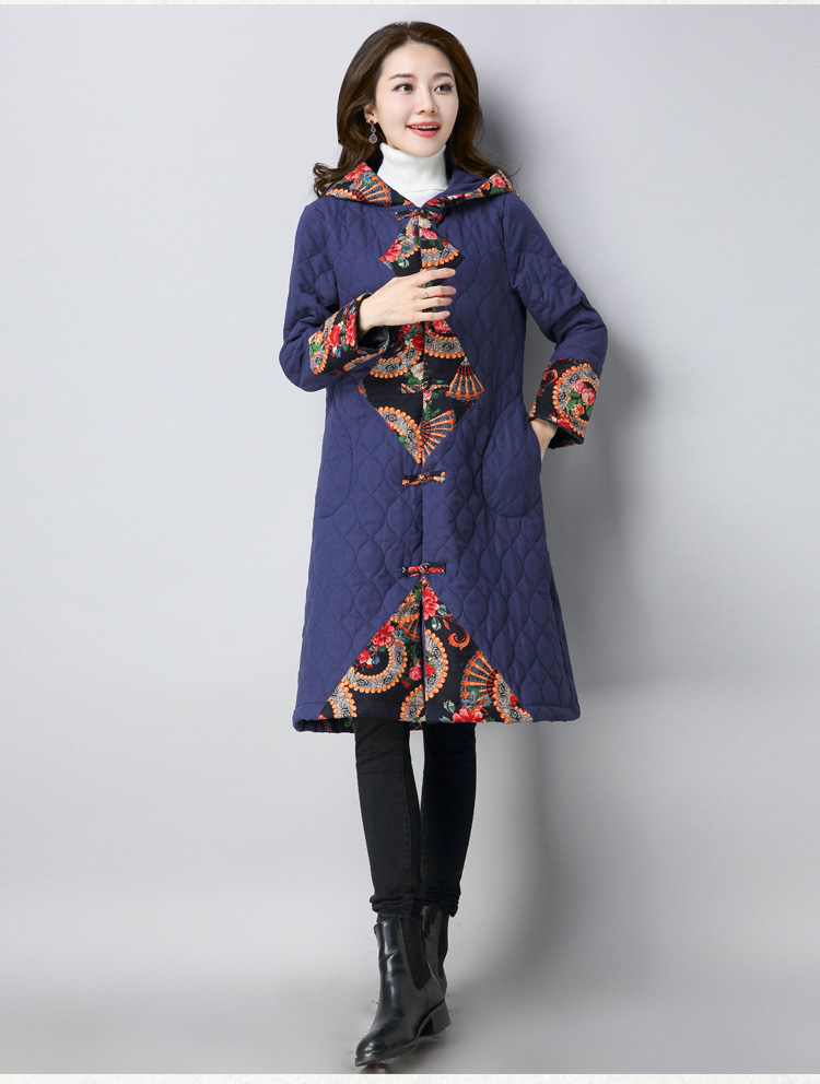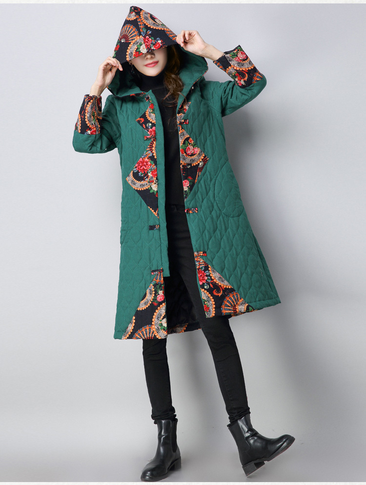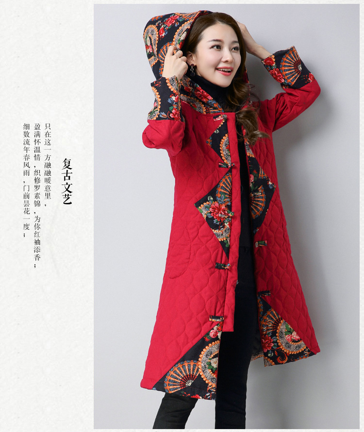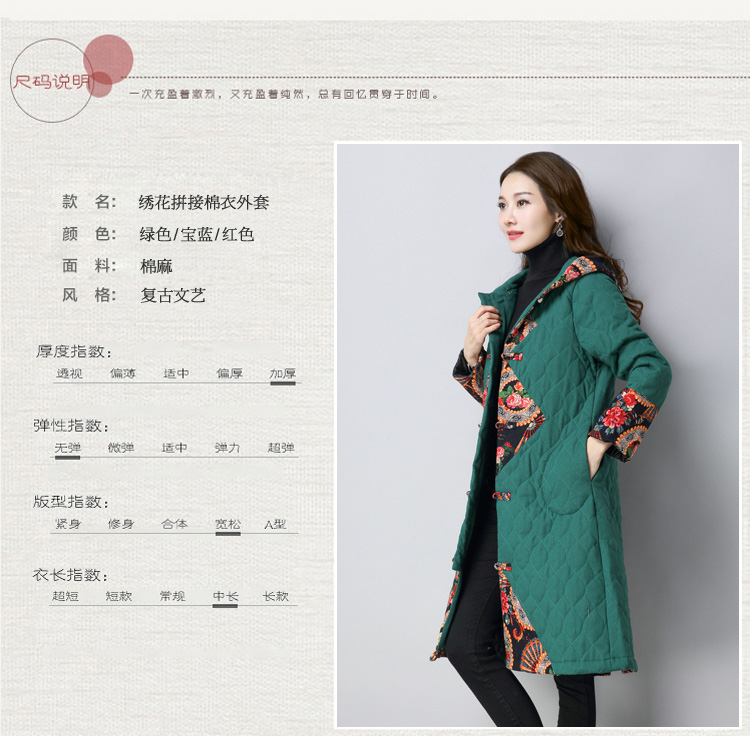 2019秋冬裝新款民族風女裝復古大碼貼布連帽加長加厚棉麻棉衣外套1入