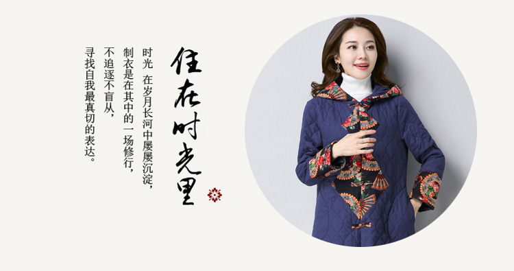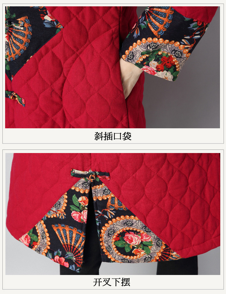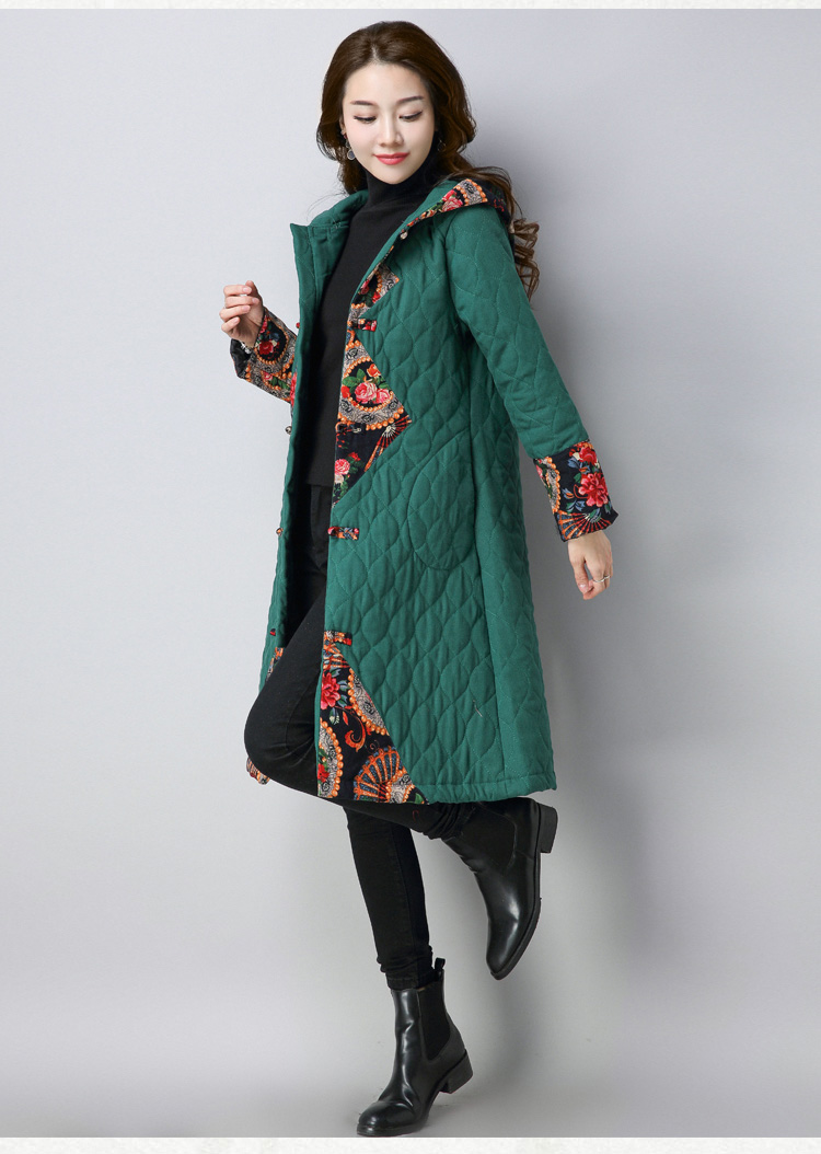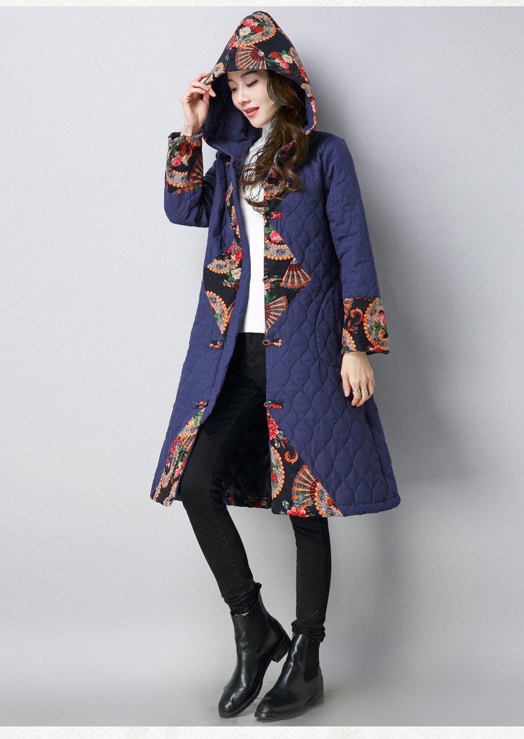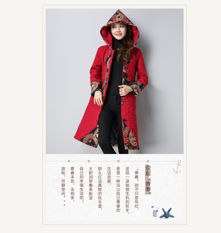 2019秋冬裝新款民族風女裝復古大碼貼布連帽加長加厚棉麻棉衣外套1入
