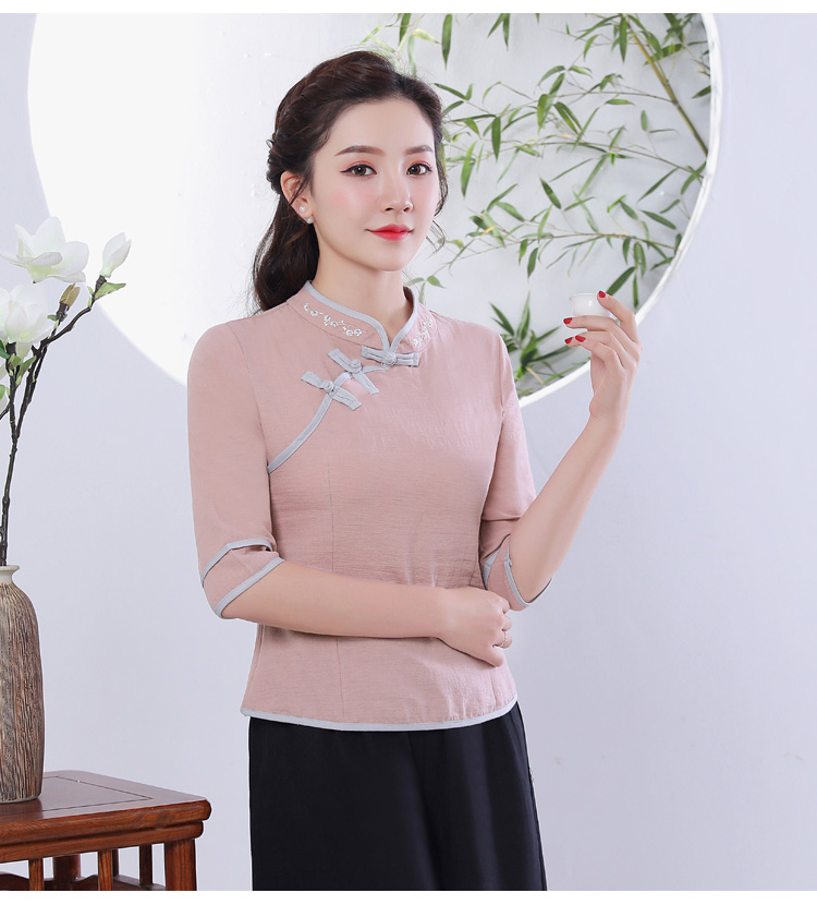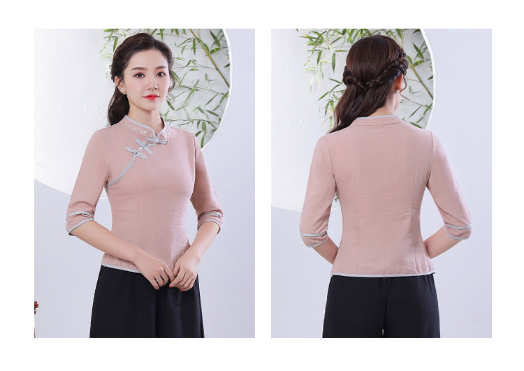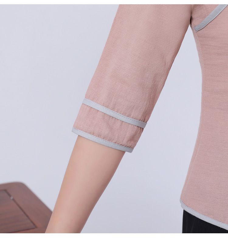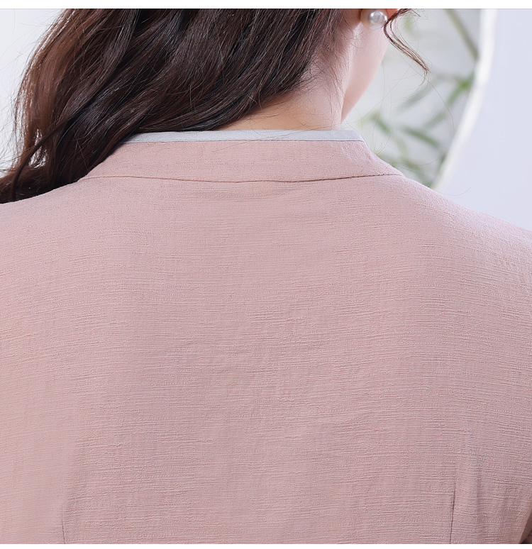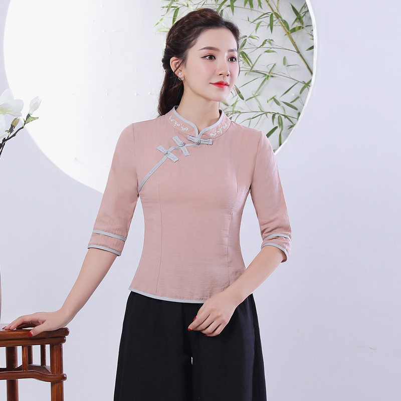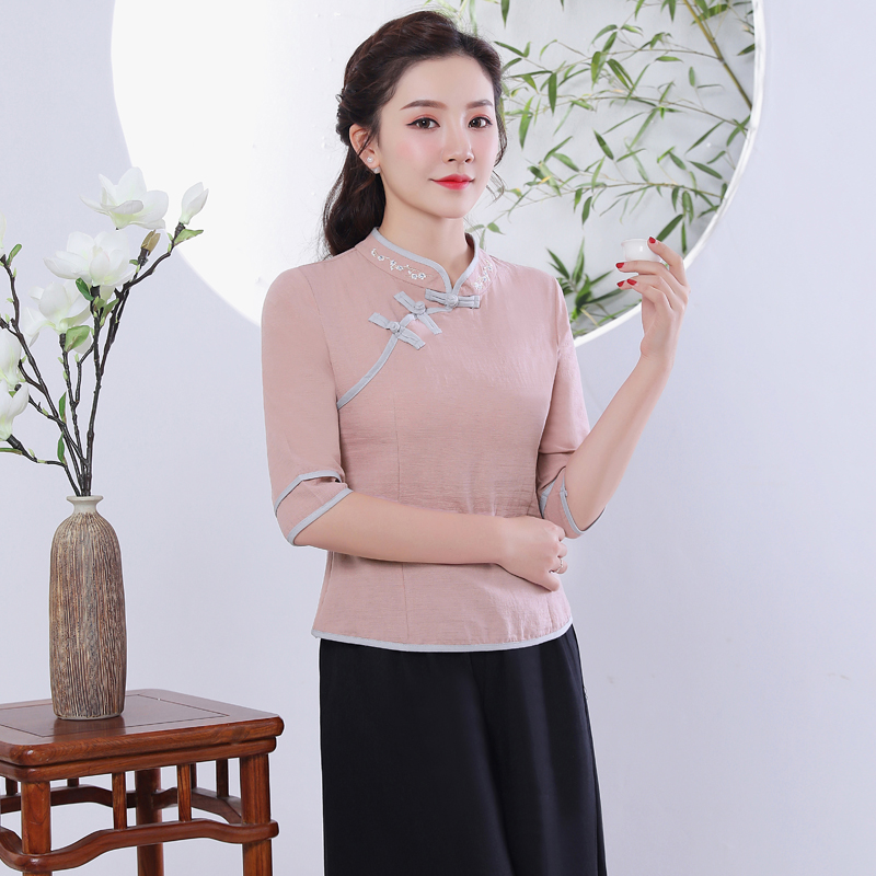 2019春夏季新款原創民族風棉麻上衣中式民國風立領盤扣修身襯衣女1入