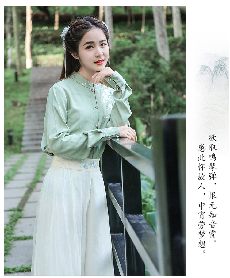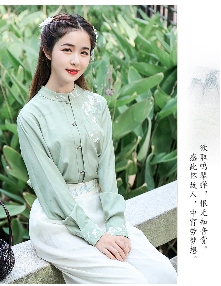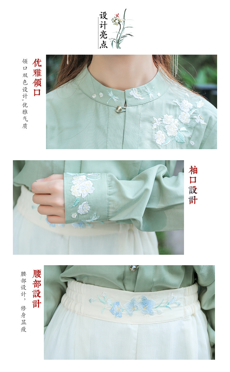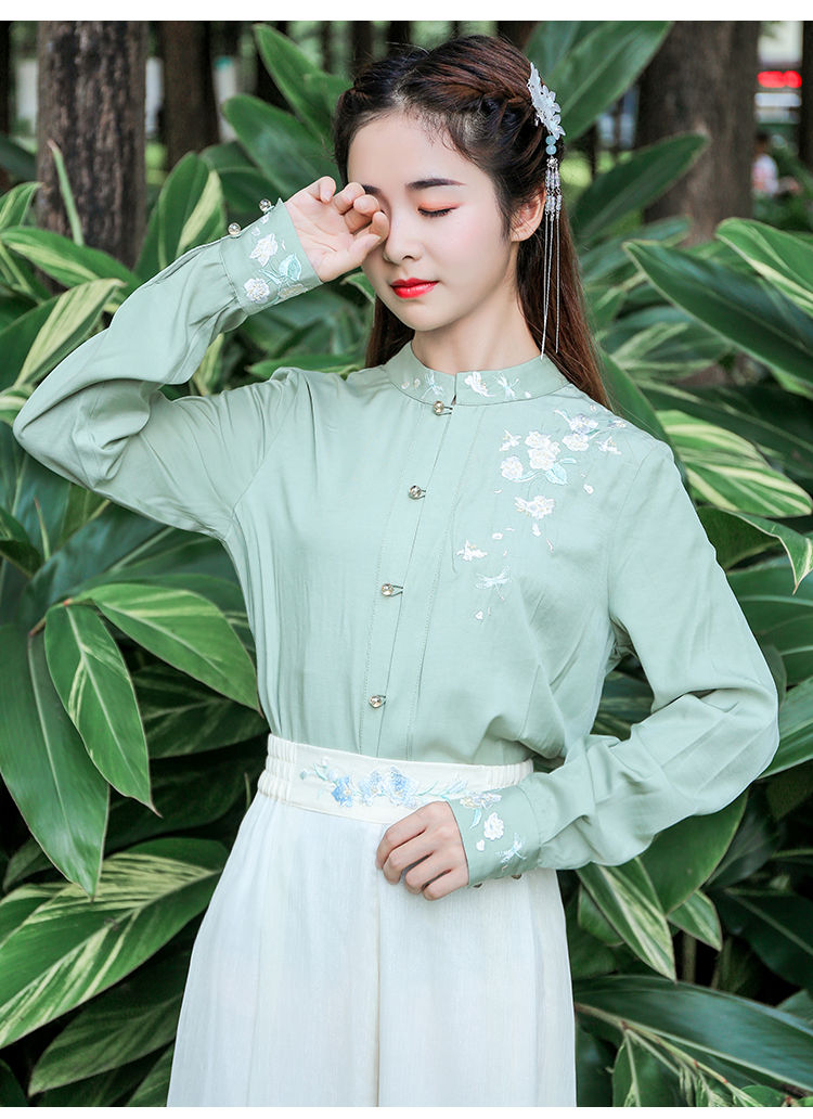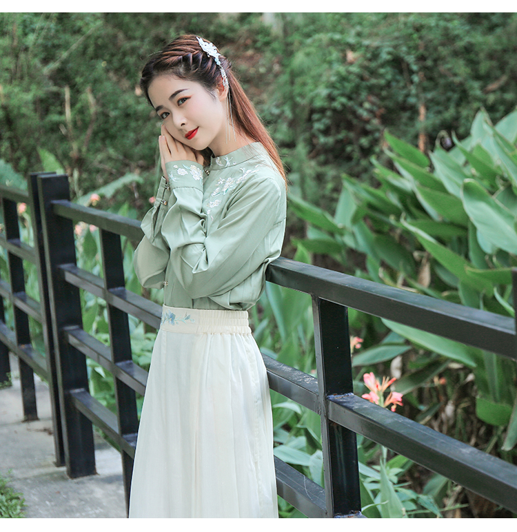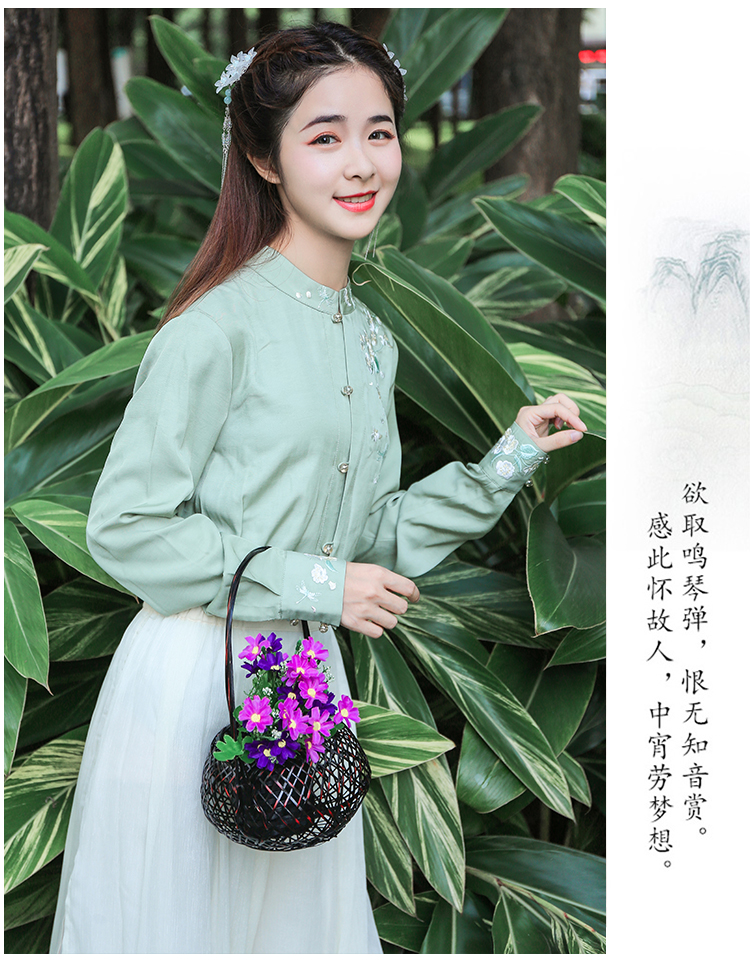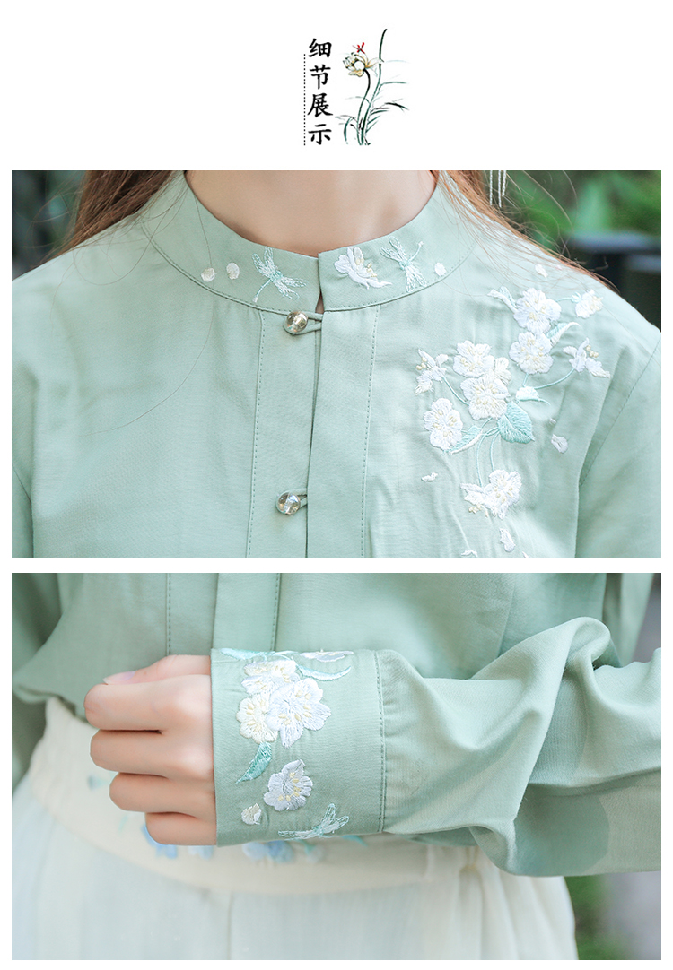 2019秋季新款文藝復古清新刺繡上衣立領漢服改良長袖襯衫女打底衫1入