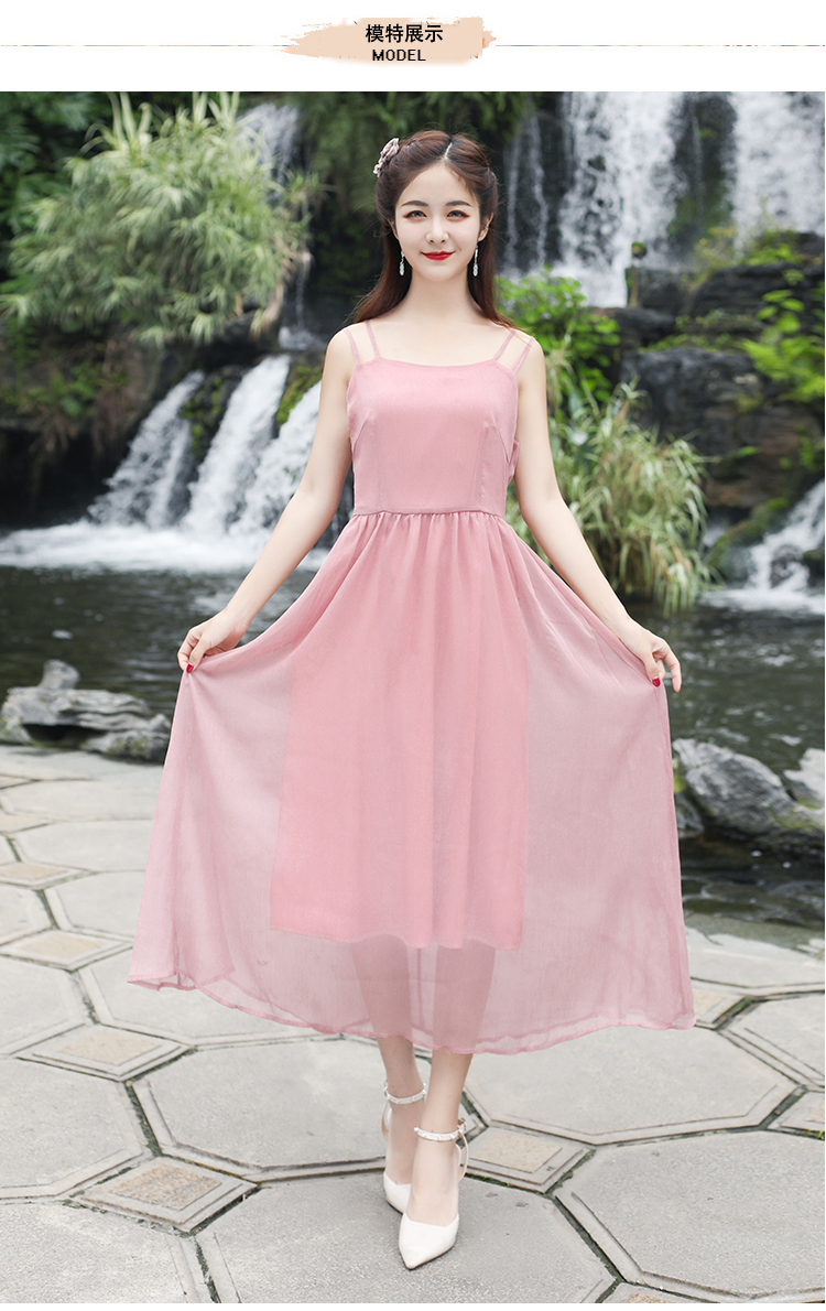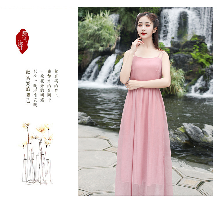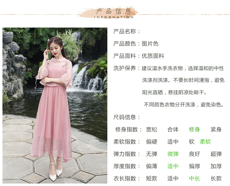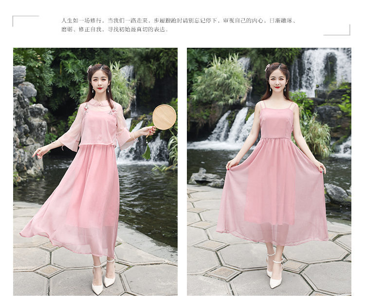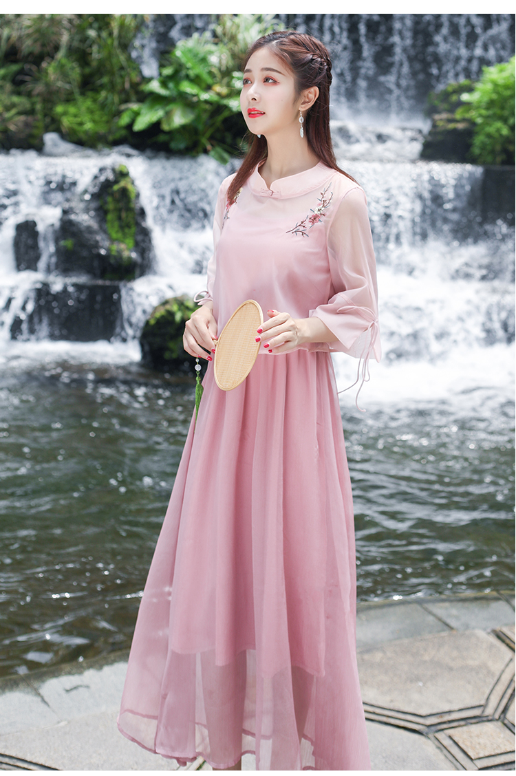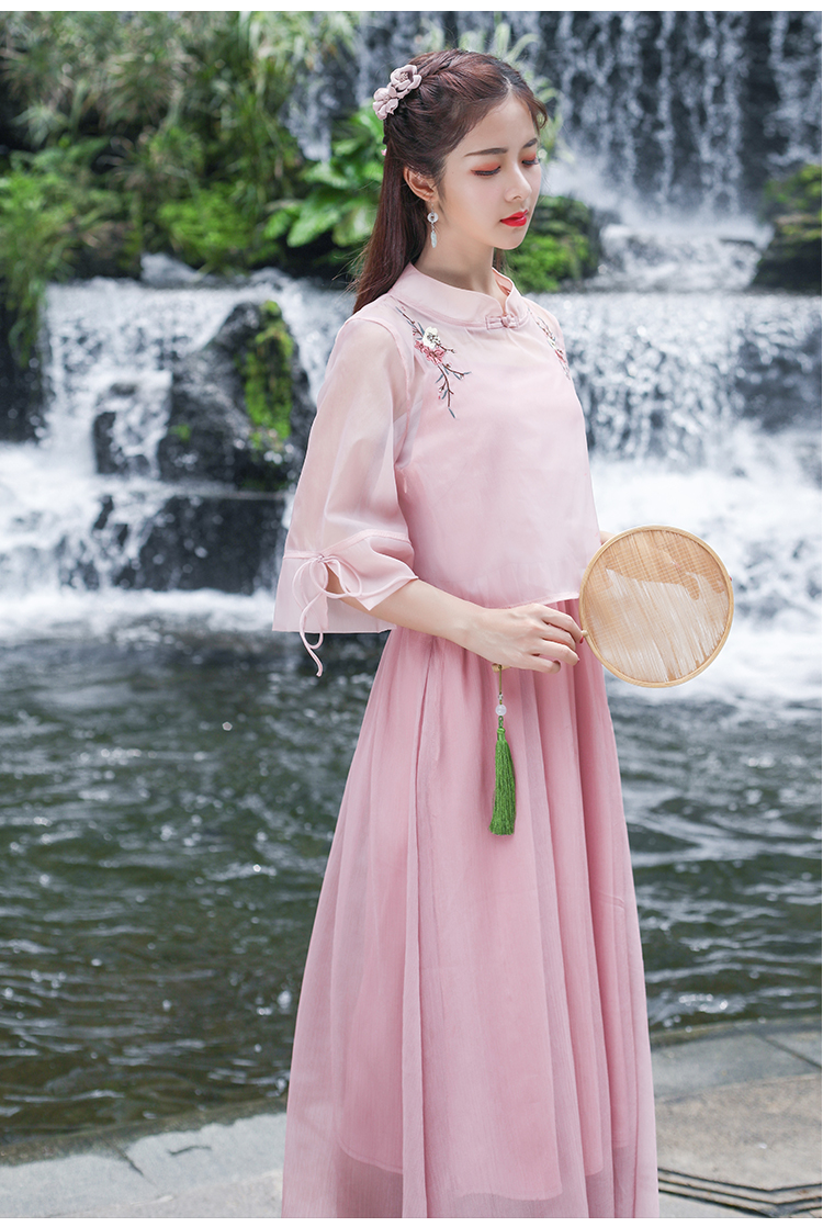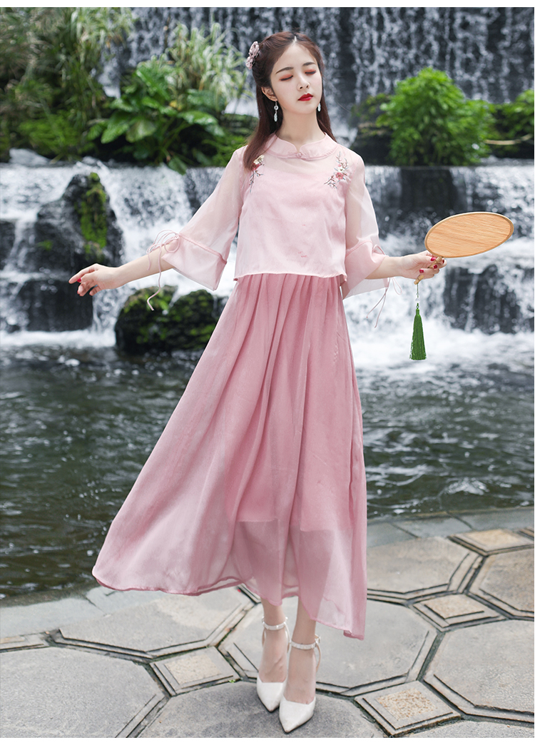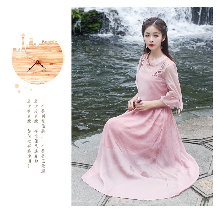 2019夏季新款文藝復古漢服長款刺繡漢元素清新溫柔風初戀連衣裙1入