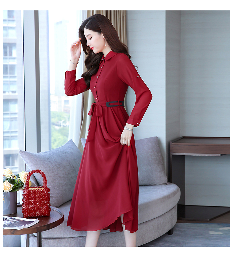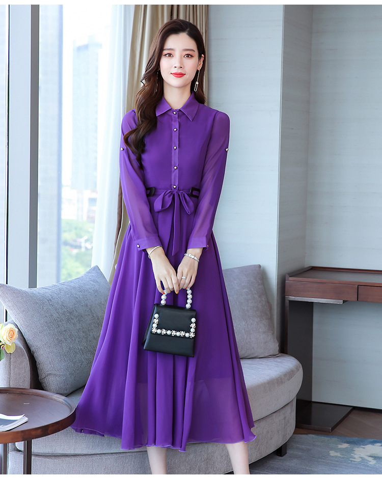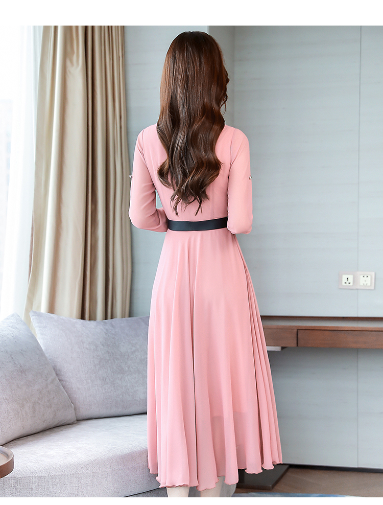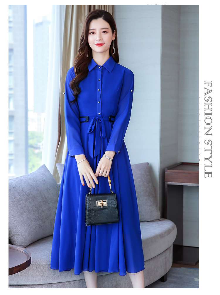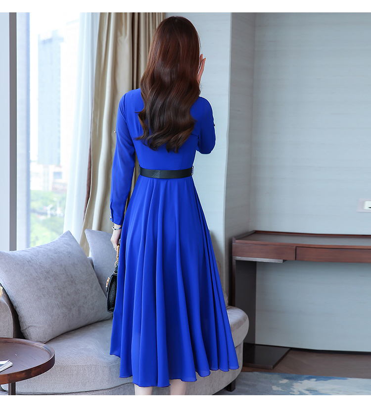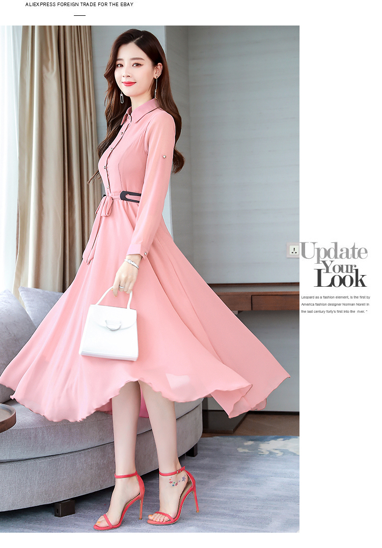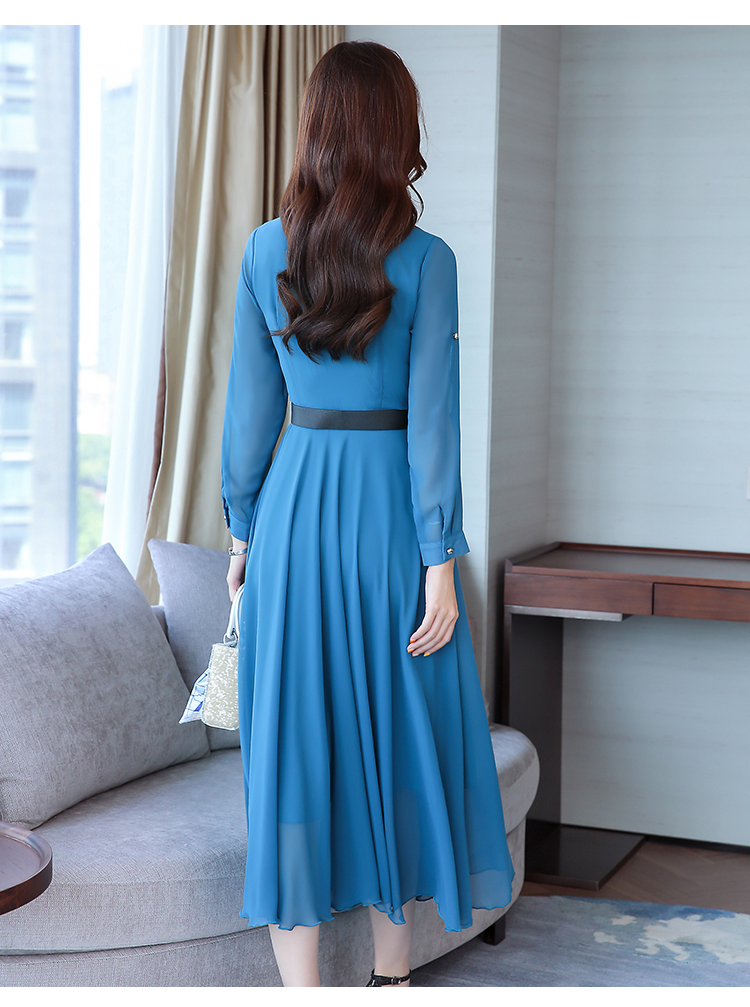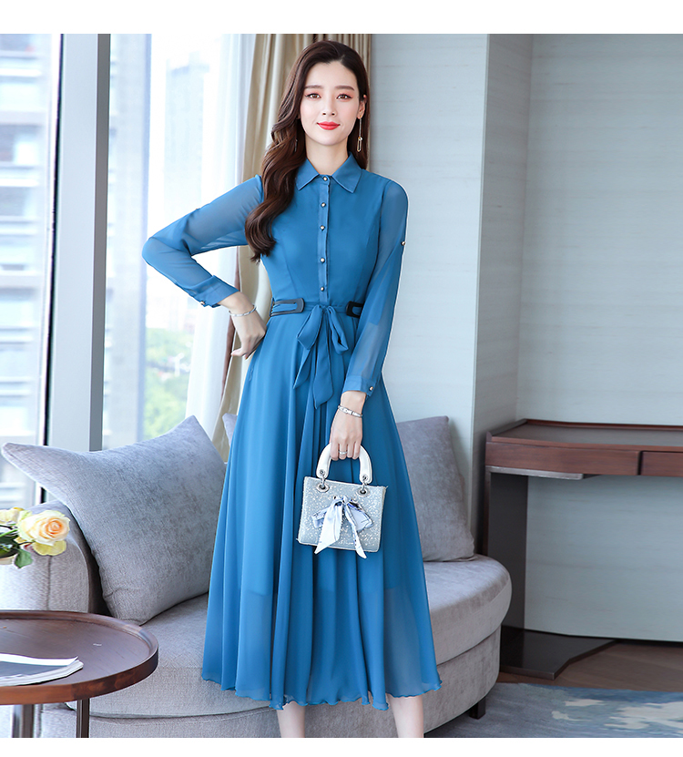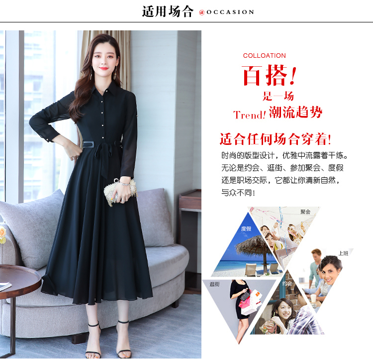 2019秋季新款韓版時尚優雅氣質通勤修身顯瘦中長款長袖雪紡連衣裙1入