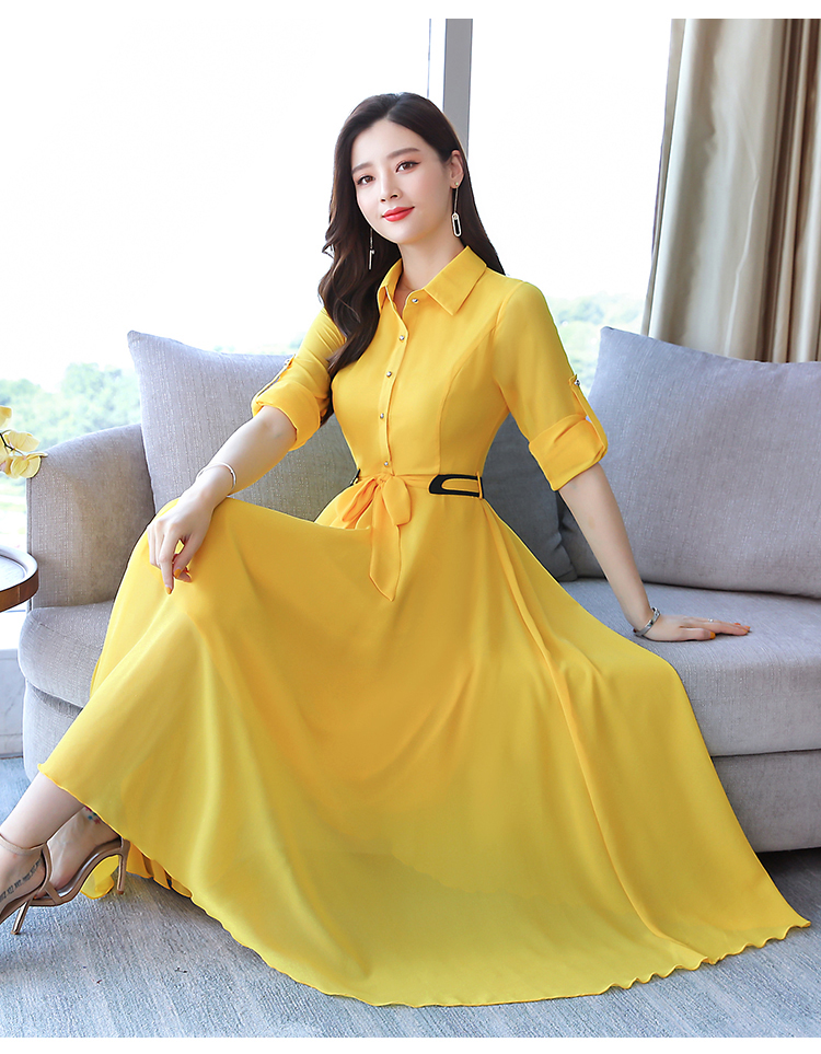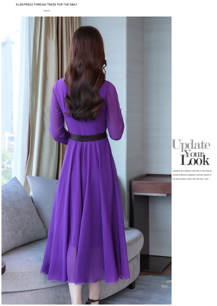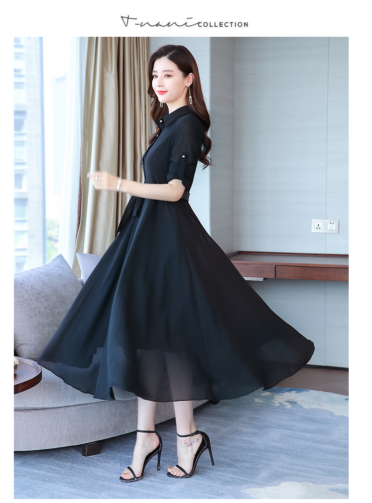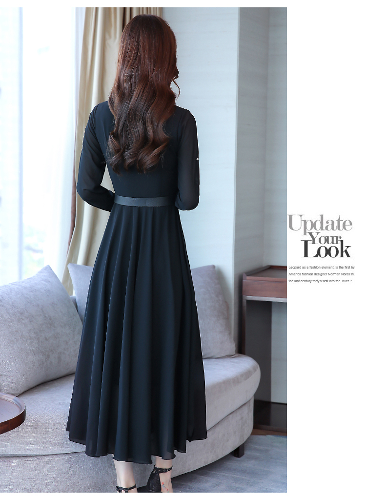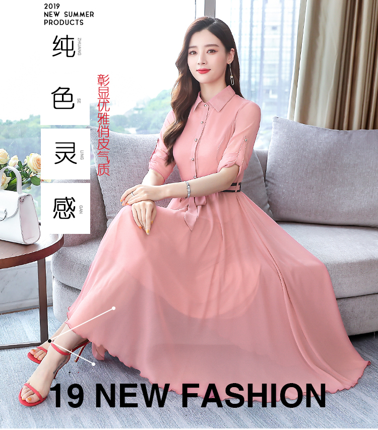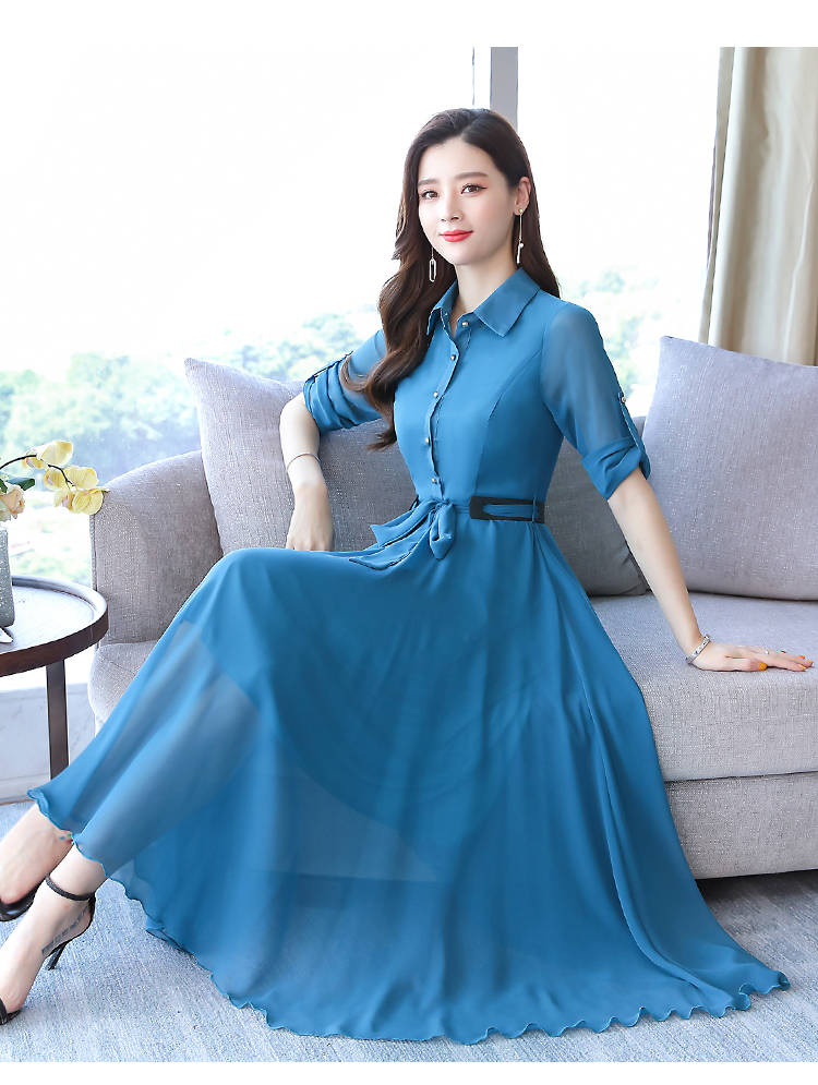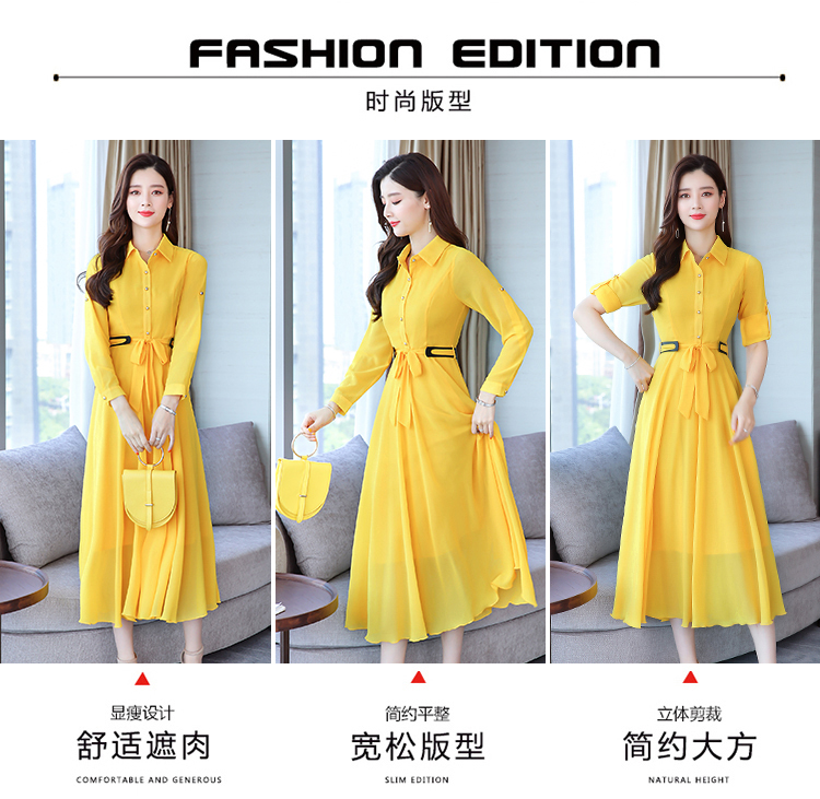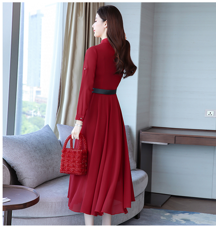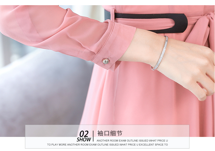 2019秋季新款韓版時尚優雅氣質通勤修身顯瘦中長款長袖雪紡連衣裙1入
